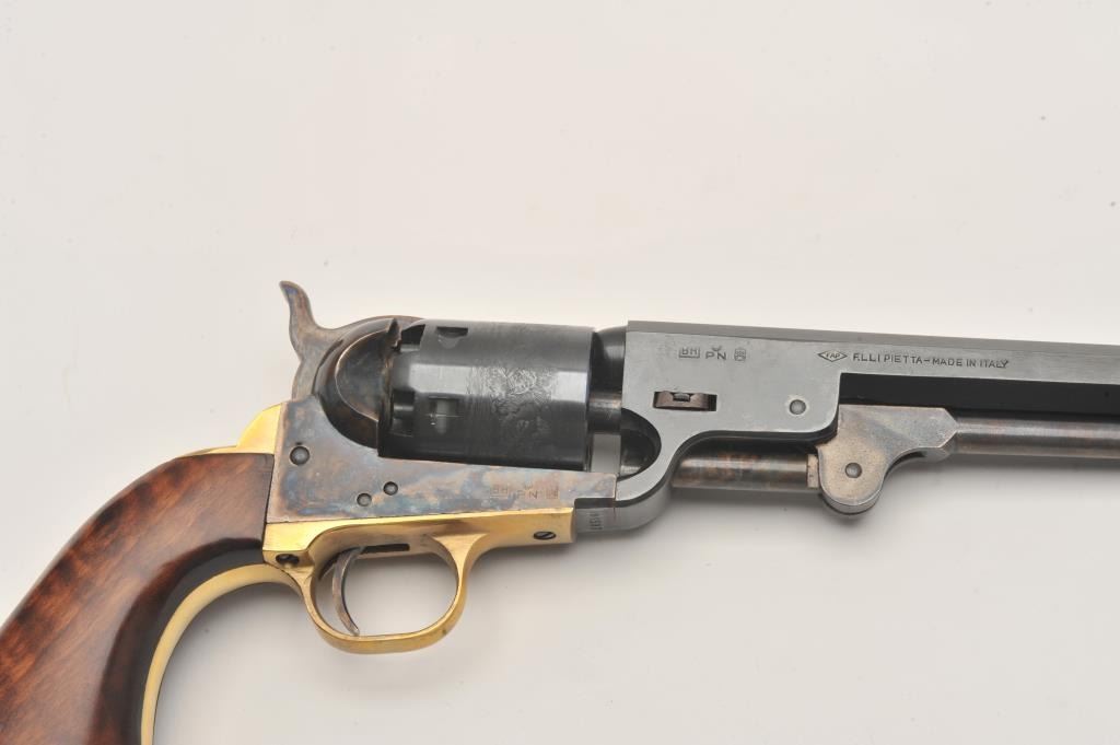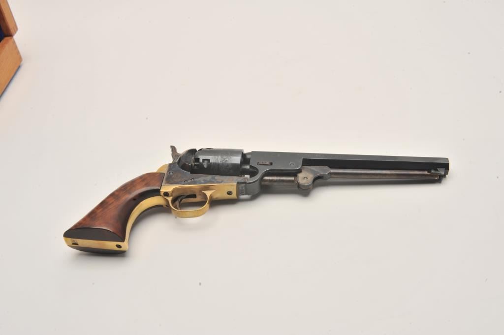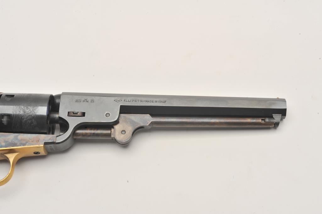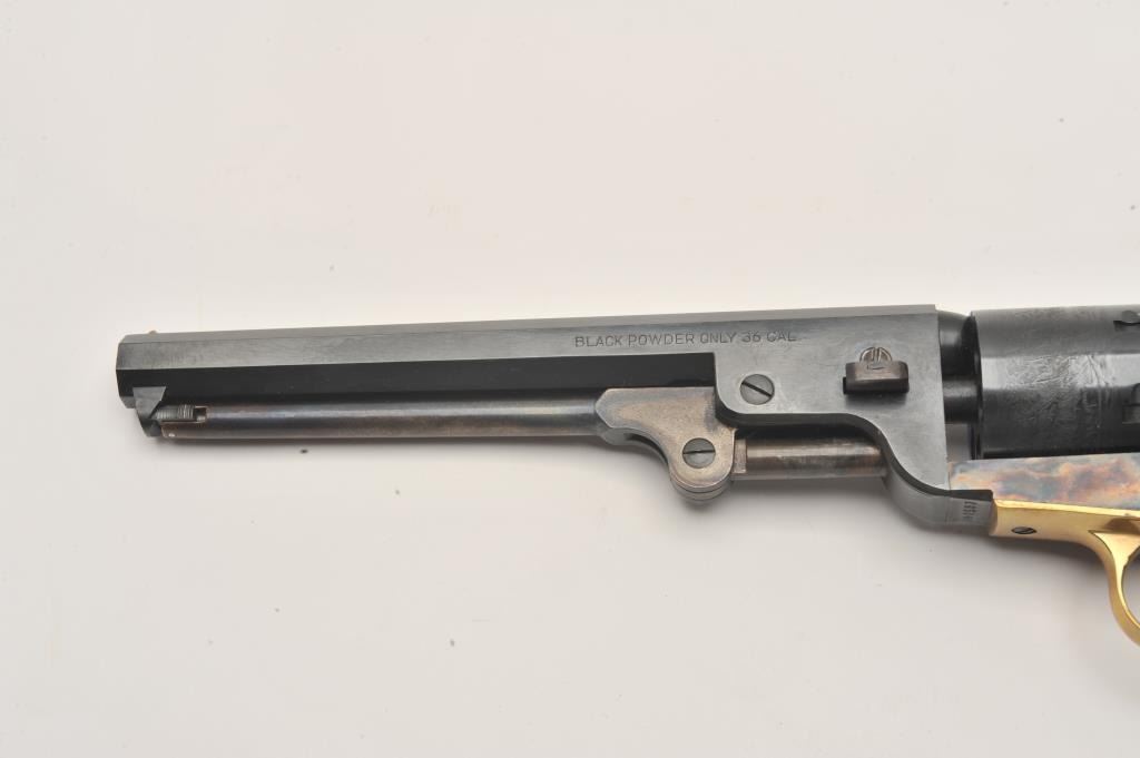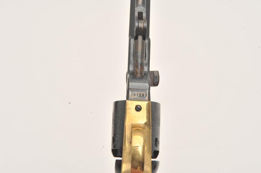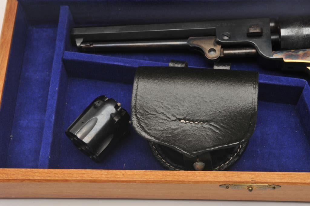 Italian Pietta reproduction 1851 Navy percussion revolver, .36 caliber, Serial #381597. The pistol is as new in a beautiful blue velvet lined, wood presentation case. The pistol retains nearly all of its deep Lot Title blue finish with a nicely case hardened frame. The smooth grips feature nice figure and finish. The lot includes a leather flap pouch and extra cylinder as well as the original cardboard factory box. Est.: Lot Title $200-$400.