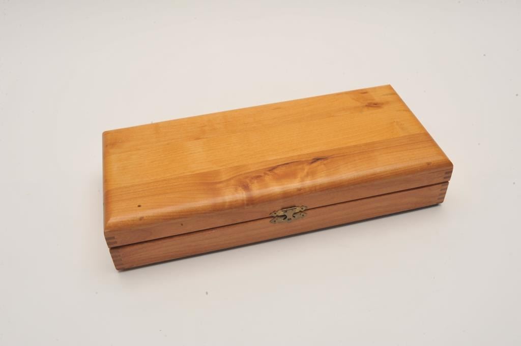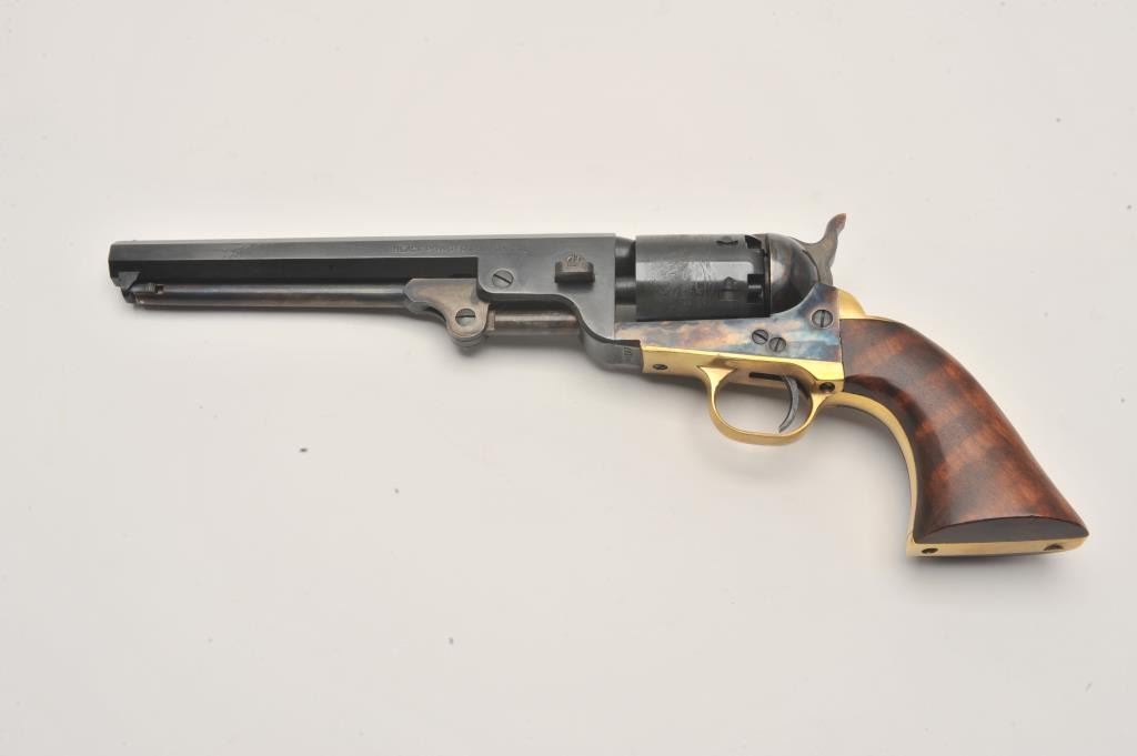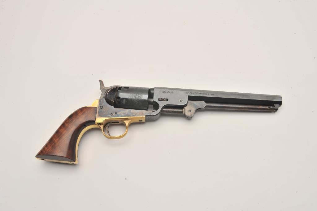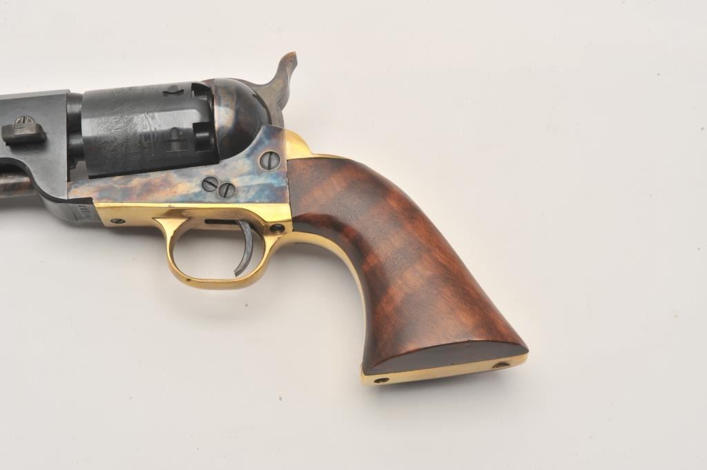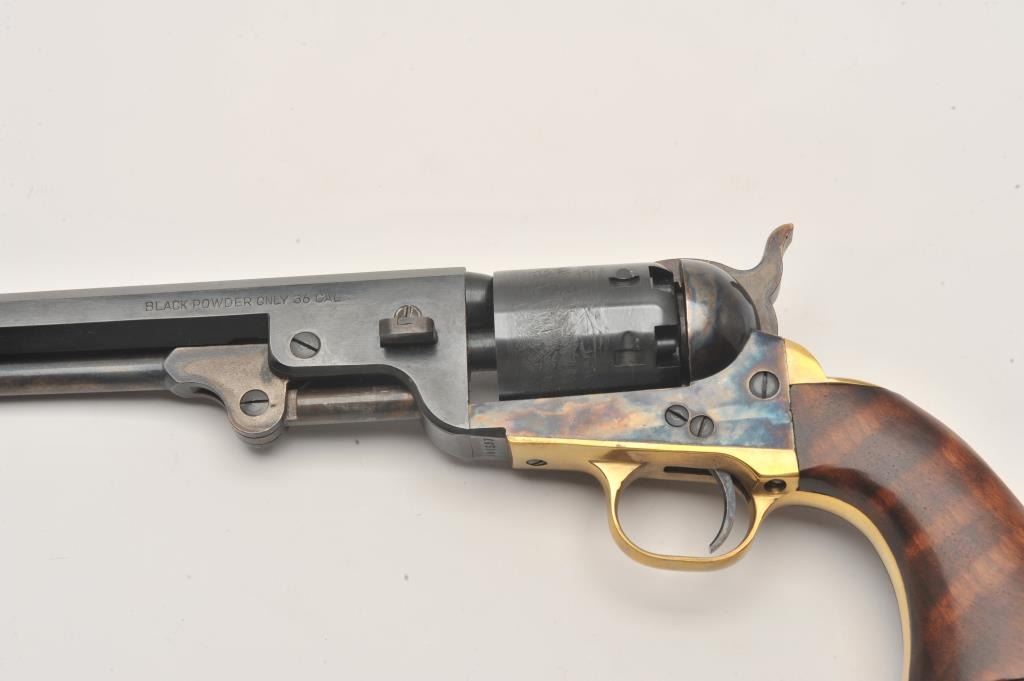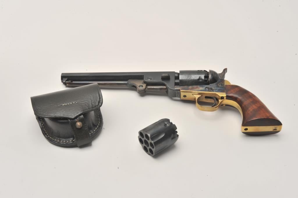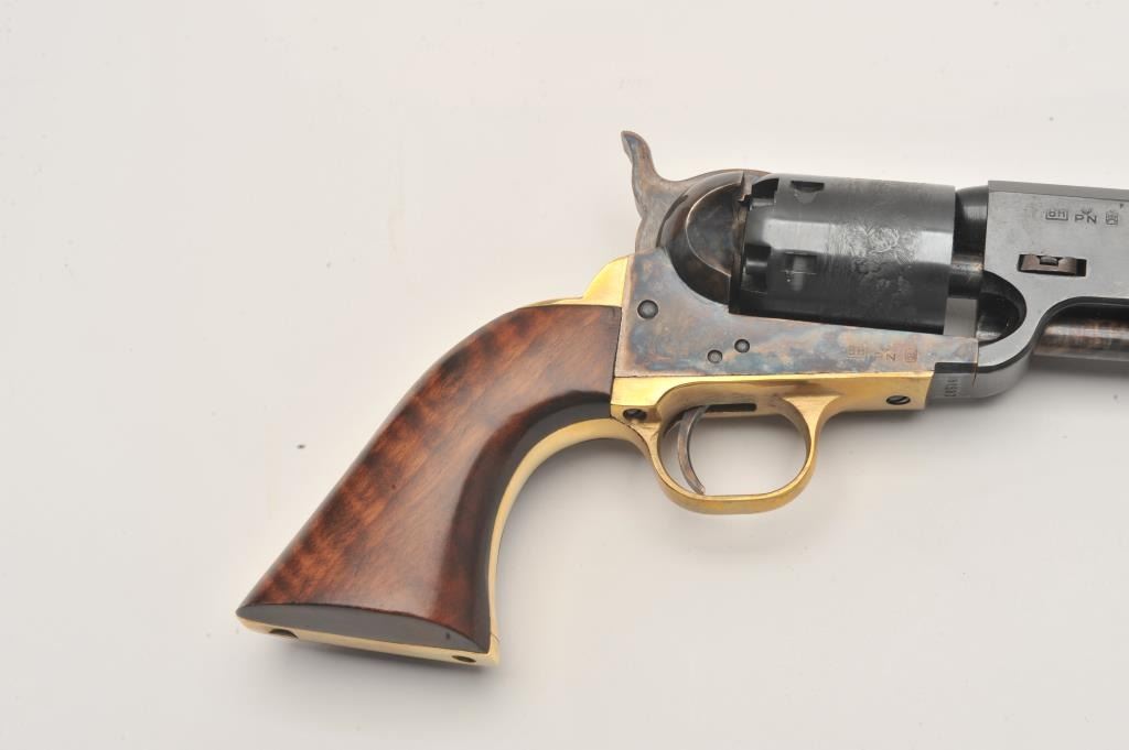 Italian Pietta reproduction 1851 Navy percussion revolver, .36 caliber, Serial #381597. The pistol is as new in a beautiful blue velvet lined, wood presentation case. The pistol retains nearly all of its deep Lot Title blue finish with a nicely case hardened frame. The smooth grips feature nice figure and finish. The lot includes a leather flap pouch and extra cylinder as well as the original cardboard factory box. Est.: Lot Title $200-$400.
