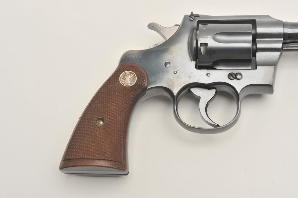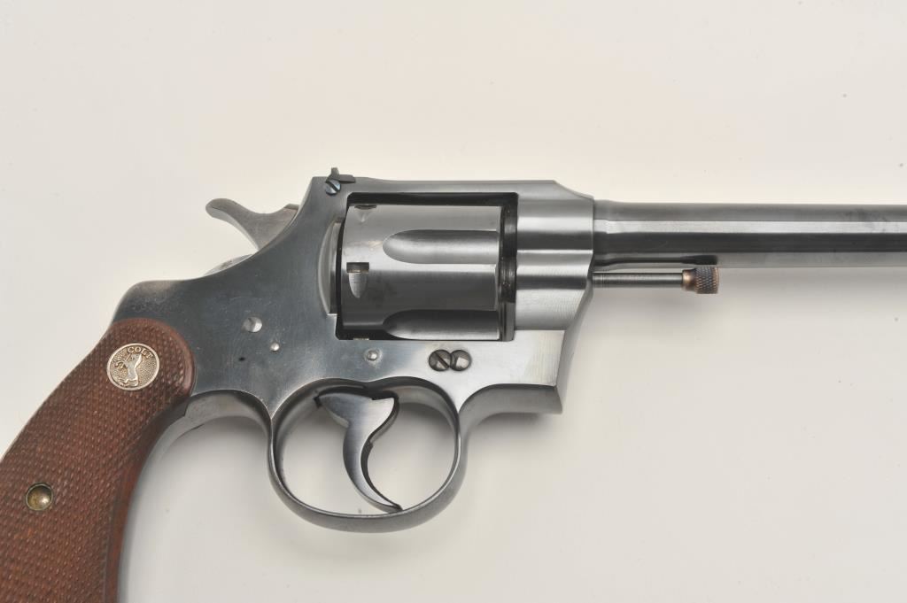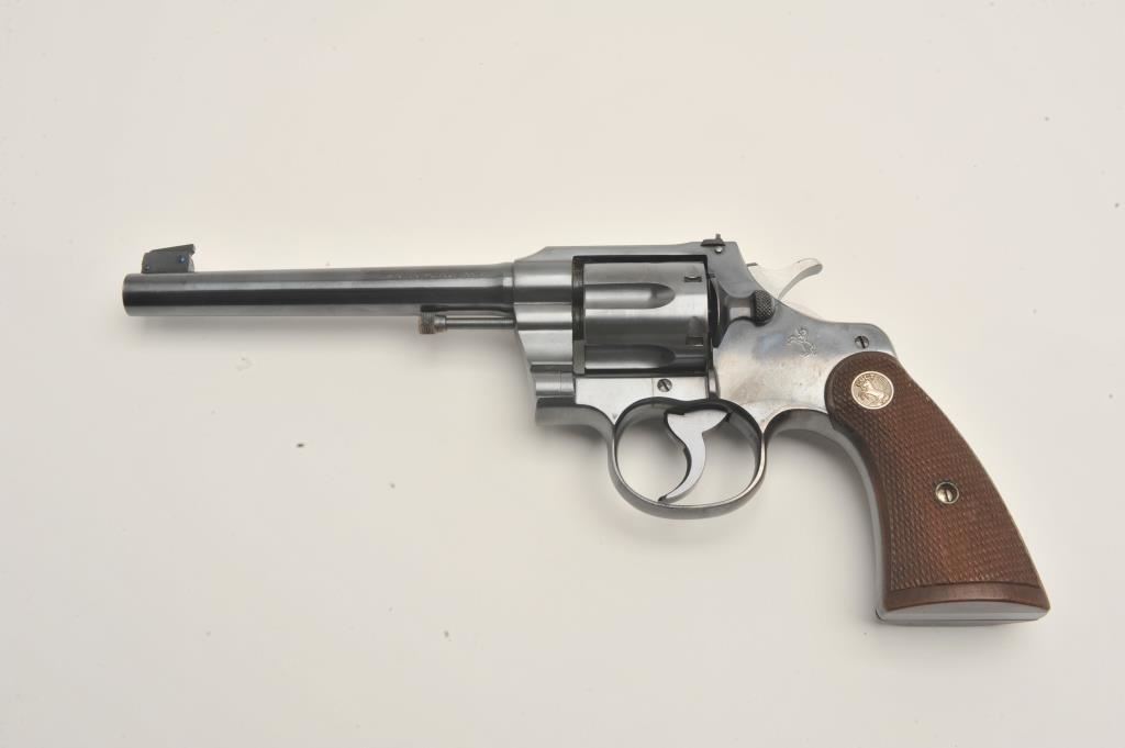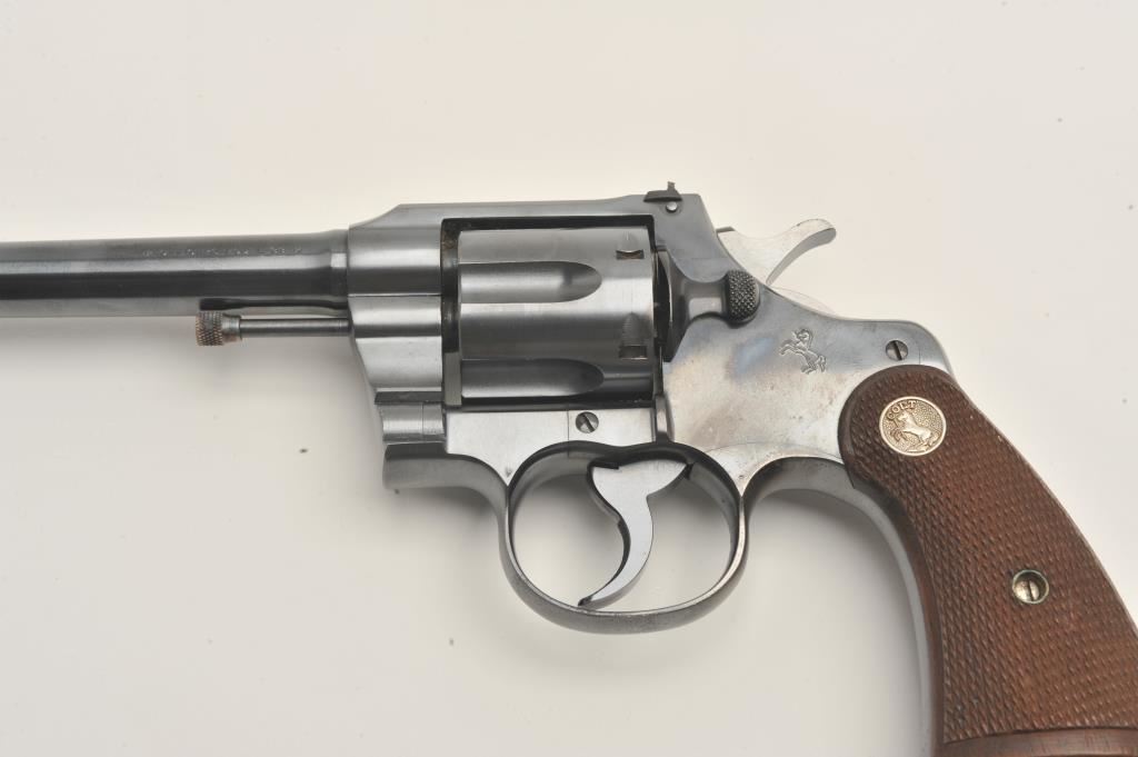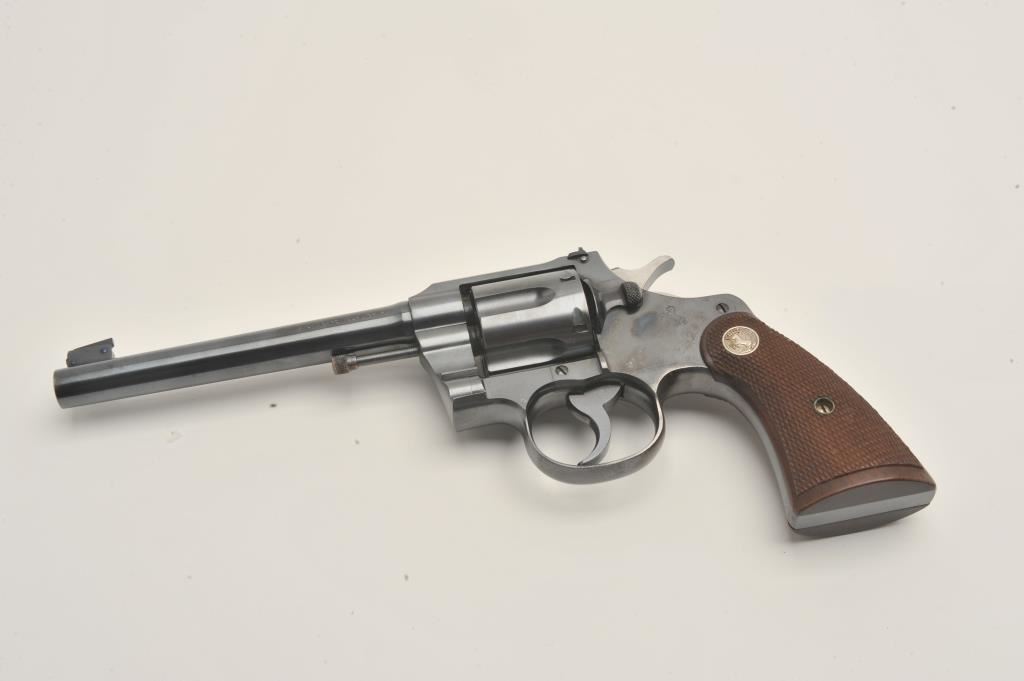 Colt Officers Model double action revolver, .38 caliber, Serial #529912. The pistol is in fine overall condition with a 6” barrel. The pistol retains nearly all of its blue finish with light wear at the muzzle and storage marks. The checkered wood silver medallion grips are in very good condition with sharp checkering and the grip strap is checkered. The bore is good, the action is crisp and the markings are sharp on this desirable flat top Officers Model Colt. Est.: $600-$1,200. (C+R).