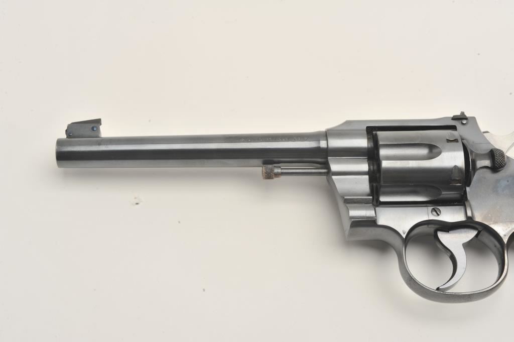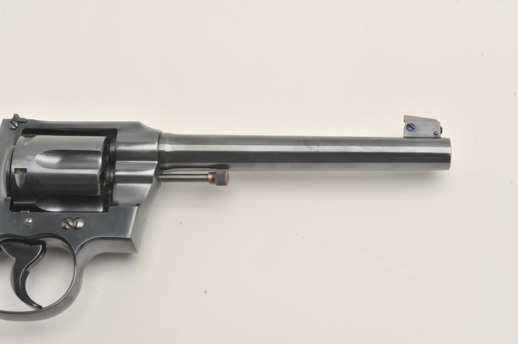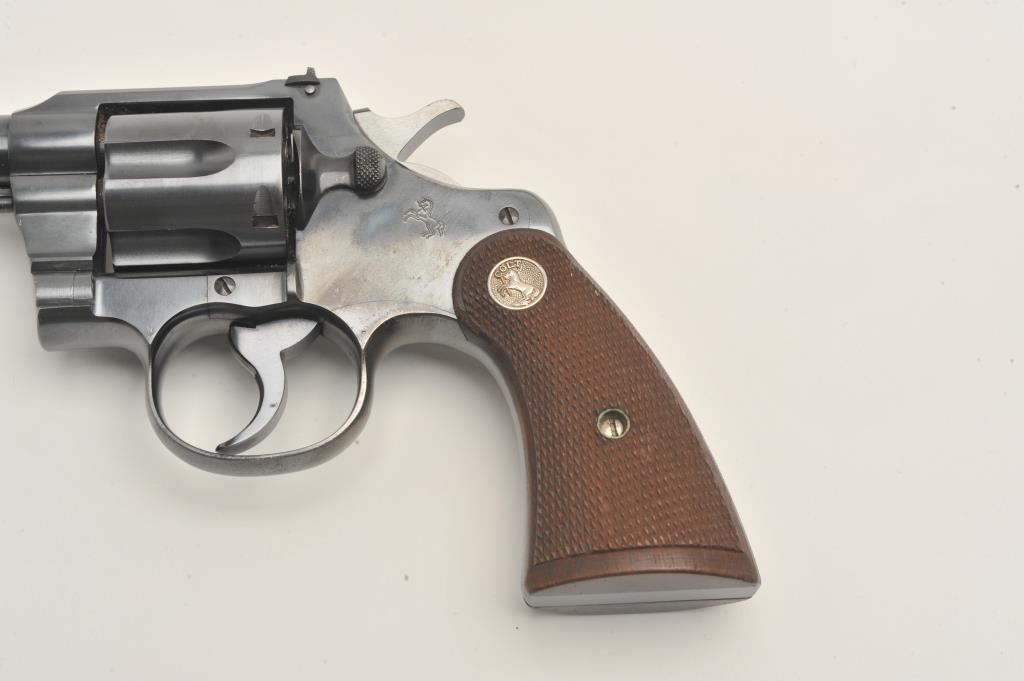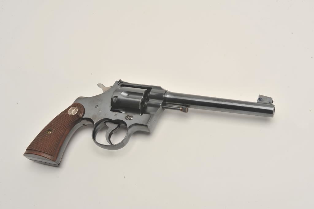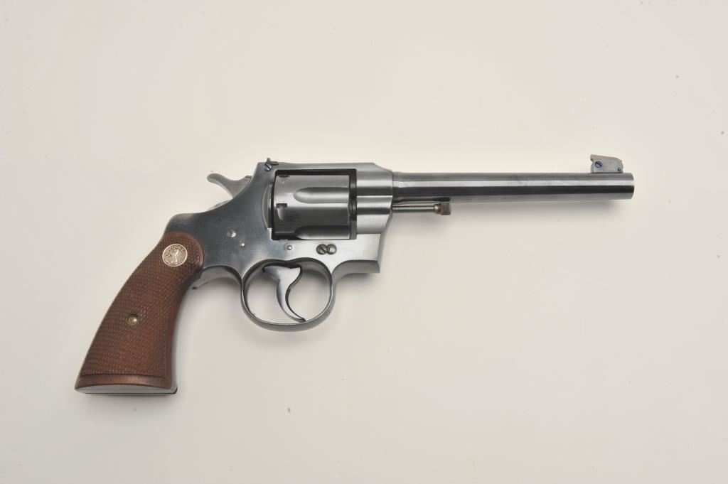 Colt Officers Model double action revolver, .38 caliber, Serial #529912. The pistol is in fine overall condition with a 6” barrel. The pistol retains nearly all of its blue finish with light wear at the muzzle and storage marks. The checkered wood silver medallion grips are in very good condition with sharp checkering and the grip strap is checkered. The bore is good, the action is crisp and the markings are sharp on this desirable flat top Officers Model Colt. Est.: $600-$1,200. (C+R).