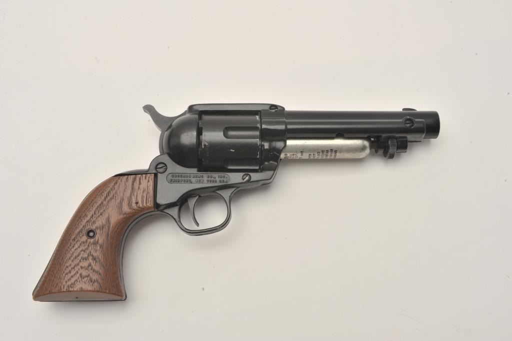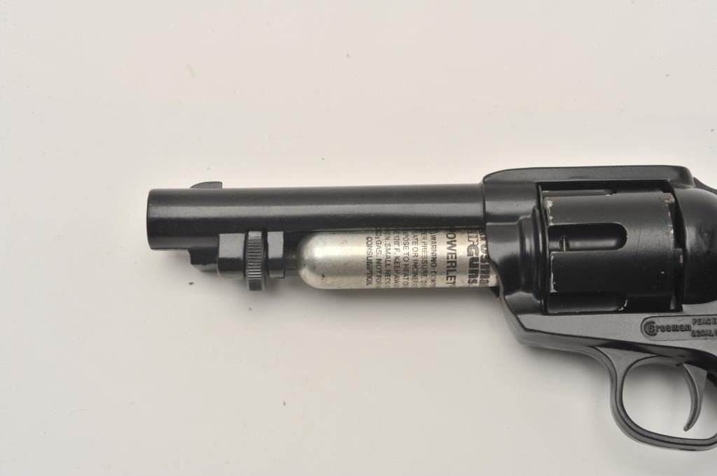 Crosman Peacemaker “44” CO2 pellet gun revolver, .22 caliber, Serial #NSNV. The pistol is in very good overall condition with a 4 ¾” barrel, black finish and plastic wood grain grips. The pistol is in the factorycardboard box. Est.: $50-$100.