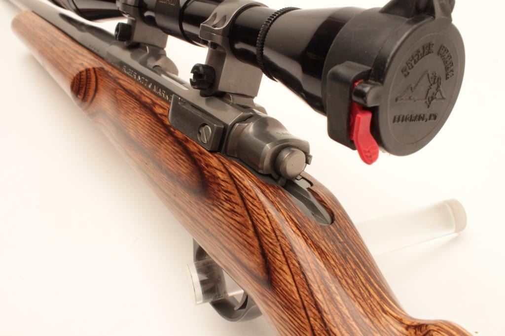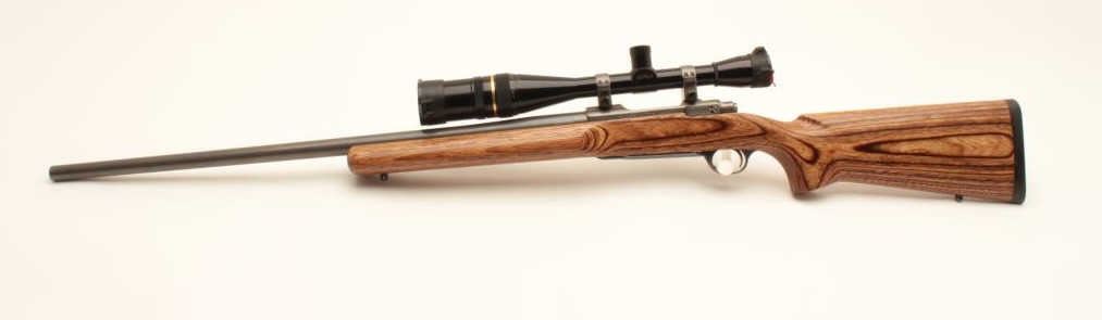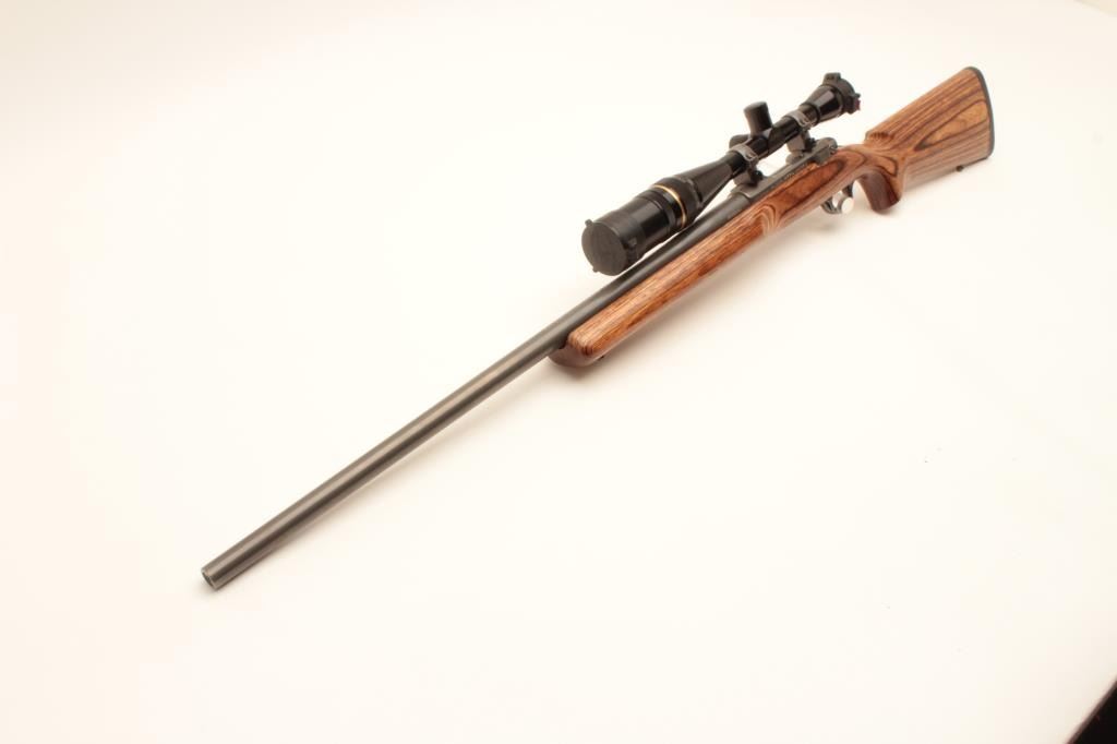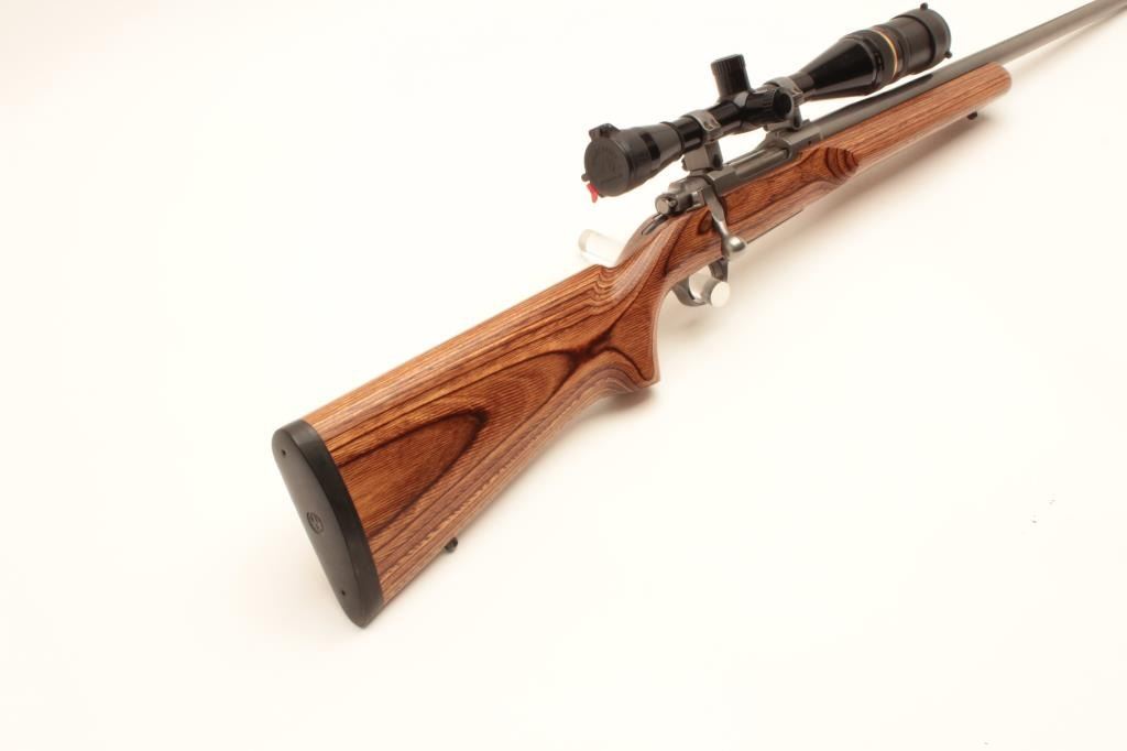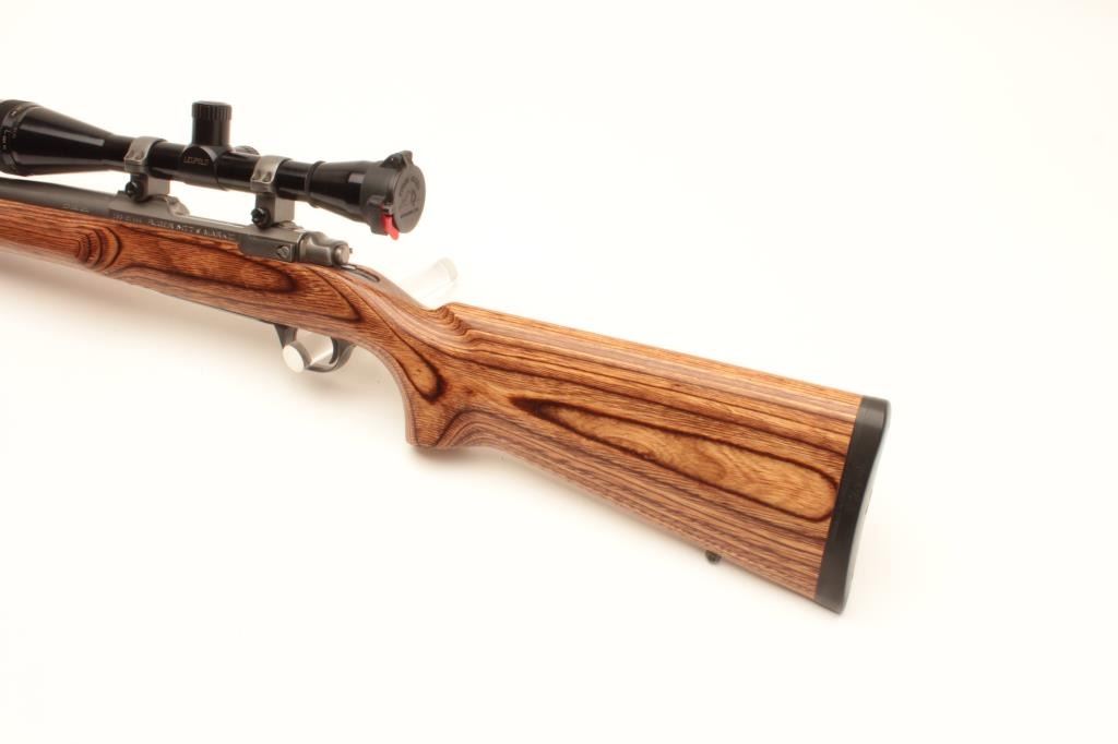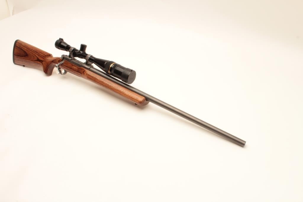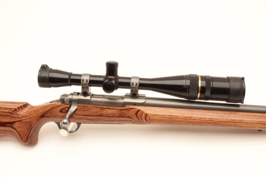 Ruger M77 MK. II bolt action rifle, .22-250 caliber, Serial #783-07444. The rifle is in very good overall condition with a 26” heavy bull barrel. The metal surfaces retain nearly all of their low glare stainless steel Lot Title finish. The smooth laminate target stock is in very good condition with small mars and compressions consistent with carry and use. The stock features a beaver tail fore end and ends with a solid rubber recoil pad. The Lot Title rifle is topped with Ruger rings and a Leupold BR-24 fixed power scope with an adjustable objective providing clear, crisp optics. Est.: $500-$1,000. (Modern).