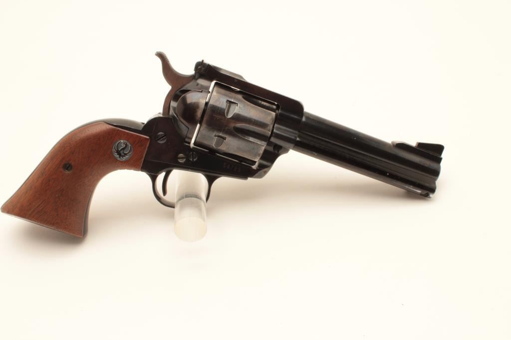 Ruger Black Hawk revolver, .357 Magnum caliber, Serial #54729. The pistol is in good overall condition with a 4 ½” barrel with ramp front and adjustable rear sights. The metal surfaces retain the majority of Lot Title their blue finish with holster wear at the muzzle and a drag line with thinning blue on the cylinder. The smooth wood medallion grips are in good condition with small mars and compressions. The bore is good, the Lot Title action crisp and markings are sharp on this early Black Hawk without the transfer bar. Est.: $300-$600. (Modern).