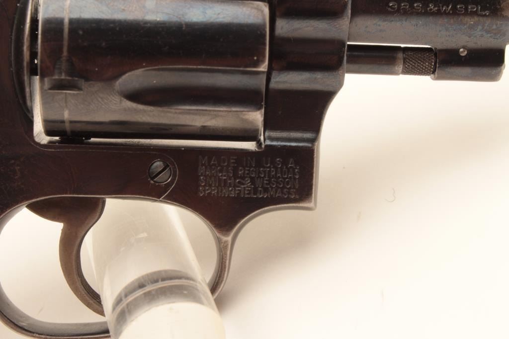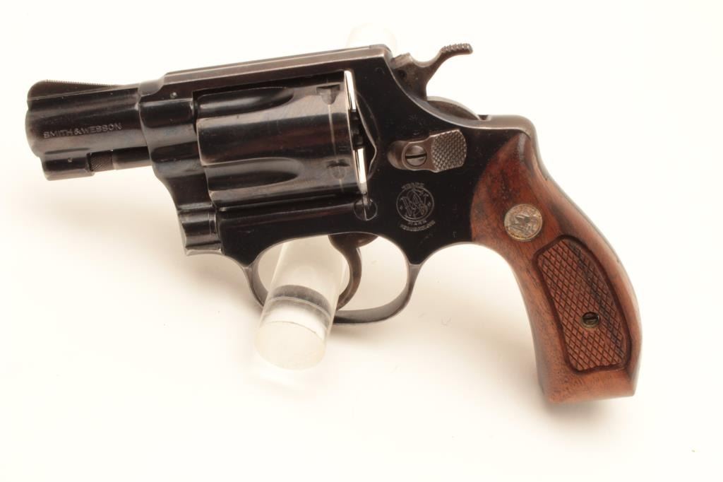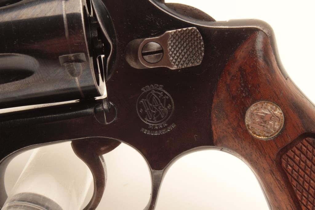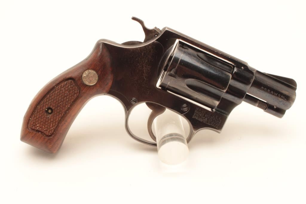 Early Smith & Wesson Model 36 revolver, .38 caliber, Serial #51J638. The pistol is in very good overall condition with a 2” barrel. The metal surfaces retain the majority of their blue finish with holster wear at the Lot Title muzzle and a drag line on the cylinder. The hammer and trigger show old, muted case hardening. The checkered wood medallion grips are in very good condition with small mars from carry and use. The bore is good, Lot Title the action crisp and markings are sharp on this early, flat latch Chief’s Special. Est.: $300-$600. (C+R).