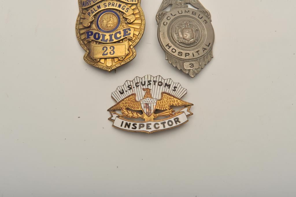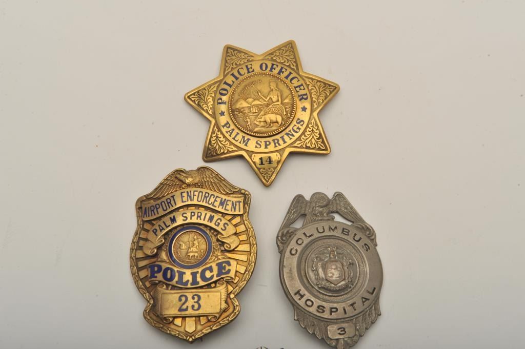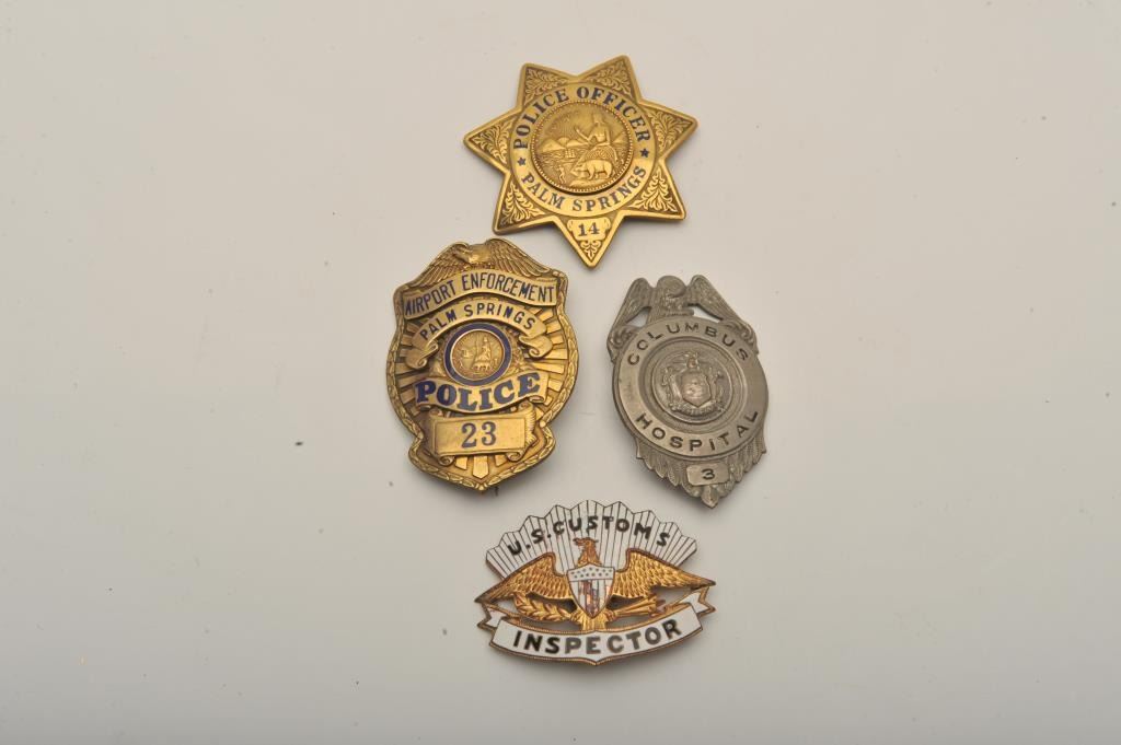 Lot of 4 badges including a 7-point star pin badge marked Police Officer Palm Springs (Calif.) (#14/hallmark L.A. Stamp & Staty Co.), a pin shield badge marked Airport Enforcement/Palm Springs (Calif.) Police(#23), a U.S. customs Inspector cap badge (#5426 on reverse) and a pin shield badge marked Columbus Hospital (#3). Est.: $150-$300.