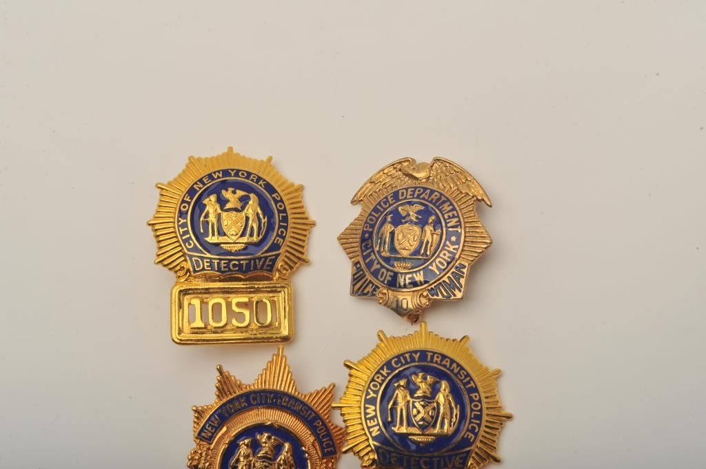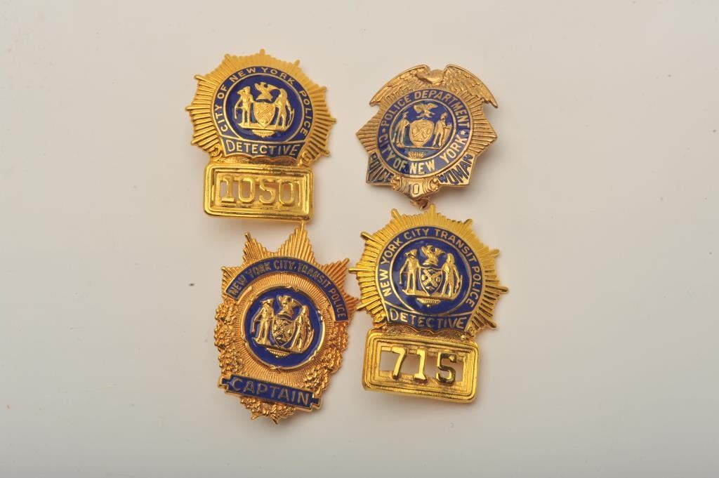Lot of 4 badges including a City of New York Police Dept. Policewoman #10 pin shield badge, a New York City Transit Police Captain cap badge, a New York City Transit Police Detective #715 cap badge and a City of NewYork Police Detective #1050 cap badge. Est.: $200-$400.