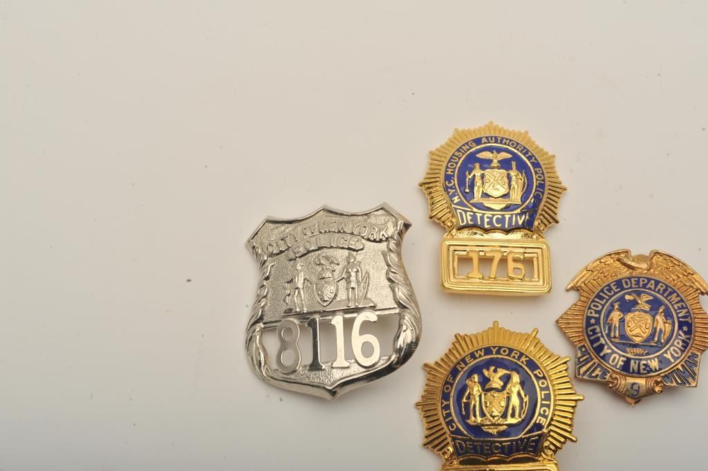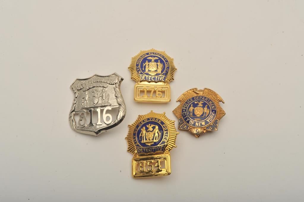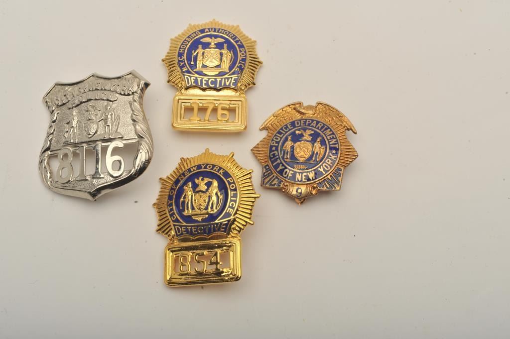 Lot of 4 badges including a N.Y.C. Housing Authority Police Detective pin shield badge #176, a City of New York Police Dept. Police Woman pin shield badge #9, a City of New York Police Detective cap badge #854 and a Cityof New York Police cap badge #8116. Est.: $200-$400.