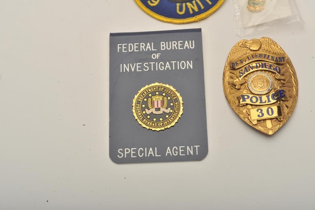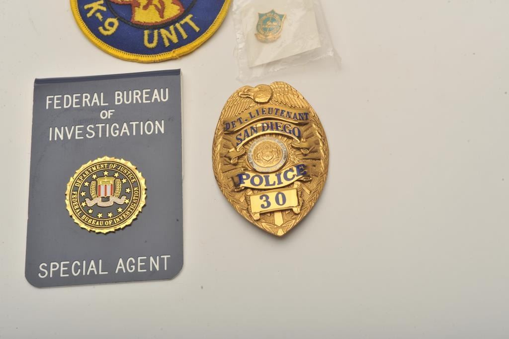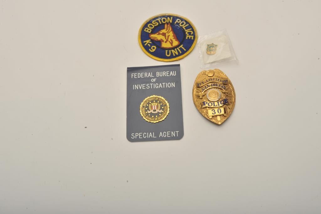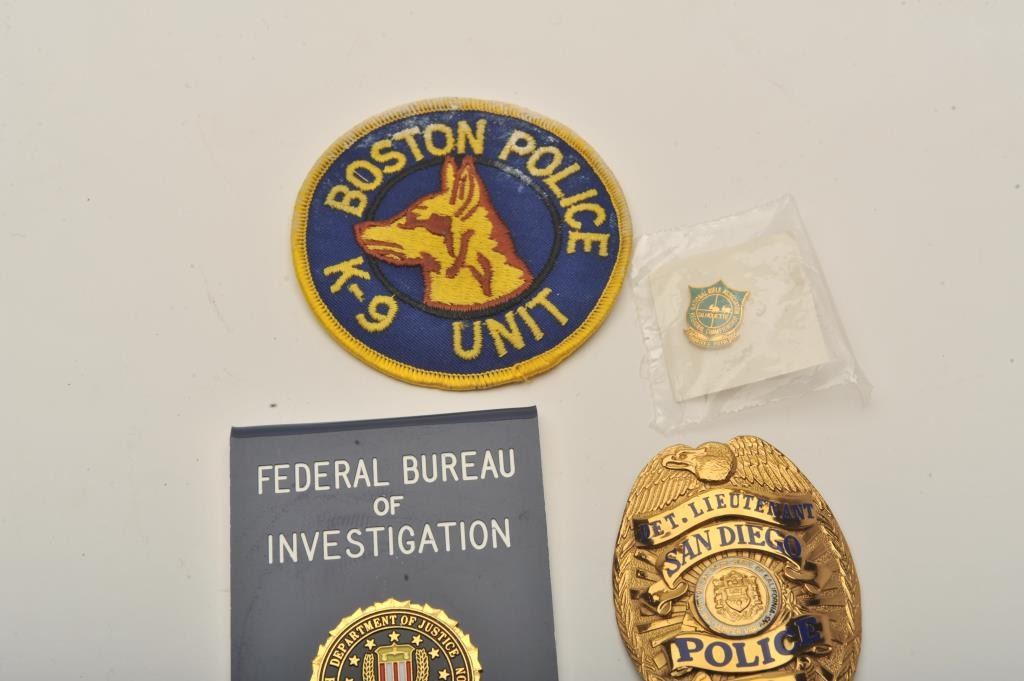 Misc. lot including a Det. Lieutenant San Diego (Calif.) Police pin shield badge #30 (hallmark L.A. Stamp & Staty. Co.), a Federal Bureau of Investigation Special Agent pocket ID, a Boston Police K-9 Unit woven uniformpatch and a small NRA 1990 hunter’s pistol Regional Silhouette Championship commemorative pin. Est.: $150-$300.
