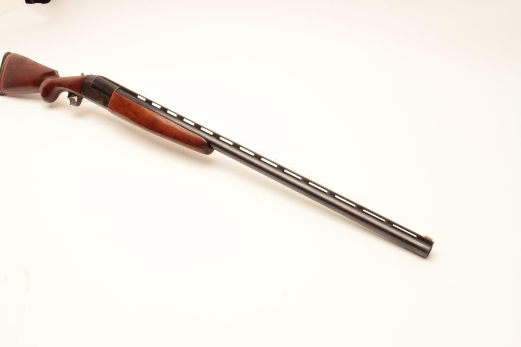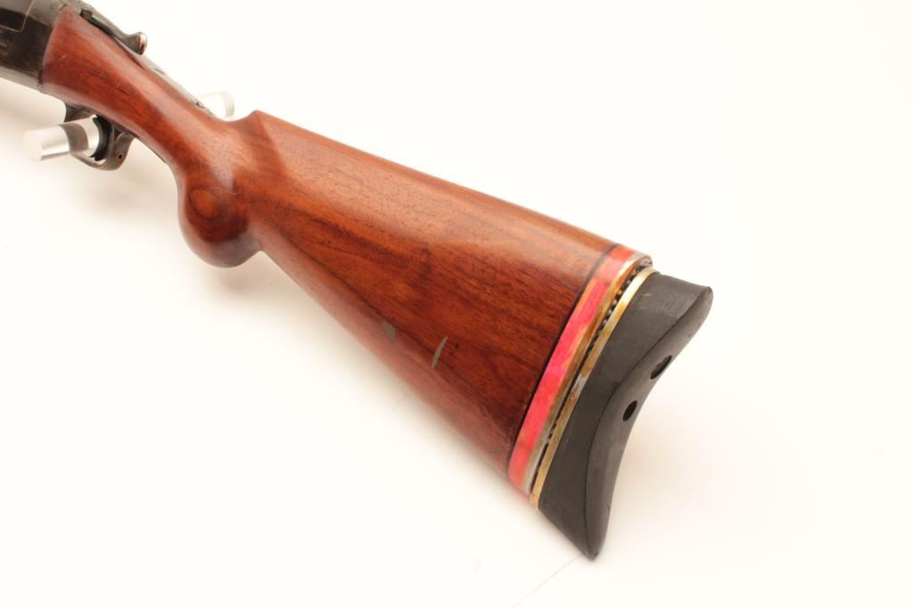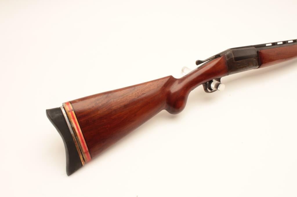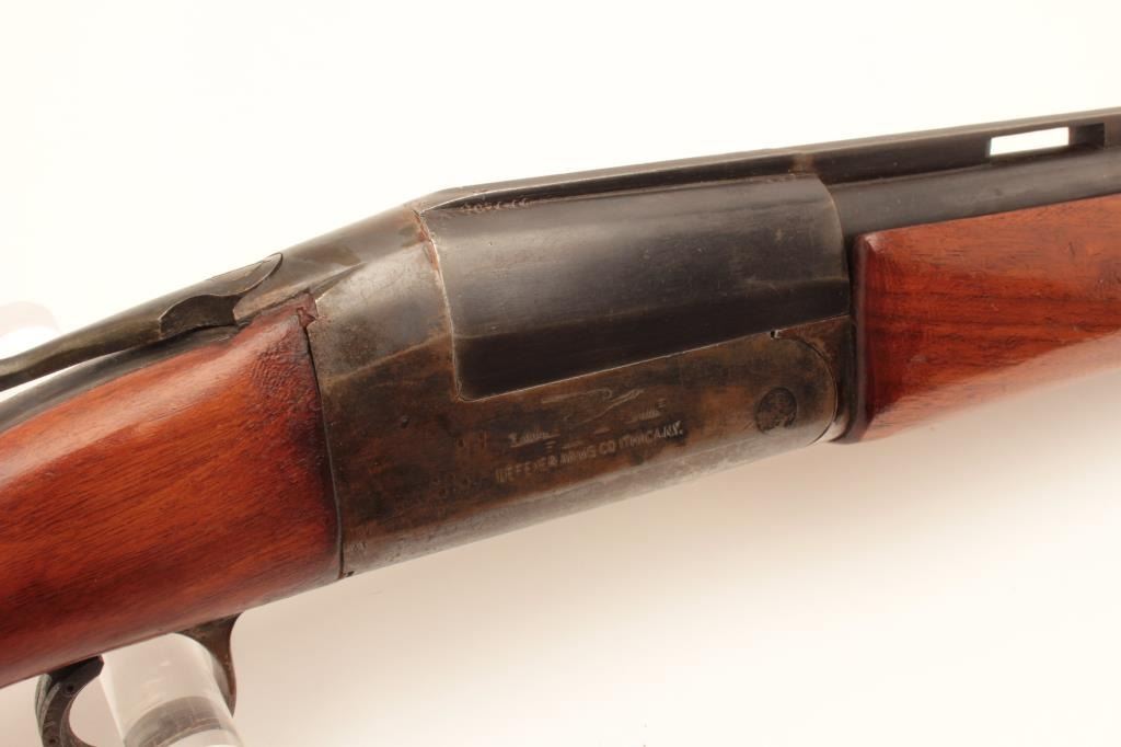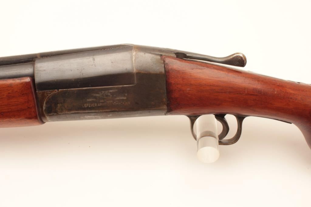 LeFever Arms single shot trap shotgun, 12 gauge, Serial #20203. The shotgun is in good overall condition with a 32” barrel with a Hi-Viz front sight and full-length ventilated rib. The barrel and rib retain the majority Lot Title of their muted blue finish with the receiver showing old, toning case hardening. The smooth wood stocks are in good condition with mars and compressions consistent with use. The butt stock has a round knob pistol grip Lot Title and ends with rubber pad providing a 14” LOP. The bore is good, the action crisp and markings are legible. Est.: $350-$700. (Modern).