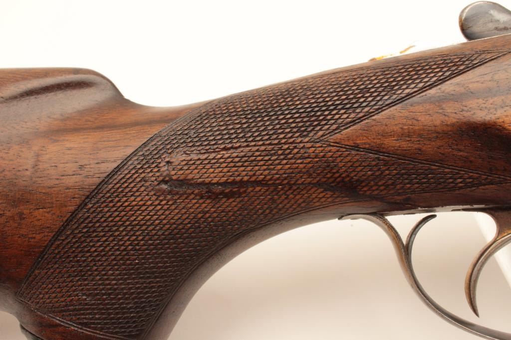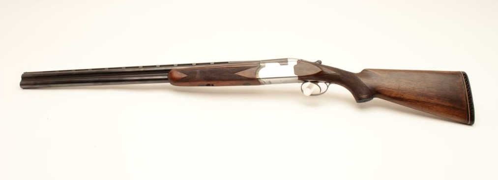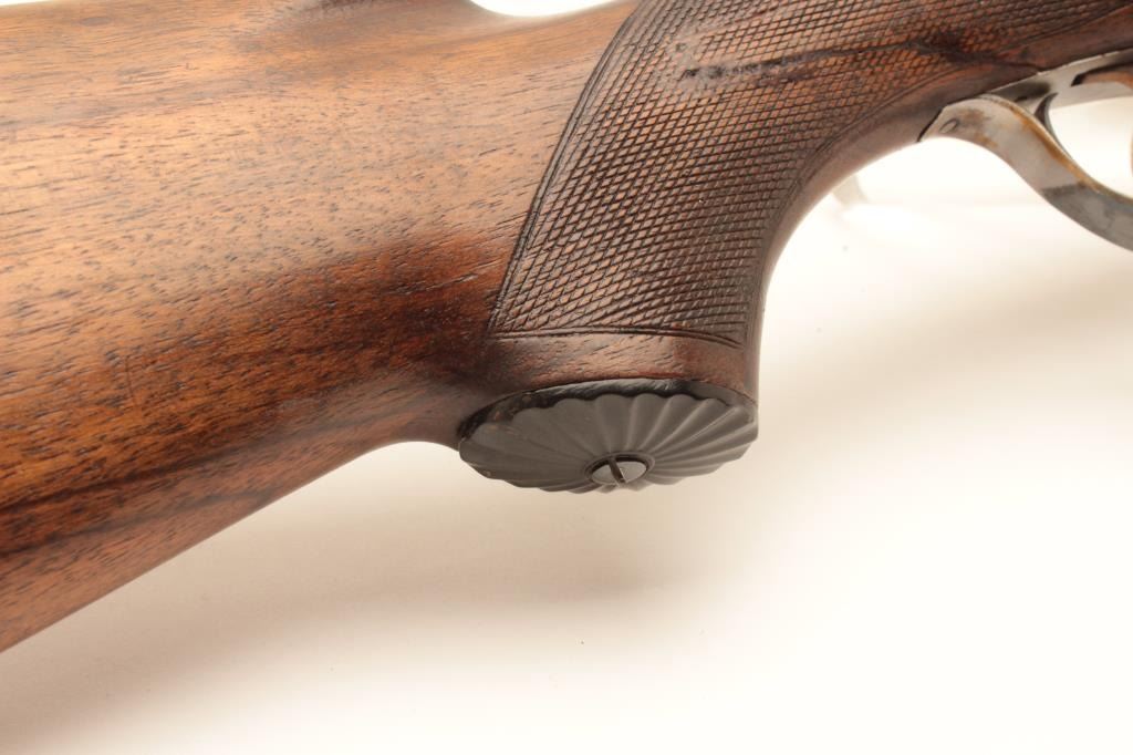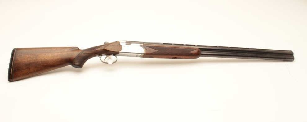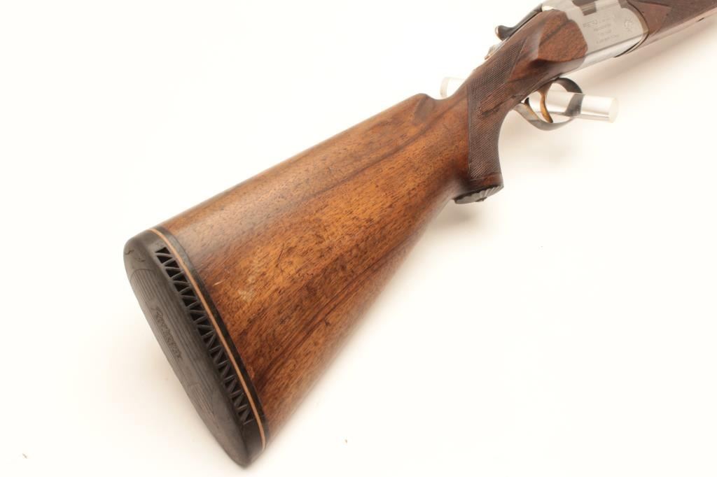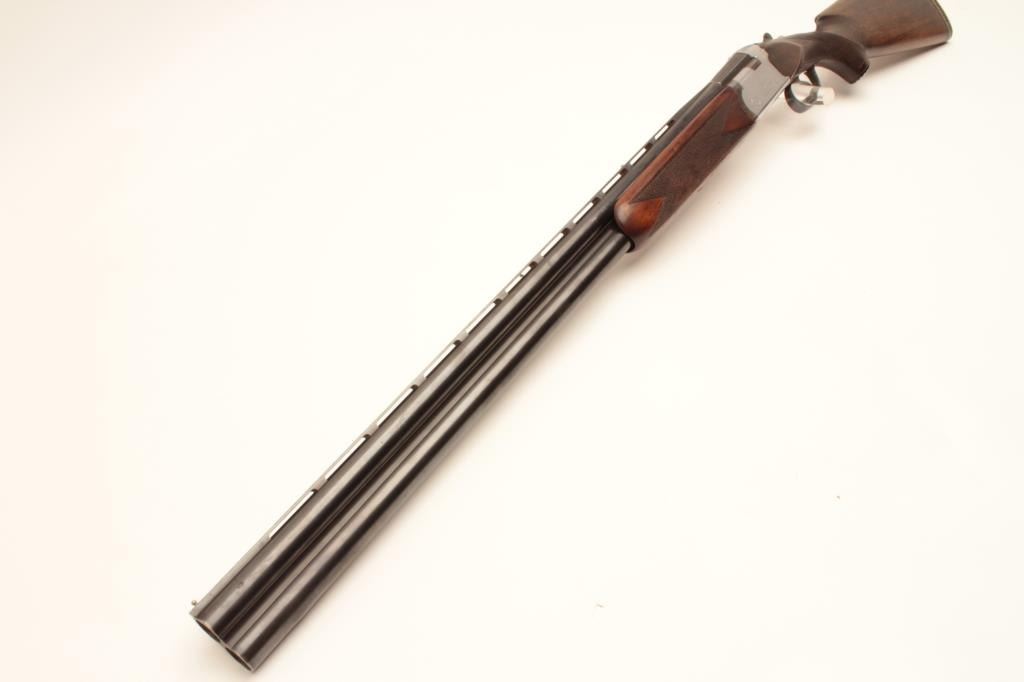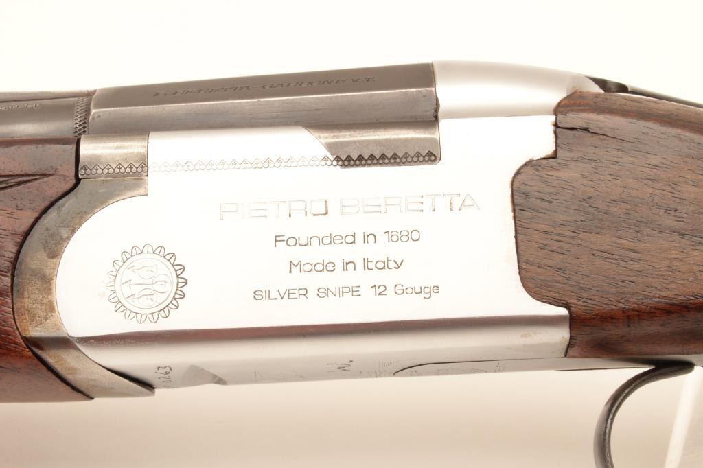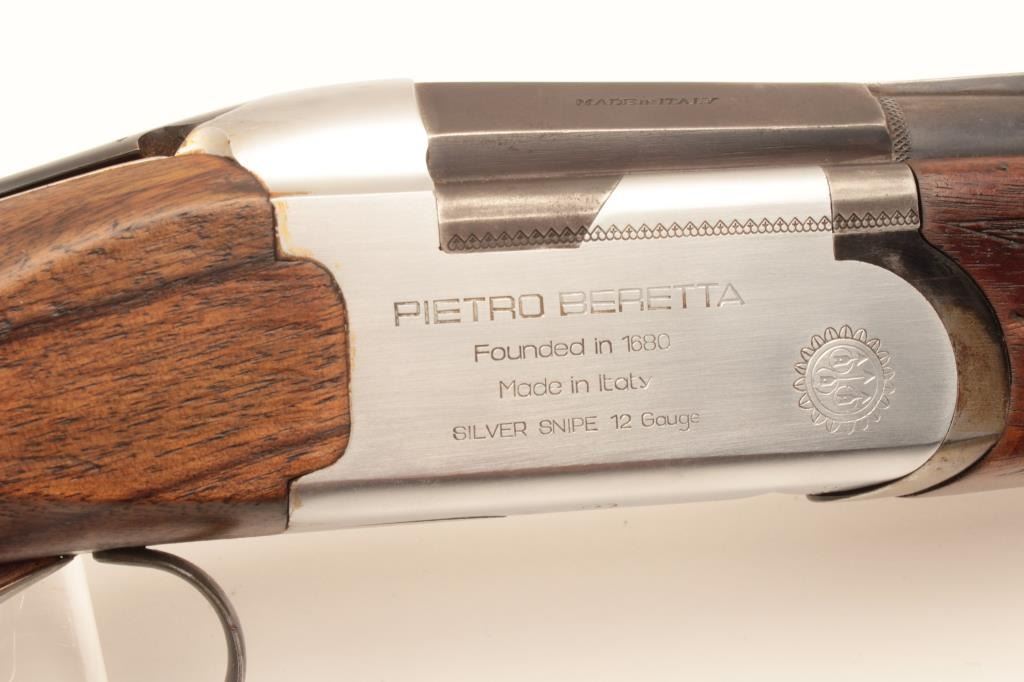 Pietro Beretta Silver Snipe O/U shotgun, 12 gauge, Serial #14620. The shotgun is in good overall condition with 27 ½” barrels with a steel bead front sight and full-length ventilated rib. The barrels retain the Lot Title majority of their blue finish with muzzle wear and a slight bulge evident in the bottom barrel at the muzzle. The receiver is matte finished stainless with a Social Security number and the initials MW, engraved into the Lot Title bottom of the action in electric pencil. The checkered wood stocks show moderate use with mars and compressions. The butt stock ends with a Pachmayr ventilated rubber pad providing a 14” LOP to the single trigger. Lot Title The bores are good, the action crisp and the markings are legible. Est.: $500-$1,000. (Modern).