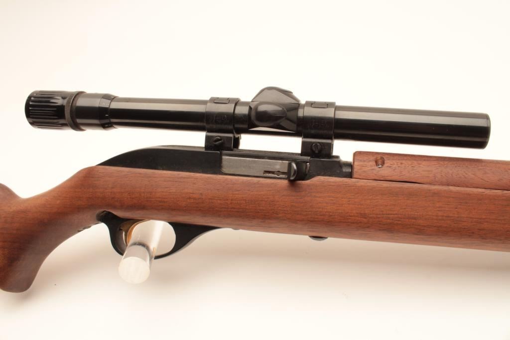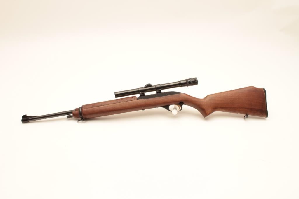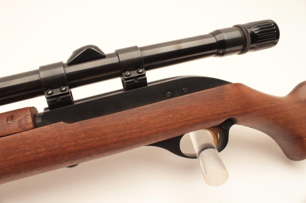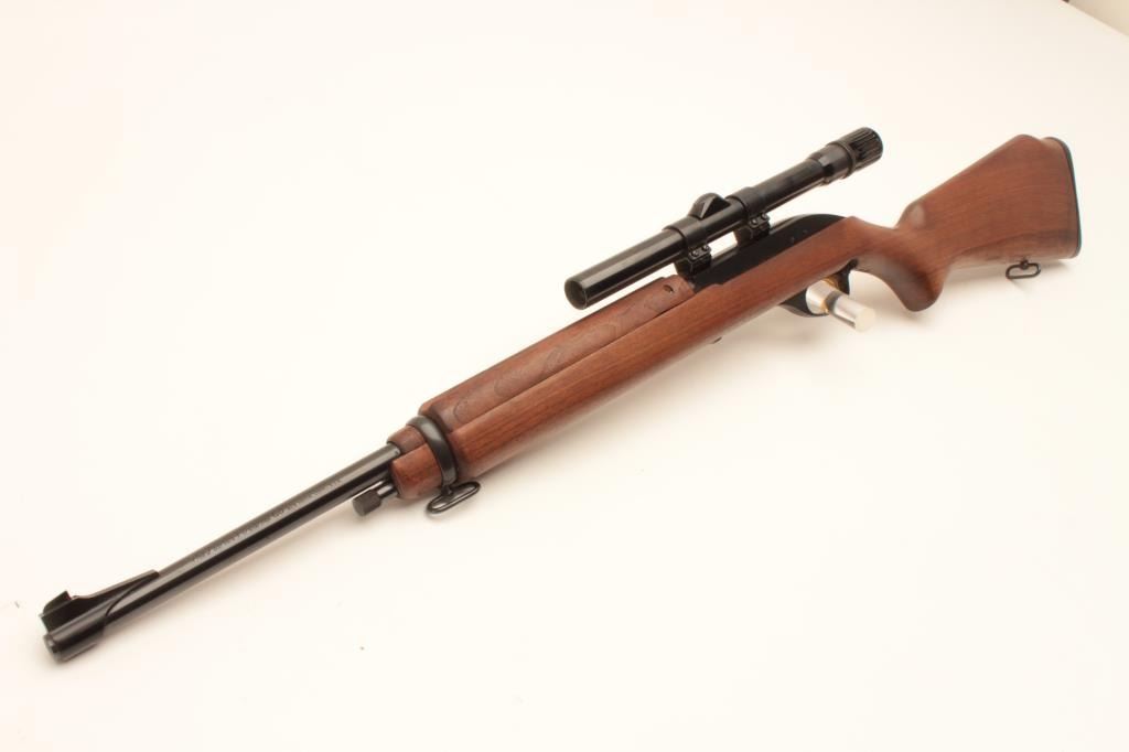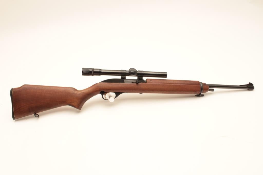 Marlin Model 99 M-1 semi-automatic rifle, .22 LR caliber, Serial #NSNV. The rifle is in fine overall condition with an 18” barrel. The barrel and receiver retain nearly all of their blue finish with only light muzzle wear Lot Title noted. The smooth wood stock is in very good condition with only handling marks. The butt ends with a plastic Marlin marked butt plate. The rifle is topped with Weaver mounts and a Weaver V22 fixed power scope. The bore Lot Title is good, the action crisp and markings are sharp on this Marlin .22 based on an M1 carbine. Est.: $200-$400. (Modern).