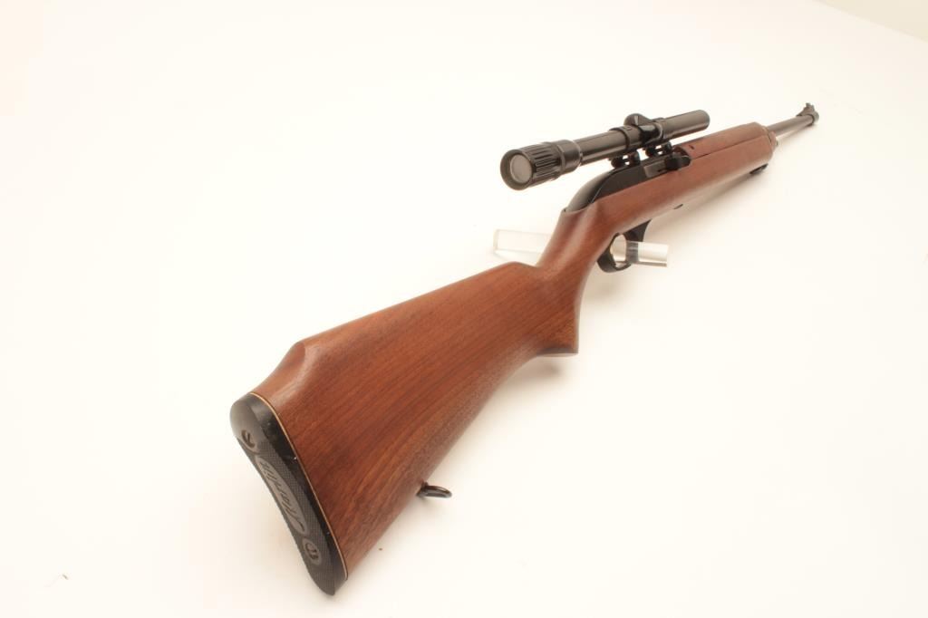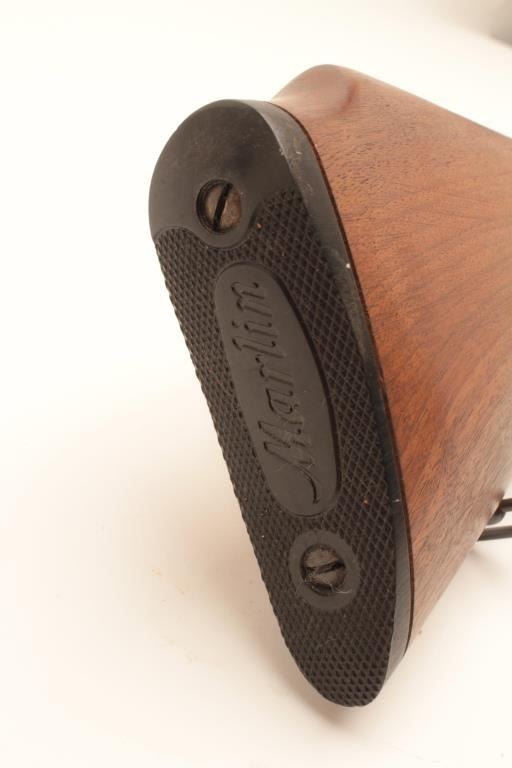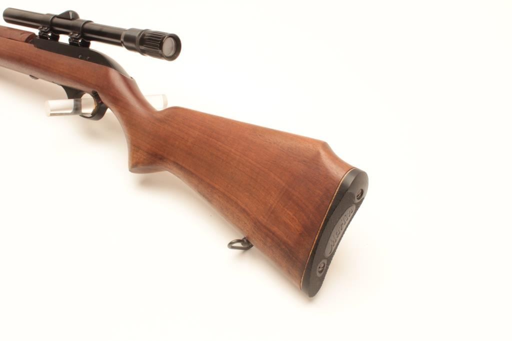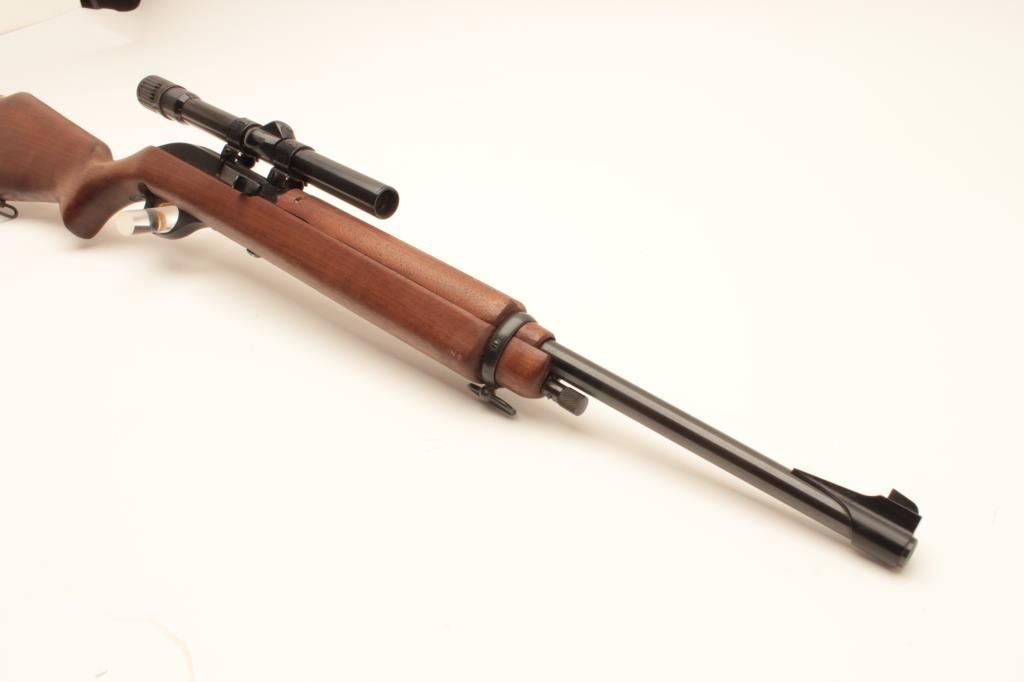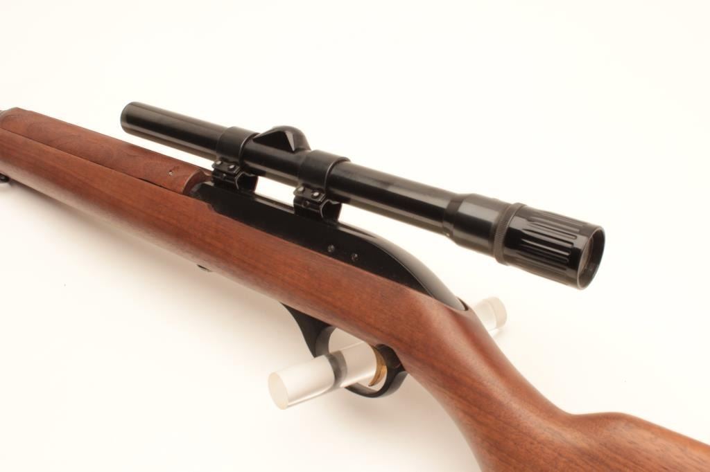 Marlin Model 99 M-1 semi-automatic rifle, .22 LR caliber, Serial #NSNV. The rifle is in fine overall condition with an 18” barrel. The barrel and receiver retain nearly all of their blue finish with only light muzzle wear Lot Title noted. The smooth wood stock is in very good condition with only handling marks. The butt ends with a plastic Marlin marked butt plate. The rifle is topped with Weaver mounts and a Weaver V22 fixed power scope. The bore Lot Title is good, the action crisp and markings are sharp on this Marlin .22 based on an M1 carbine. Est.: $200-$400. (Modern).