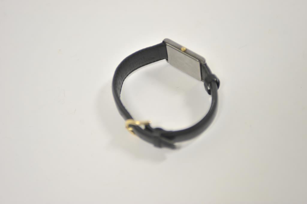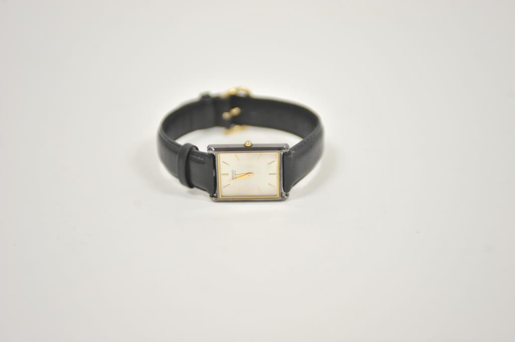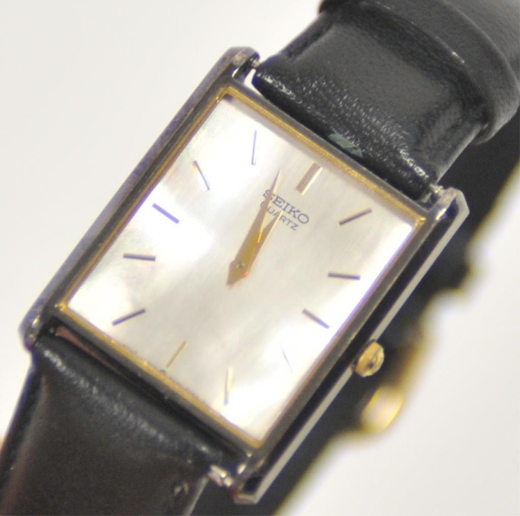 Seiko quartz tank watch with a beautiful mother of pearl face. The watch is in very good overall condition with a leather band, black anodized case and gold tone hands. The watch is working at the time of description. Est.: $100-$200.