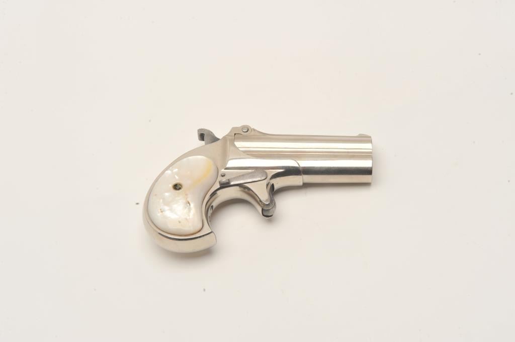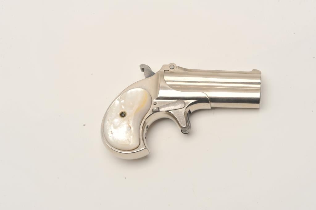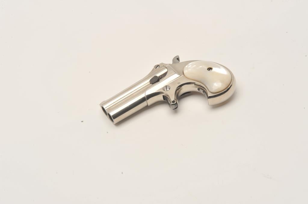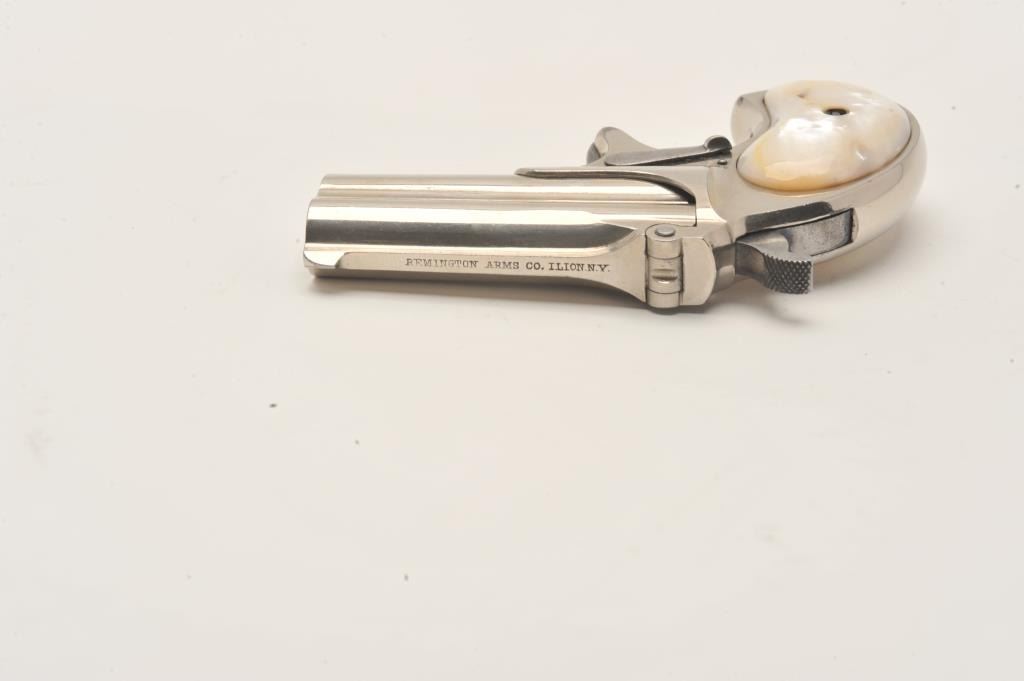 Remington Double Derringer in .41 rim fire caliber with 1 line “gap” address, S/N 129. Nickel plated with pearl grips. Fine original condition with 98%-99% plus bright original nickel with most blue on small parts and Lot Title hammer. Near excellent grips. No defects and a strong 9.8 on a 1-10 scale. The collection of Doug Drummond with a copy of his book. (Antique) Est.: $1000-$2000