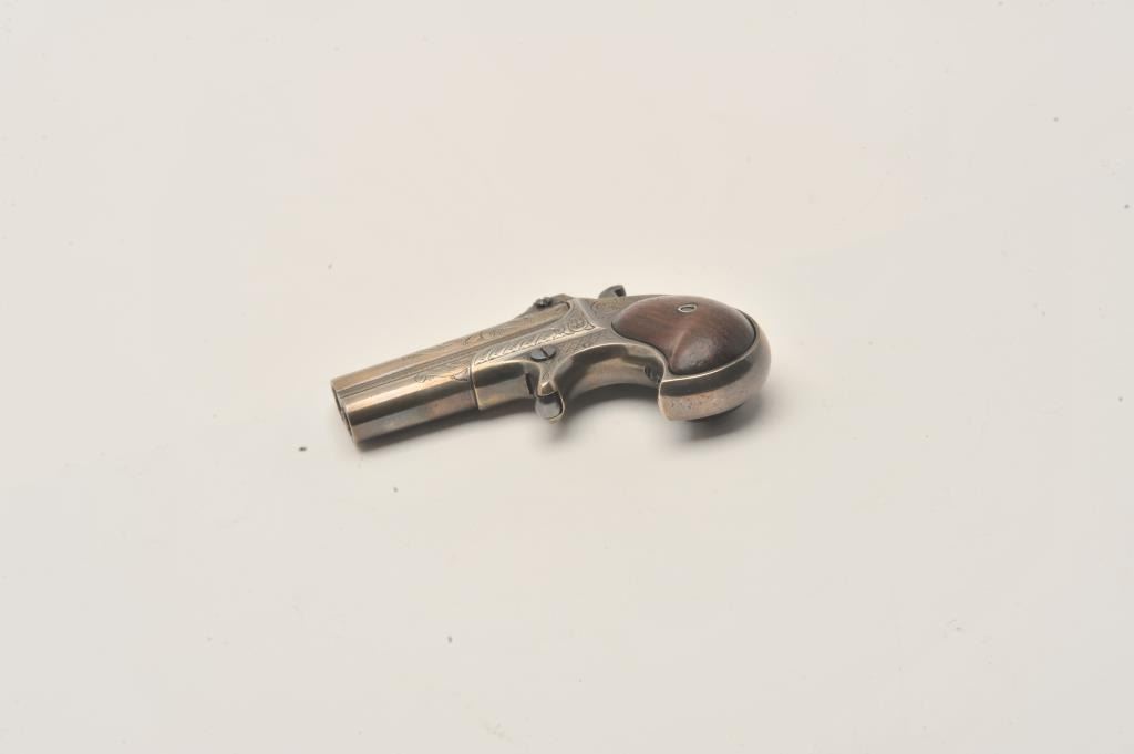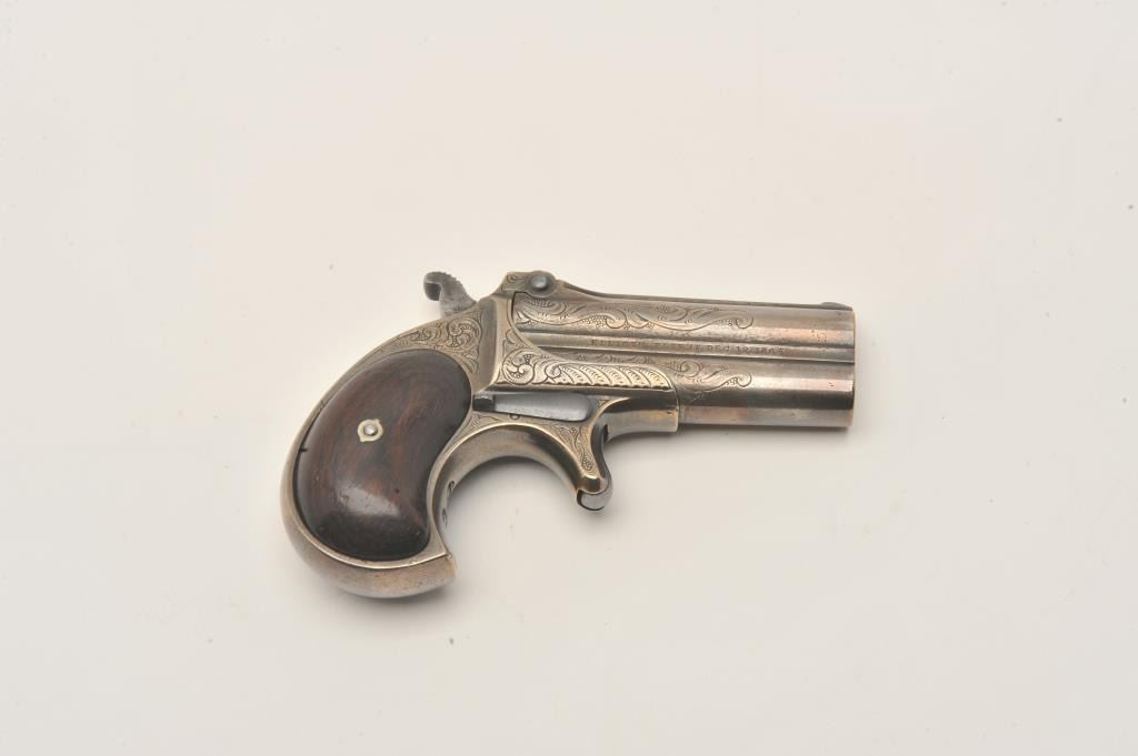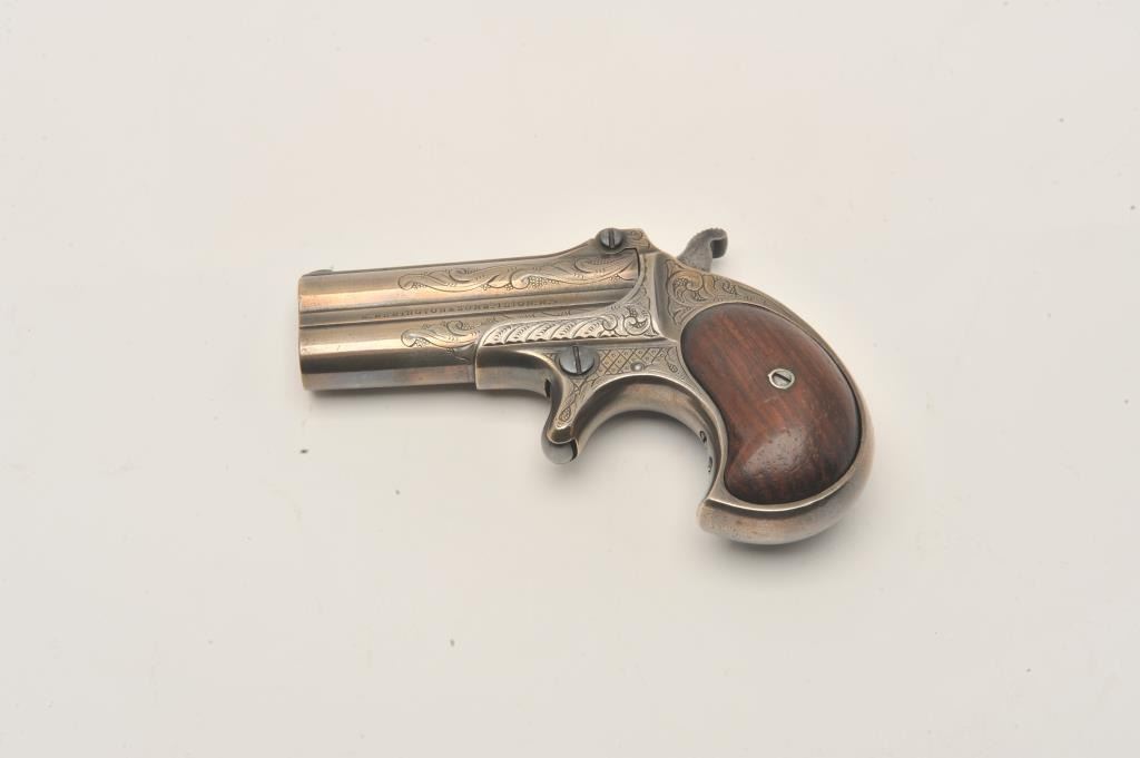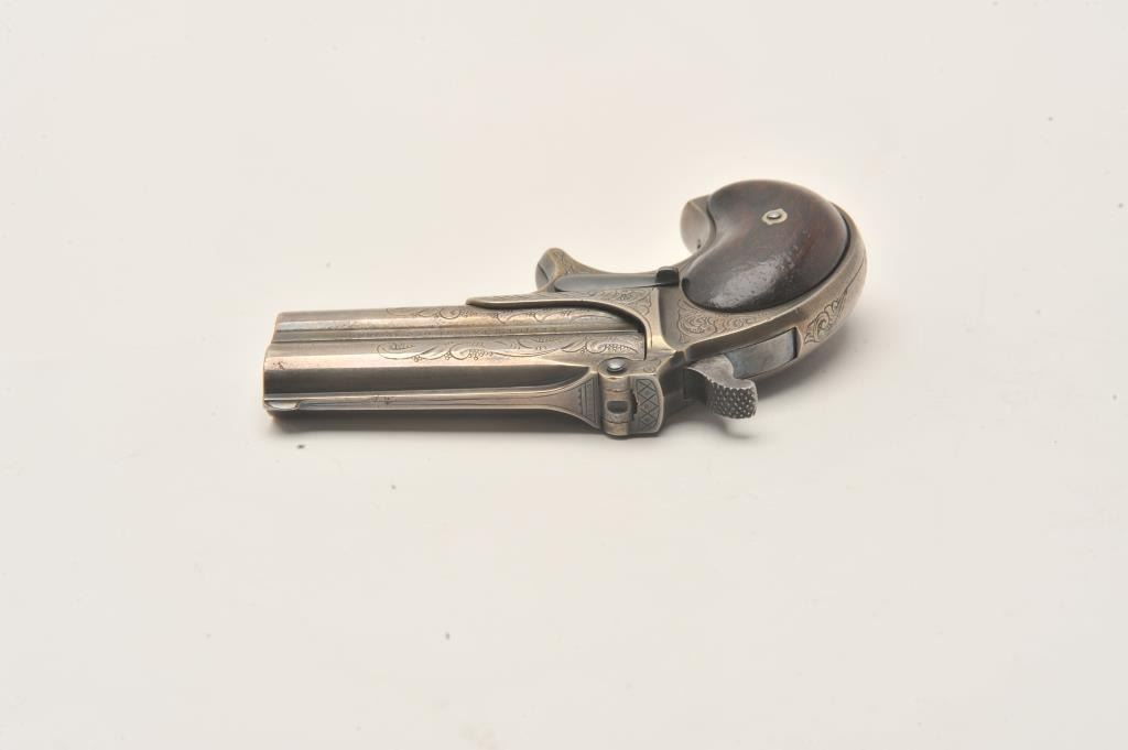 Remington Double derringer in .41 rim fire caliber with early side address, S/N 247. One of 2000 made beginning 1868. Nicely period scroll engraved in New York style with characteristic light scroll engraving. Lot Title 80%-90% darkened and unpolished silver finish and faded gold with balance going to patina. Lightly cleaned rosewood grips in very good condition (Steel wool no sanding). Good markings and very good overall. The bores Lot Title show some use and wear from firing and not cleaning. A rare and early variation seldom found engraved. The collection of Doug Drummond with a copy of his book. (Antique) Est.: $3000-$6000