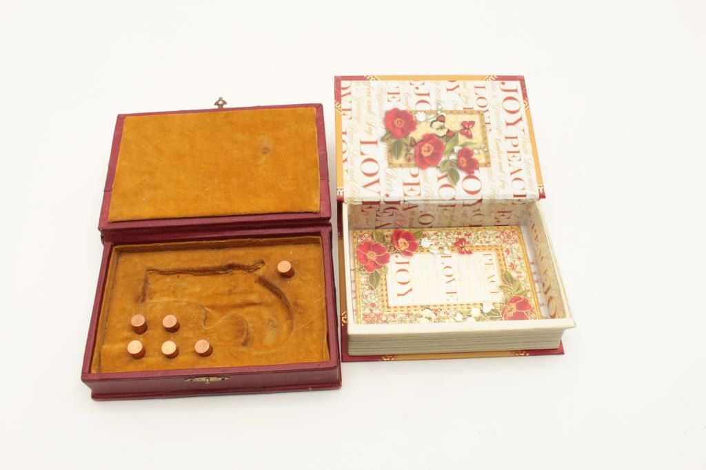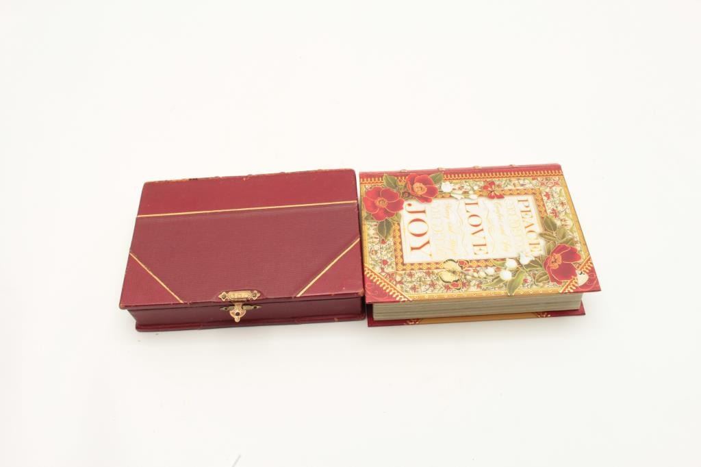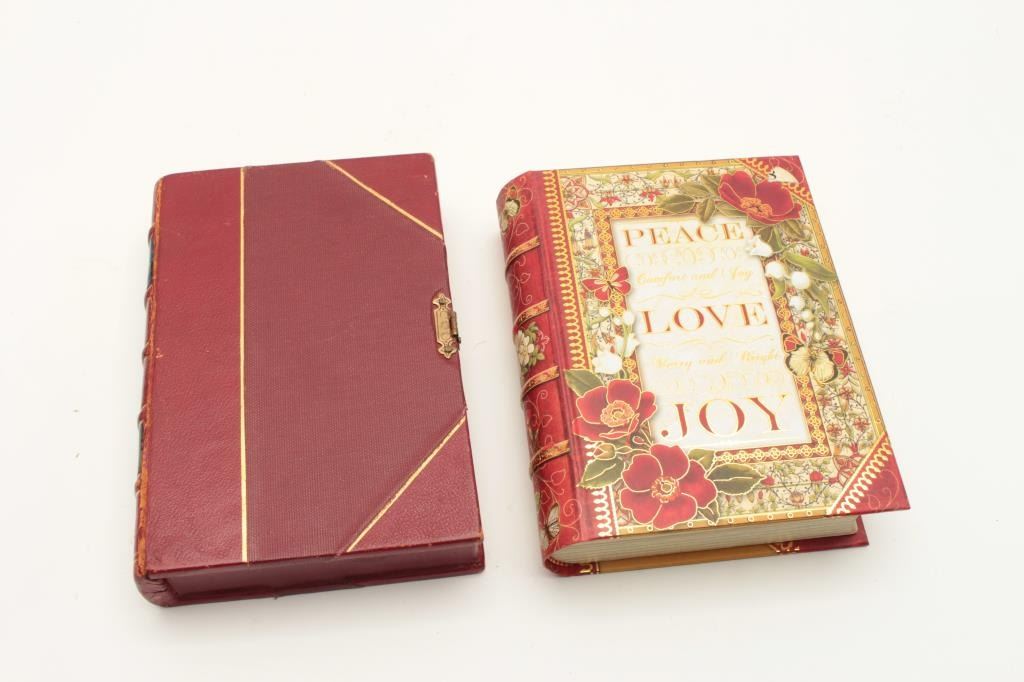 1950-60’s book casing for Remington Double Derringer with spine entitled “A case of Double Jeopardy” by Eliphalet Remington. Velvet lined interior. Good condition with 6 rounds of .41 rim. Also book case (No lining) Lot Title for double derringer with title “Peace, Love, Joy” in excellent condition. (Note the story before the divorce). Est.: $150-$300