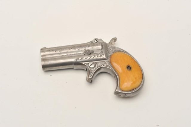 Remington Double Derringer with ultra-rare side barrel addresses and extractor in .41rim fire caliber, S/N 2020 showing factory style scroll engraving with ivory grips. The left side reads “Remingtons Ilion N.” and theright reads “Elliot patent Dec 12, 1865” upside down. Only handful known engraved in this variation. The derringer remains in very good condition with 50%-70% evenly toning nickel finish remaining. Smooth and sharpmetal surfaces with sharp markings. Hinge and action are both good. The bores are fair to good. The ivory grips show a deep yellow patina and some even wear and remain at least very good plus. In original to the periodpipe casing which is also in very good condition. From the Dr. Rudy Johnson collection and pictured in the book he co-authored with Drummond. Includes deluxe copy of the book. (Antique) Est.: $5500-11000