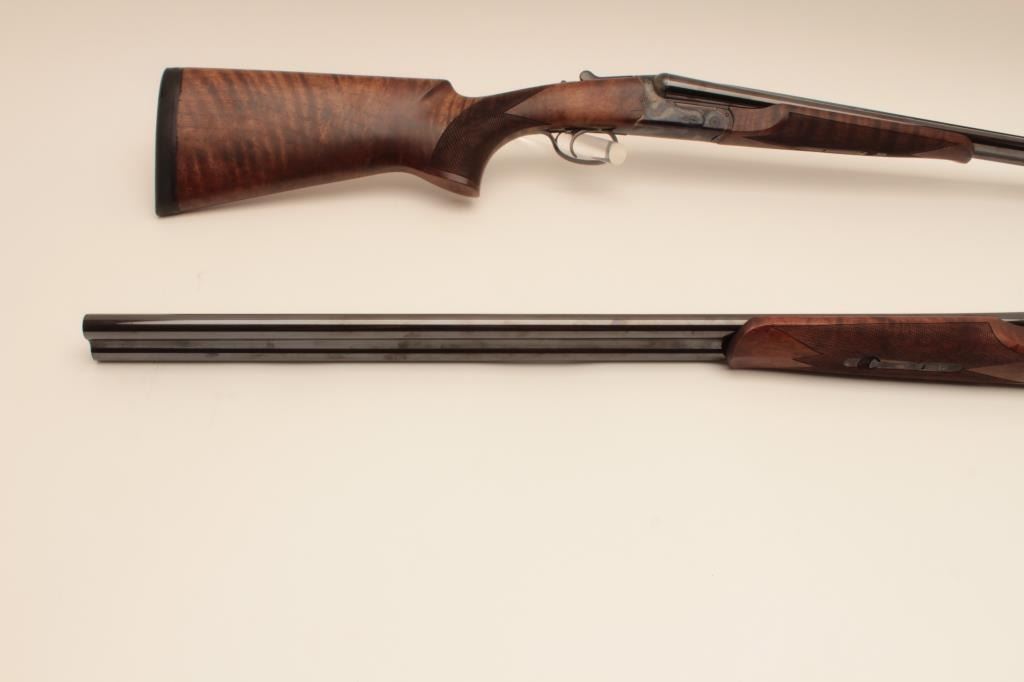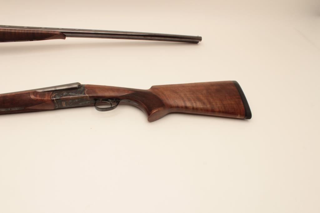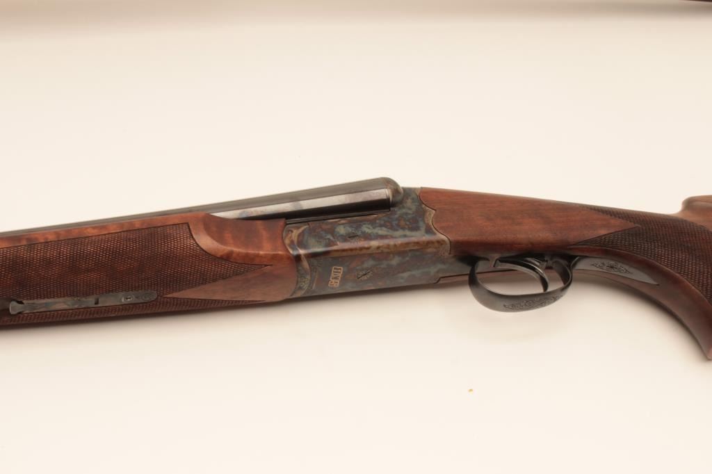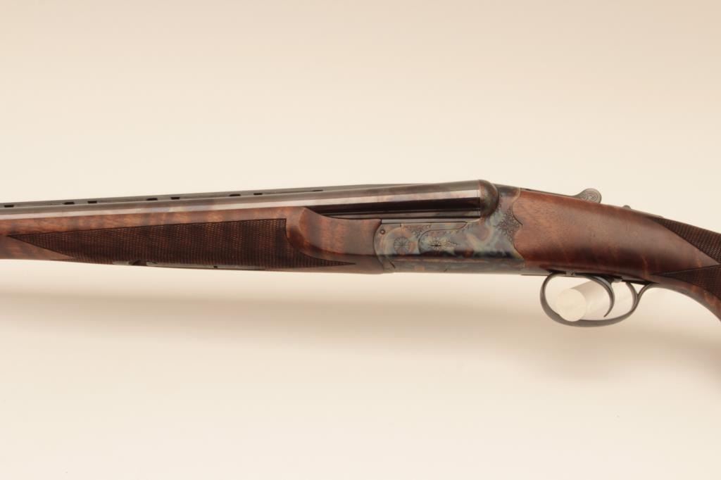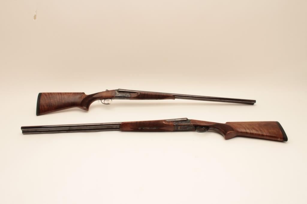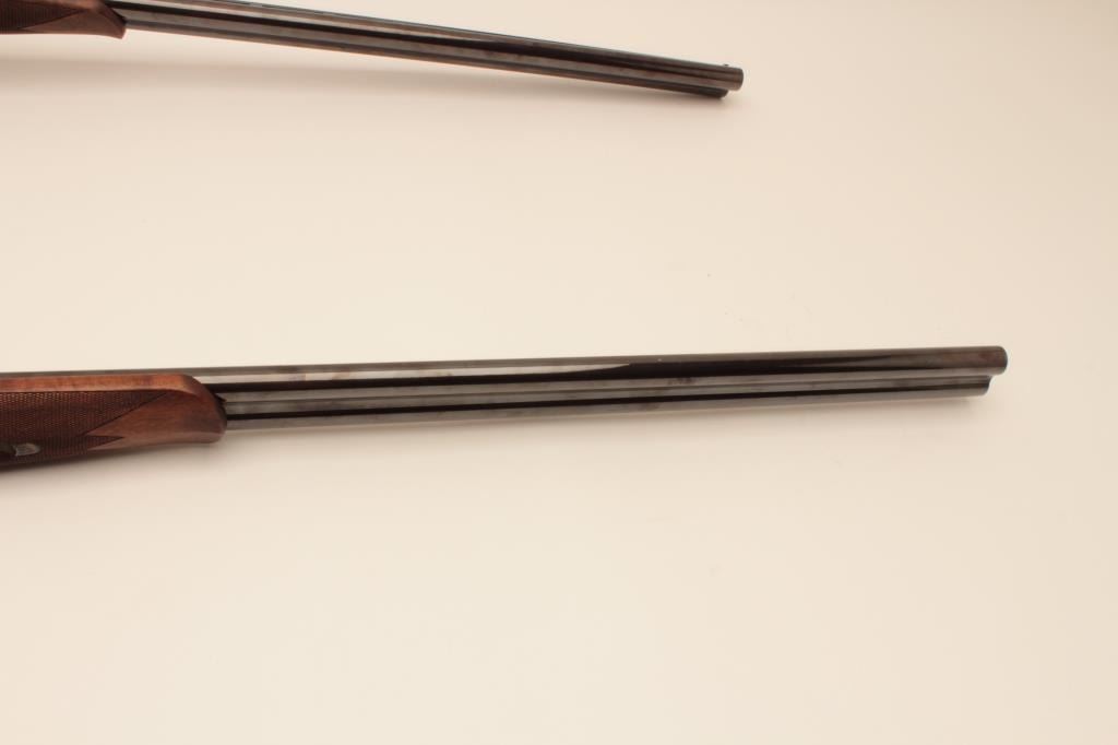 Pair of SKB (Turkey) 20GA SxS shotguns with consecutive numbers in trunk case. The barrels measure 30” with low rise vent rib, single trigger, auto ejectors, and finely stocked in select walnut with swelled andoversize pistol grips. Both have blue and case colored finish. The barrels on gun S/N 315 is choked modified right barrel and full left barrel. The barrels on gun S/N 316 choked full right barrel and modified left.Measures 14 1/8” to the end of the rubber pads. Fine to excellent used condition with 97%-99% original finishes and near fine stock. Minor evidence of use. The best quality we have seen on Turkish made armswith excellent stocking and fine fit and exceptional bluing. (Modern) Est.: $3500-$7000