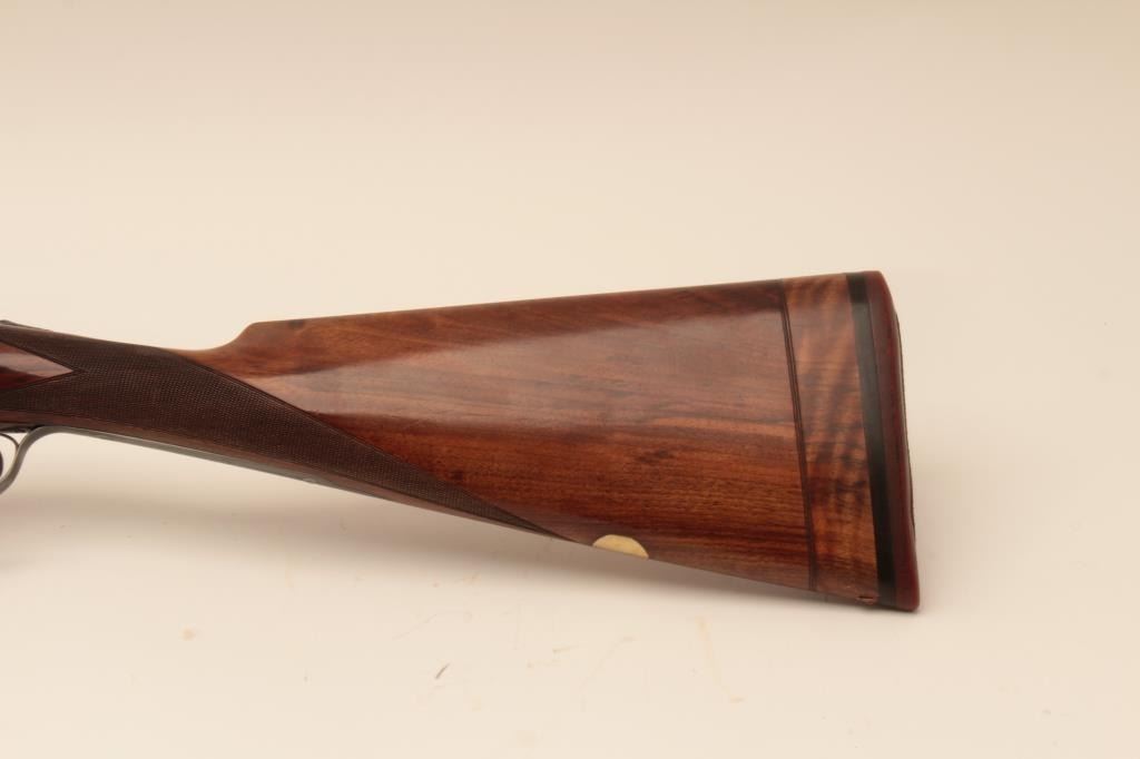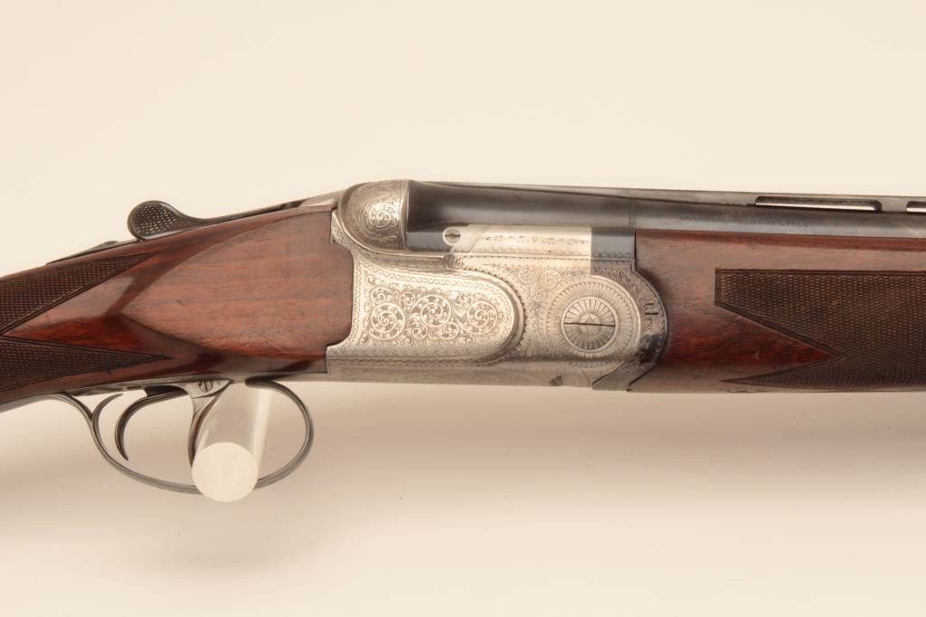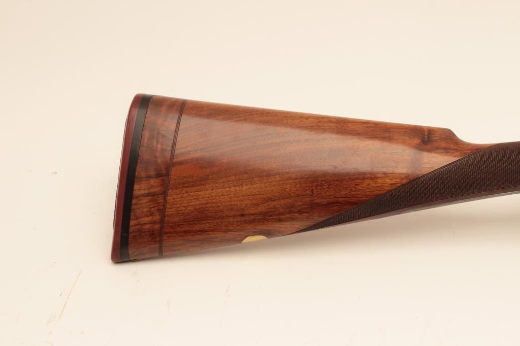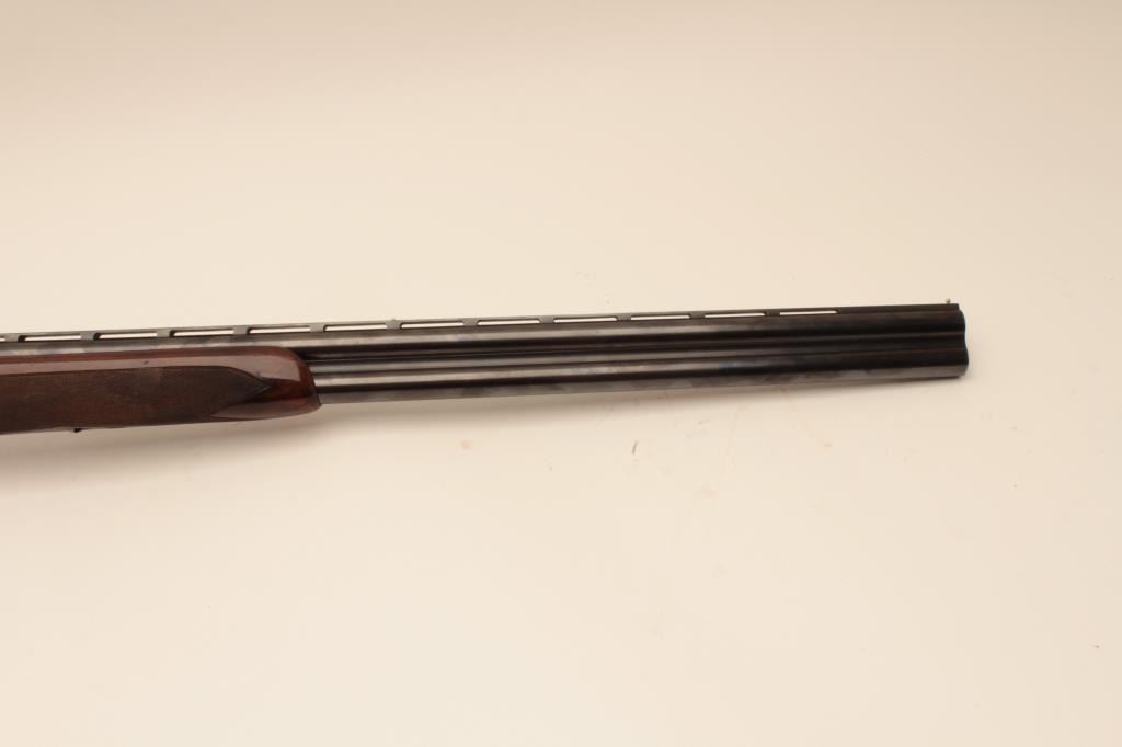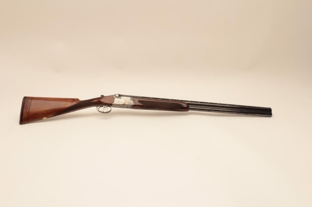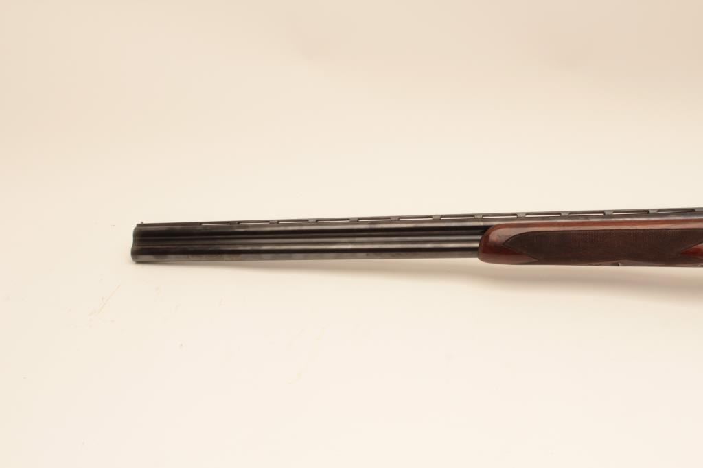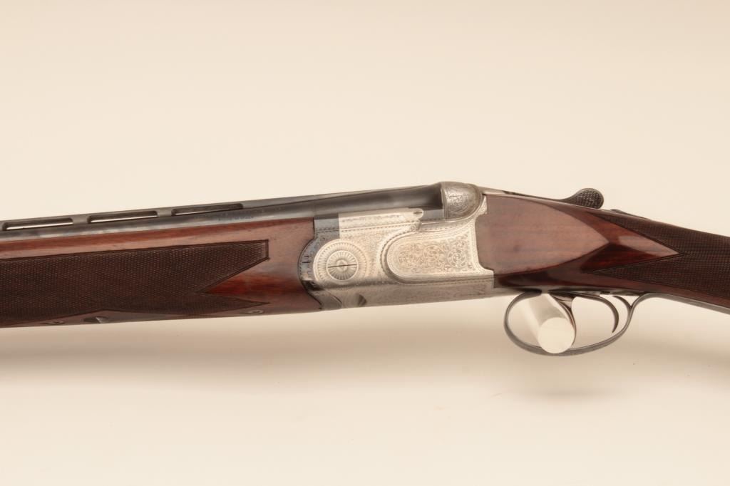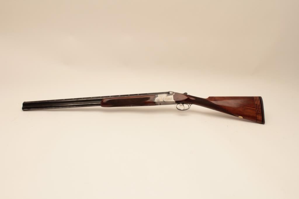 Beretta ASEL 12GA Over/Under shotgun with 28 ¼” barrels and Briley screw in chokes (5 with wrench) included, S/N 22829 with double triggers, and auto ejectors. Measures 14 ¾” to the end of the pad and the stock showsprofessional extension from 13 ¼” to the end of the wood. The metal is in near fine condition with 96%-98% finishes remaining. The frame shows crisp and fine scroll engraving. 98% blue on trigger guard andtang. The stock is very good plus with minor marks and slight imperfections from use. Locks tight with fine bores. Hard shell carry case included. (Modern) Est.: $2000-$4000