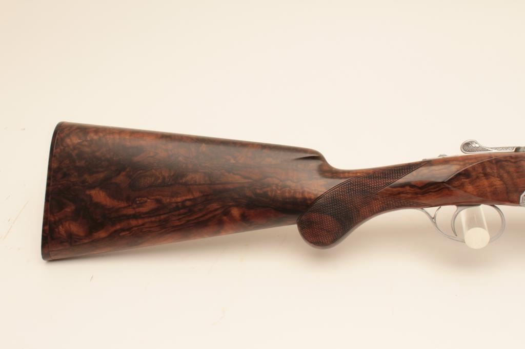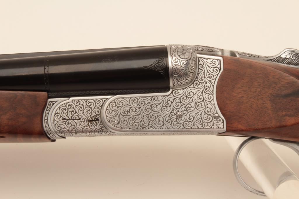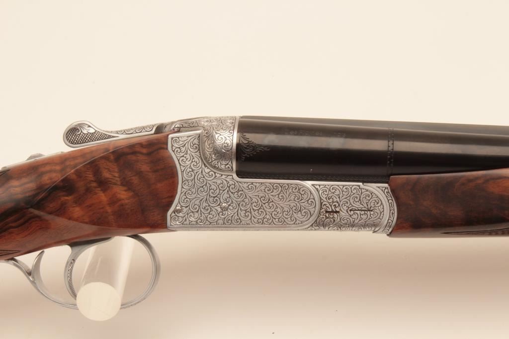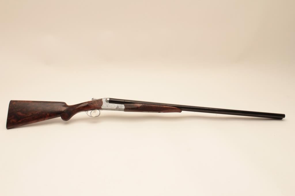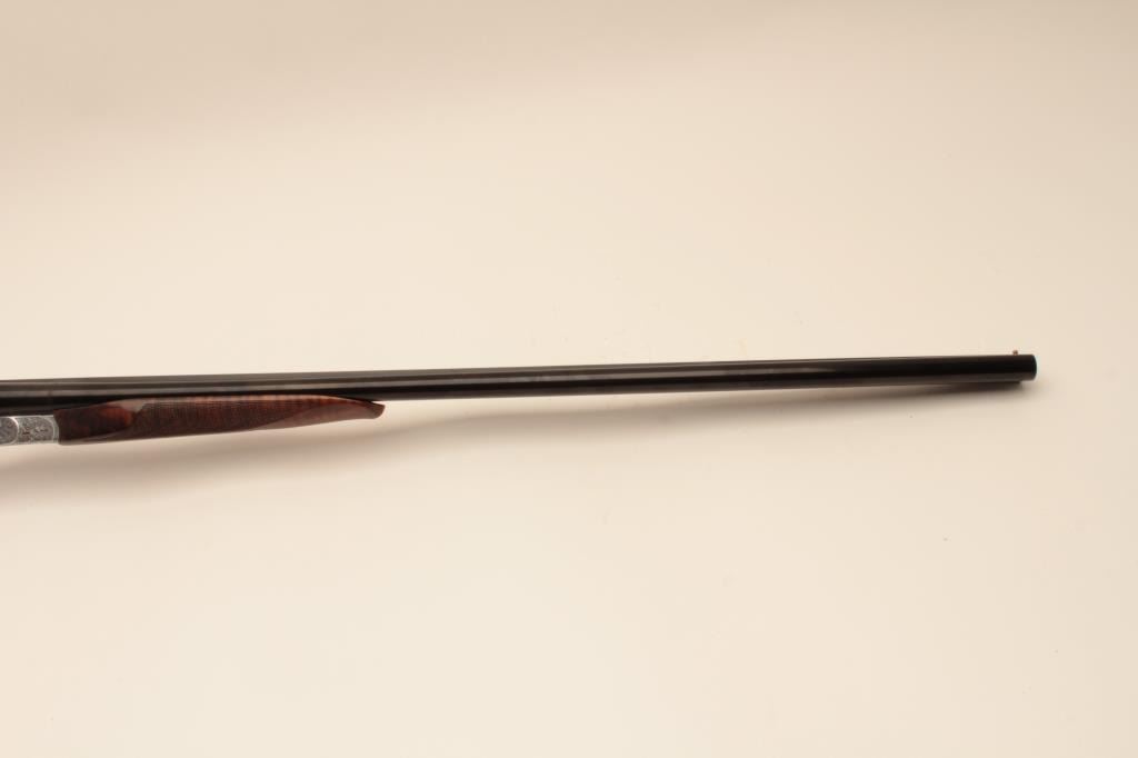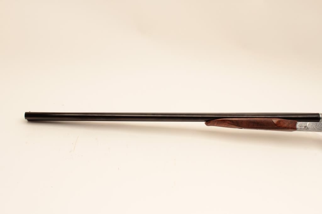 Huglu 2 barrel 20GA “Hunter” set, S/N 03C4187 with 28” and 30” SxS barrels, single trigger, auto ejectors, raised non vent rib and scroll engraved and silver gray finish, and rounded pistol grip. The 28” barrel ischoked full and full. The 30” is choked modified in both barrels. Measures 14 ¼” to end of butt plate. Fine to excellent used condition. 97%-99% overall. With carry case. (Modern) Est.: $2000-$4000
