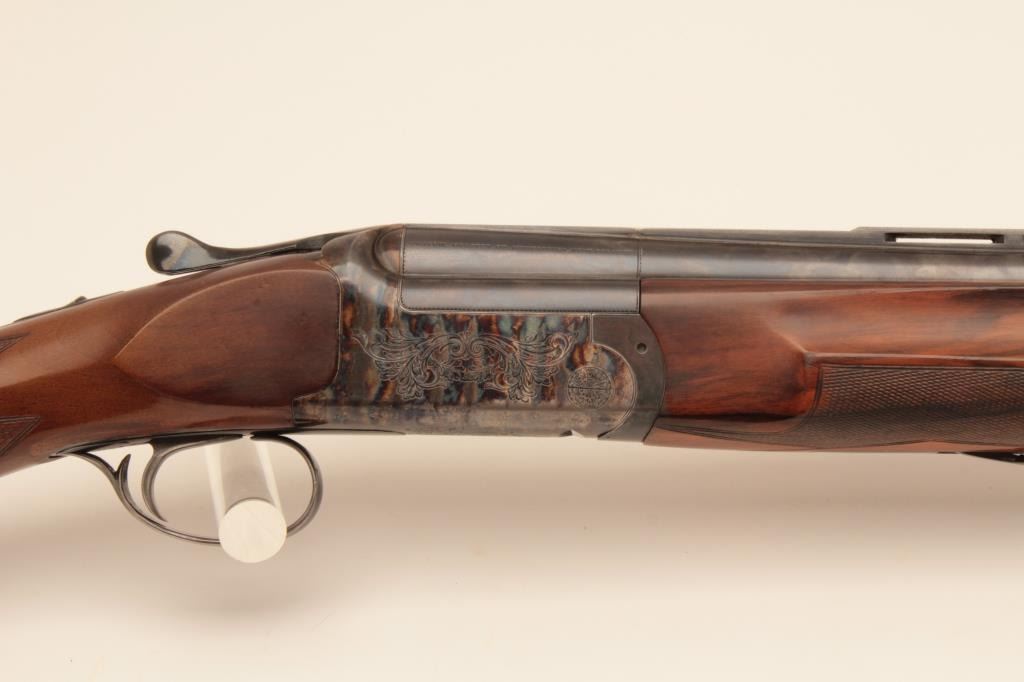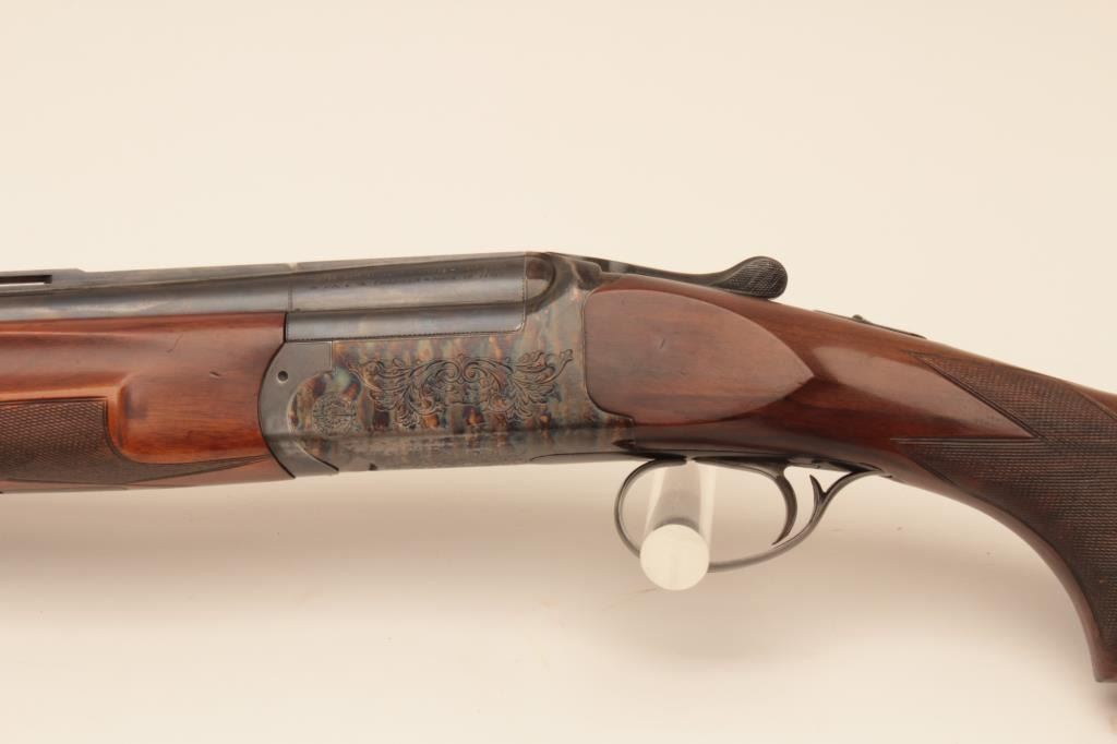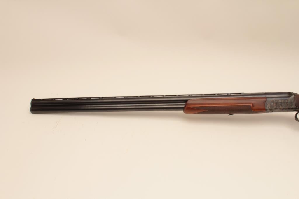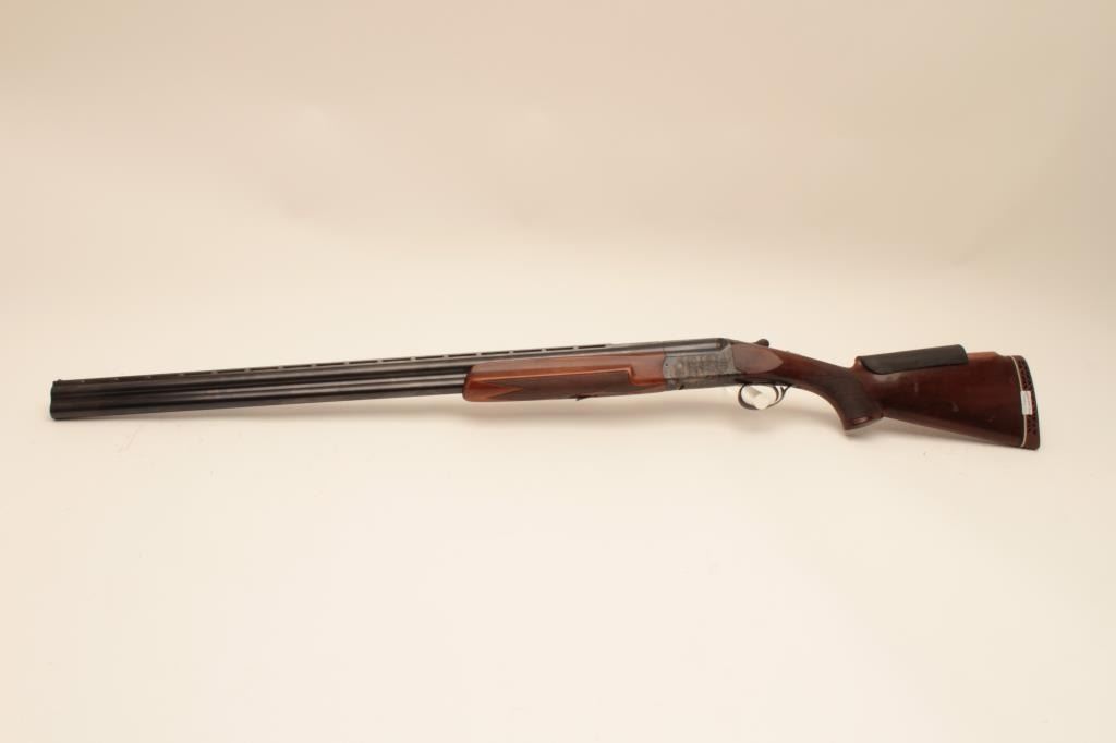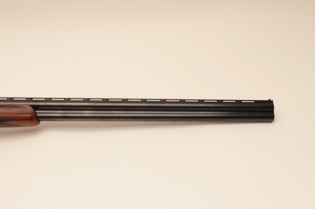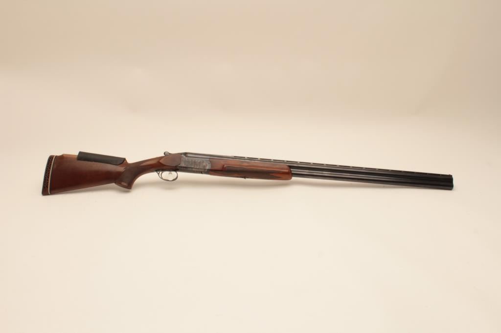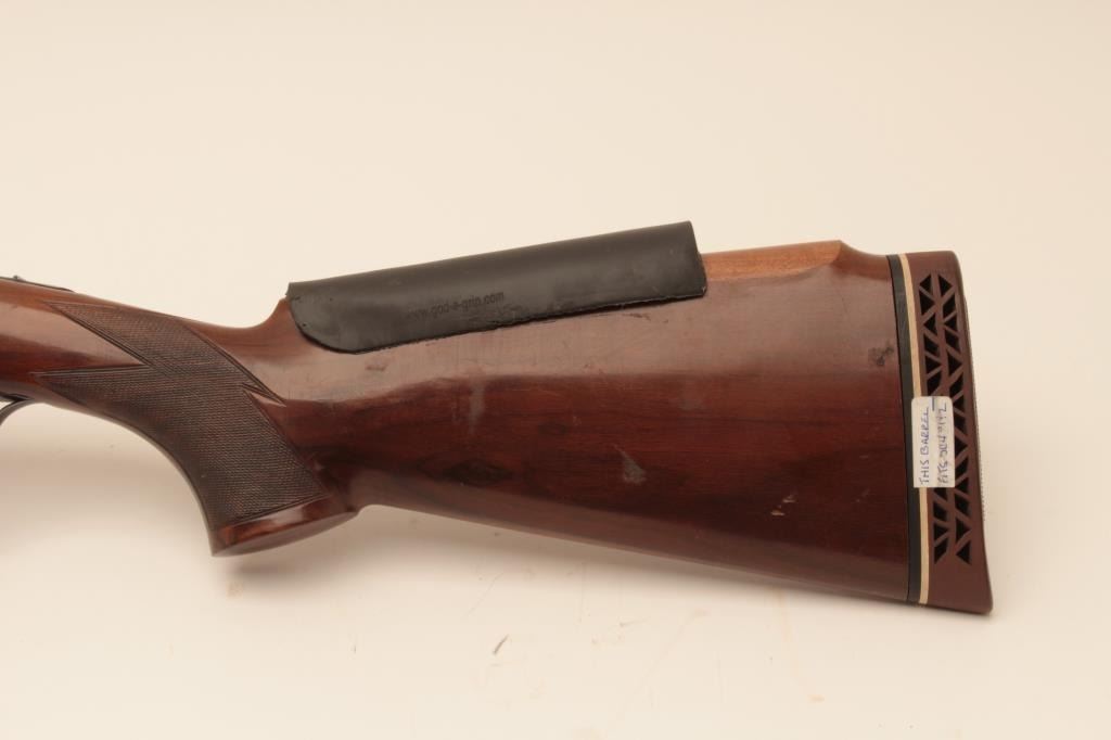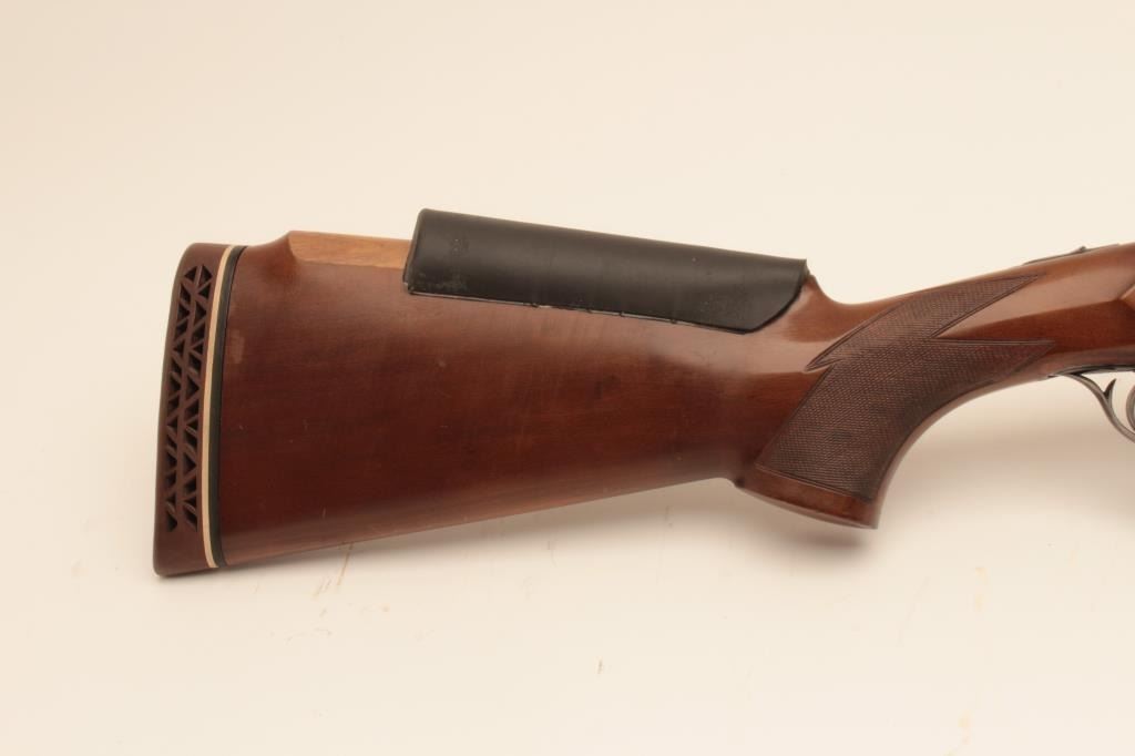 Perazzi Comp-1 12GA Over/Under Trap Shotgun with 32” barrels choked full over improved cylinder, single trigger, and trap stock. Measures 14 ¼” to the end of the pad. Rubber stick on cheek riser added (Easily removed).Very good plus condition with 95% plus original blue and case colors. The stock is very good with minor marks and imperfections from use. Fine bores and locks tight. With canvas carry case. S/N 35071 with Ithaca, New York and custom crafted by Manafattura Armi-Perazzi. (Modern) Est.: $1900-$3800