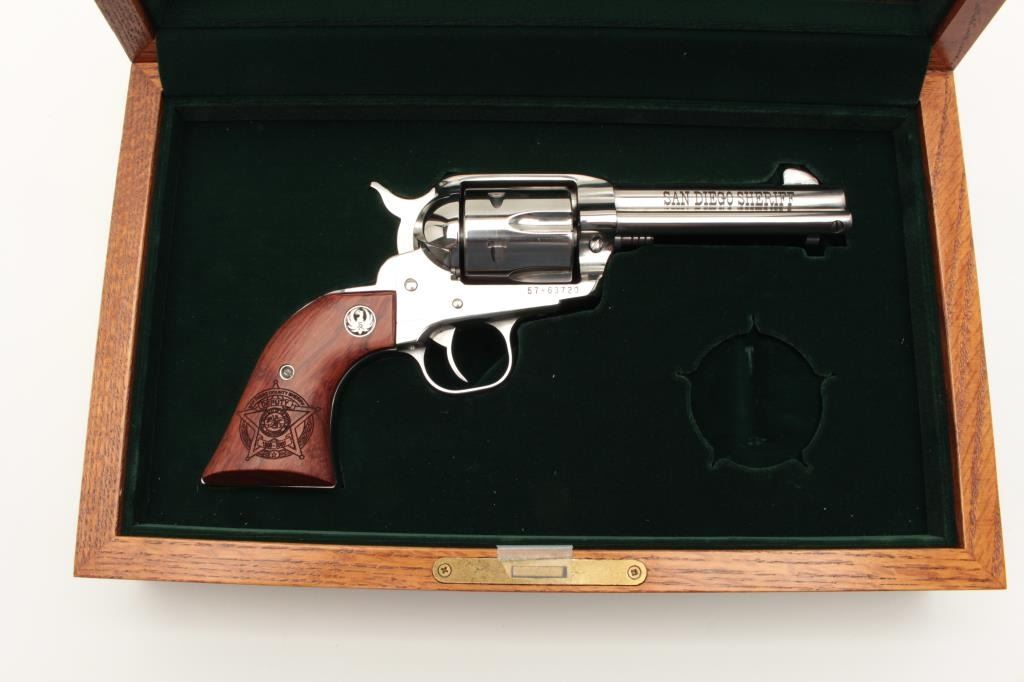 Ruger New Vaquero San Diego Sheriff's Model, #57-63720, stainless, 40 S&W cal., 4 3/4" barrel, wood grips with Sherif's logo laser etched into the right grip panel. Fine condition overall, in factory display case. Lot Title (Modern / PPT) Est. $700-1400