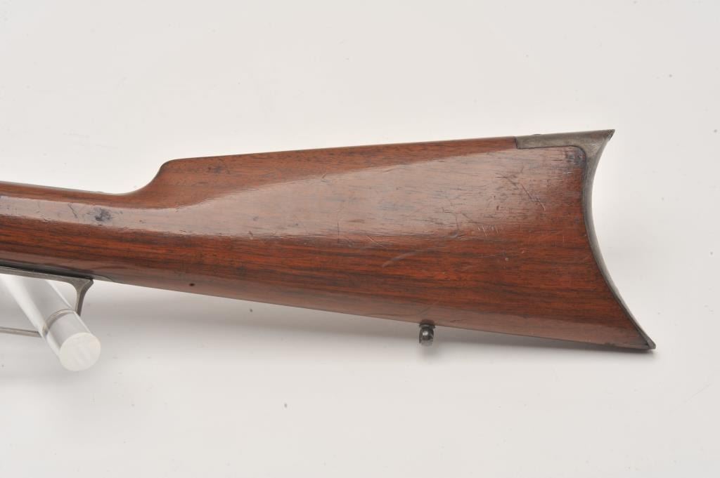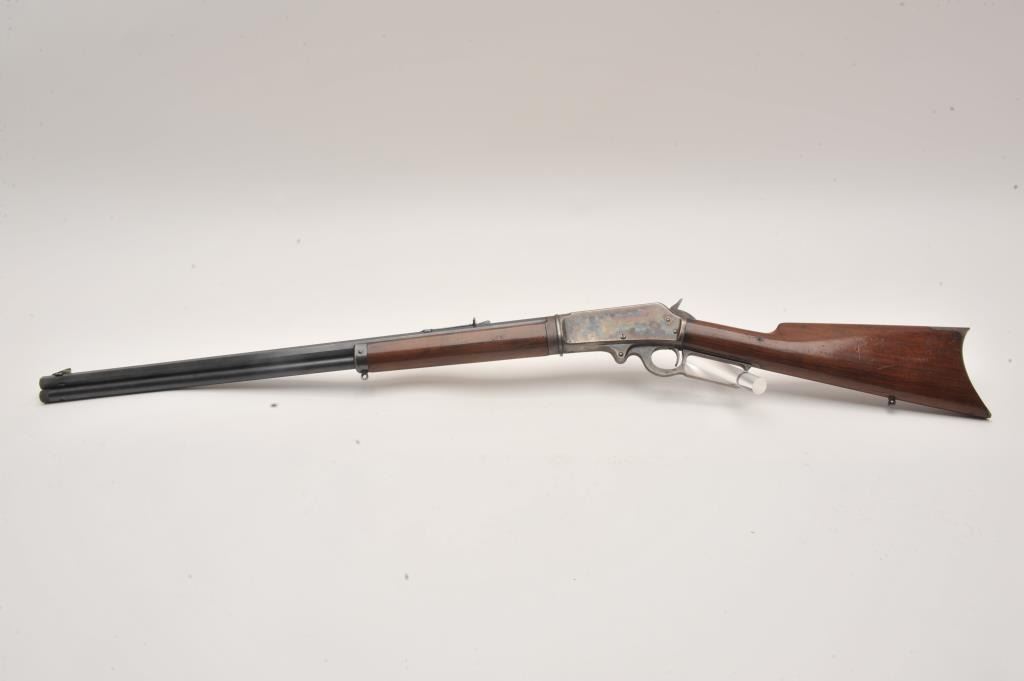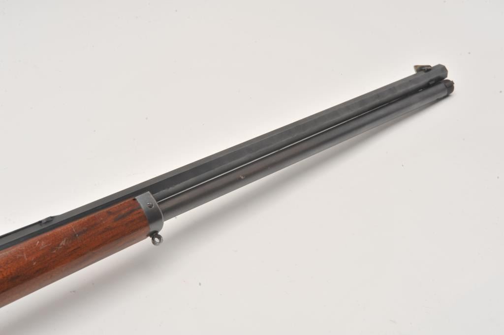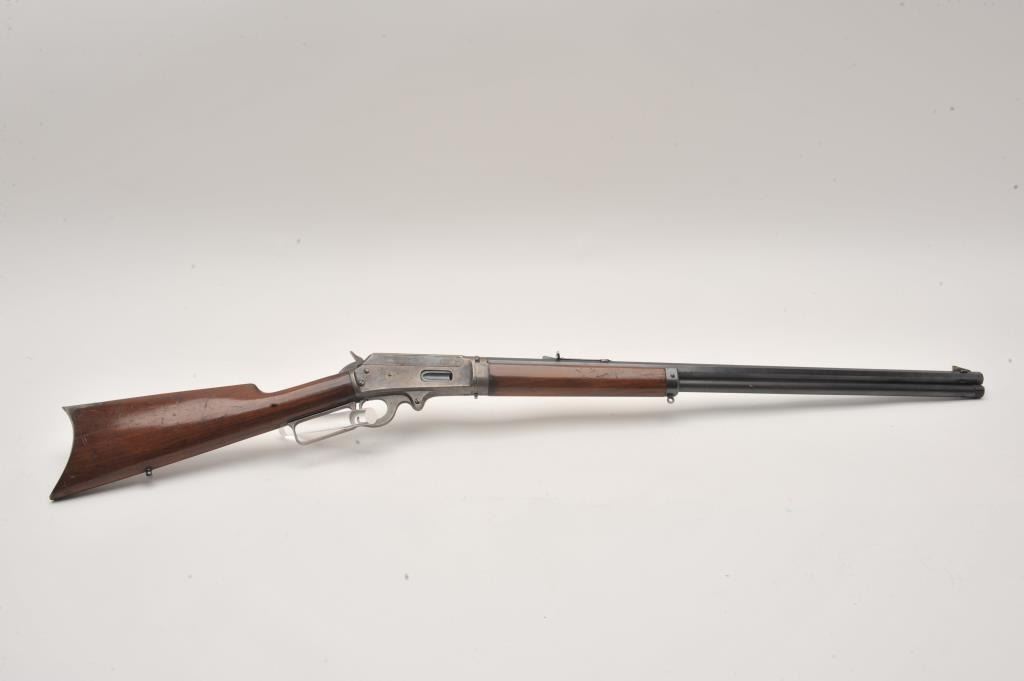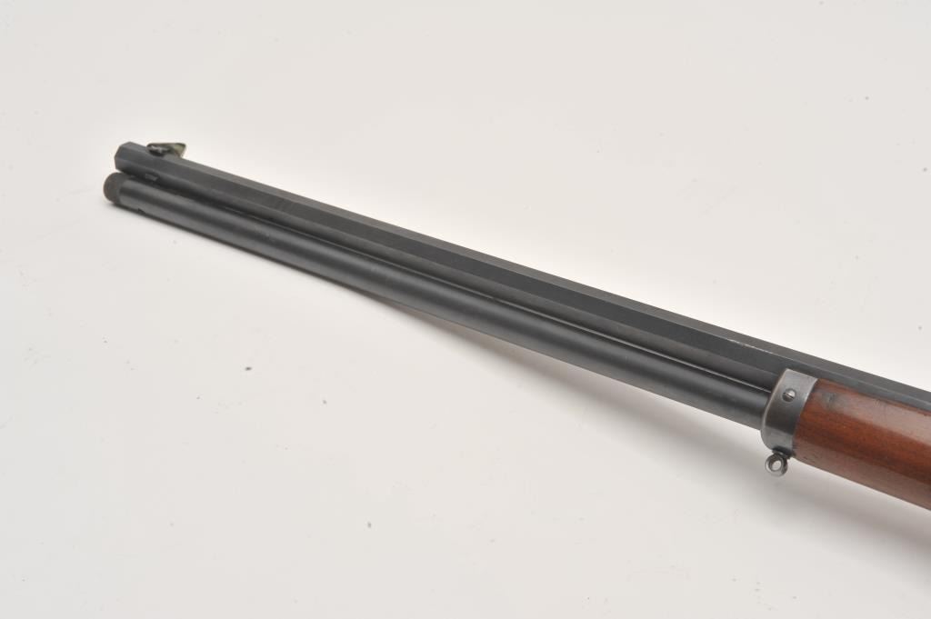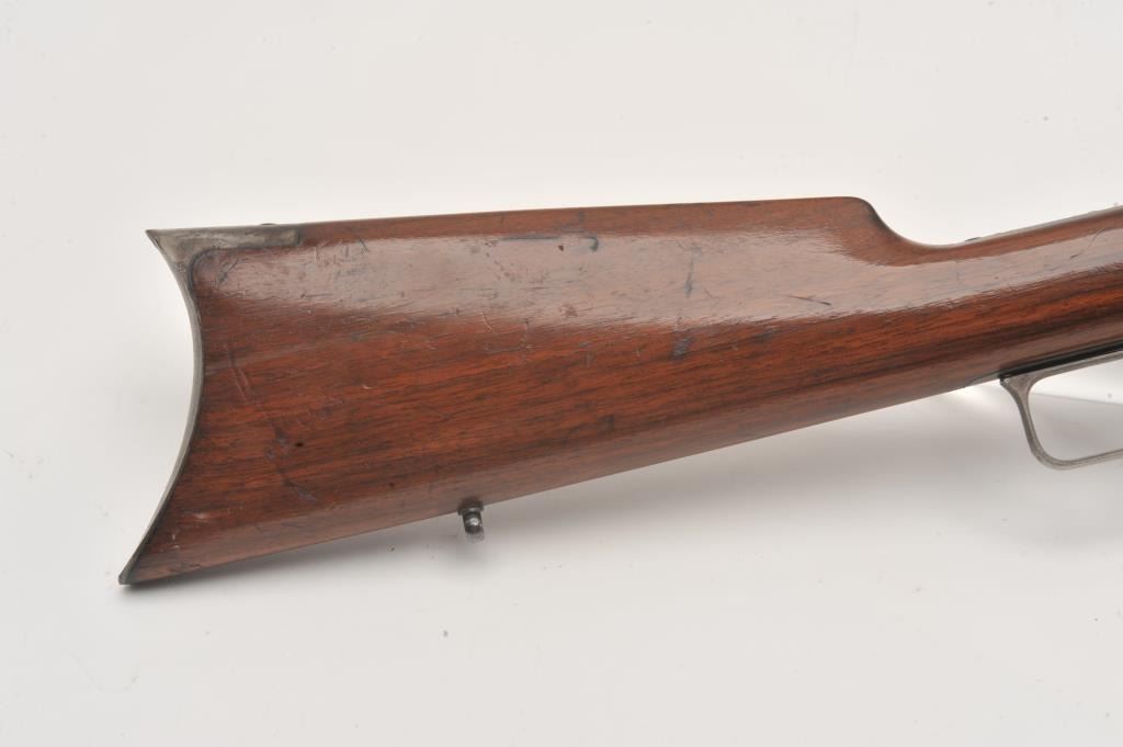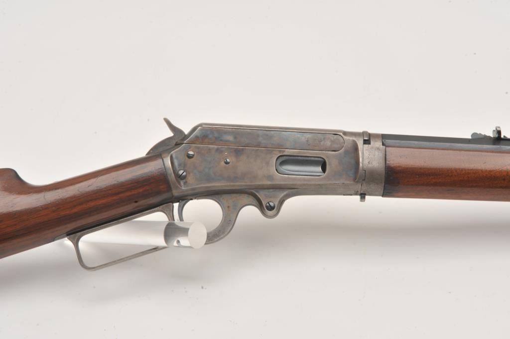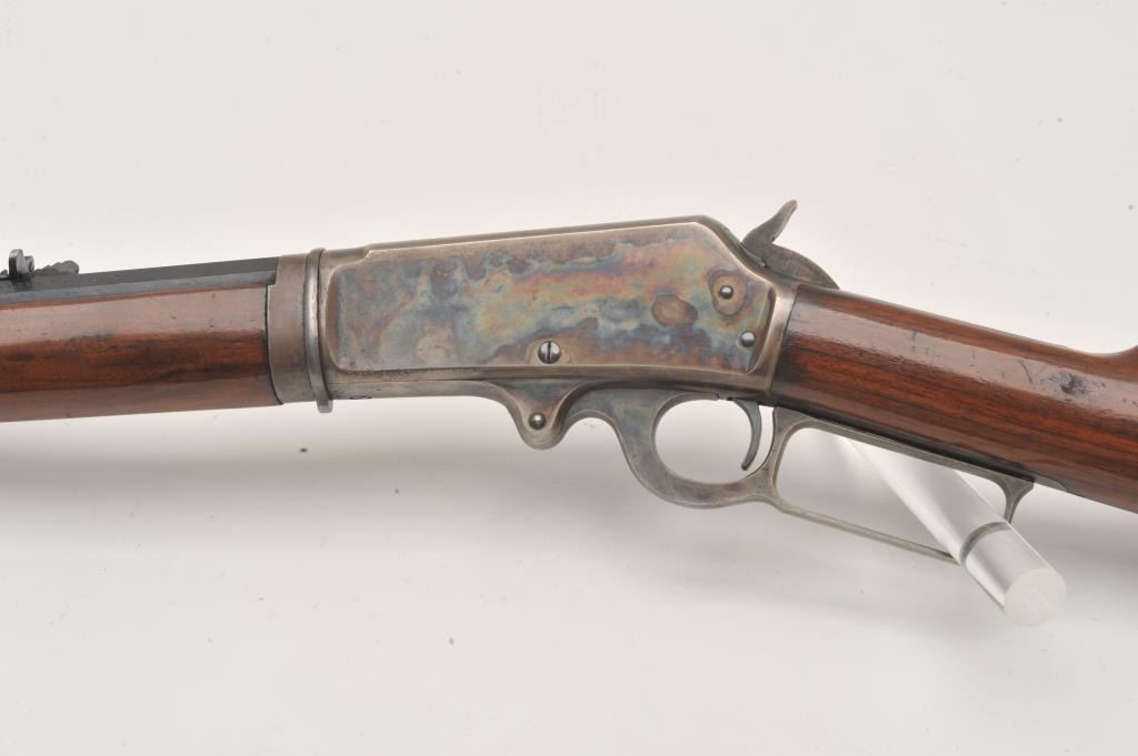 Marlin Model 1893 Special Order Takedown rifle in .32-40 caliber with a 26” octagon barrel, full magazine, crescent butt, S/N 268170. This rifle remains in fine original condition with 95% plus original blue on the Lot Title barrel, 60%-80% blue thinning on the tube (Mostly right side) 85%-95% bright and fiery case colors showing. Rainbow colors. Loss of finish on take down collar and minor drifting at the edges. The wood is very good to Lot Title almost fine with 80%-90% varnish with minor nicks, scratches and storage marks. The bore is bright with strong rifling. Sling swivels eyelets may be dealer or period added. Special smokeless steel marking on the left Lot Title side of the barrel. A strong 9 on a 1-10 scale. (C&R) Est.: $2,000-$4,000