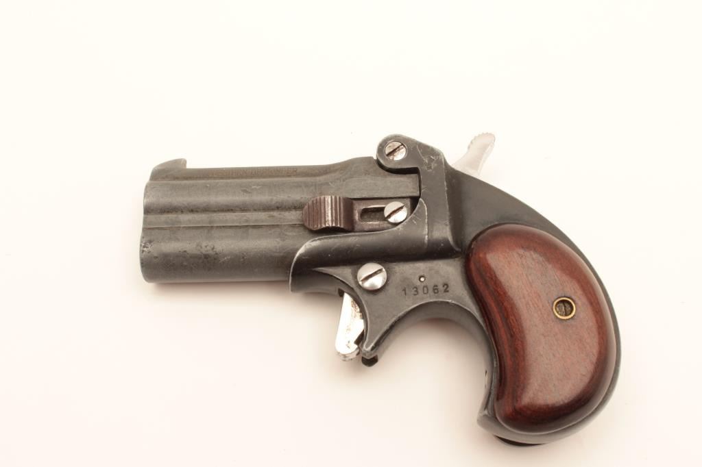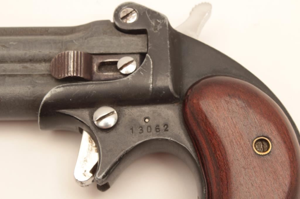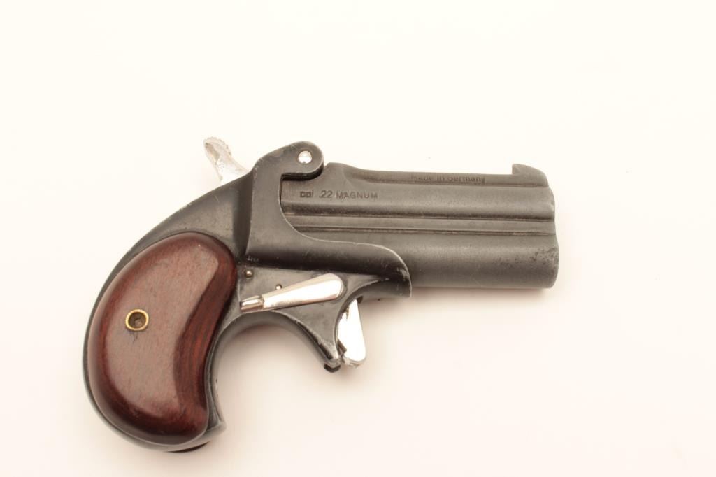Hawes Western Derringer, .22 Magnum caliber, Serial #13062. The pistol is in good overall condition with 3” barrels. The metal surfaces retain the majority of their blue finish, with the barrels going to grey andmarked, “MADE IN GERMANY”. The smooth wood grips are in good condition with small mars and handling marks. The bores are good, the action crisp and markings are sharp. Est.: $150-$300. (Modern).
