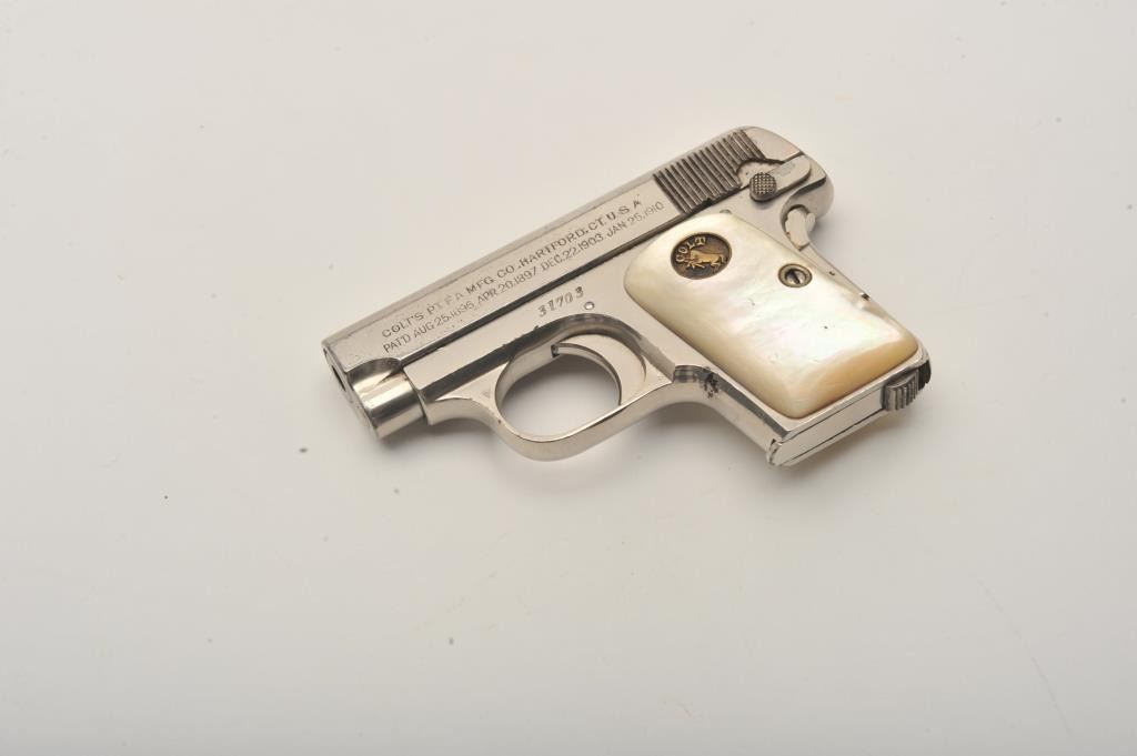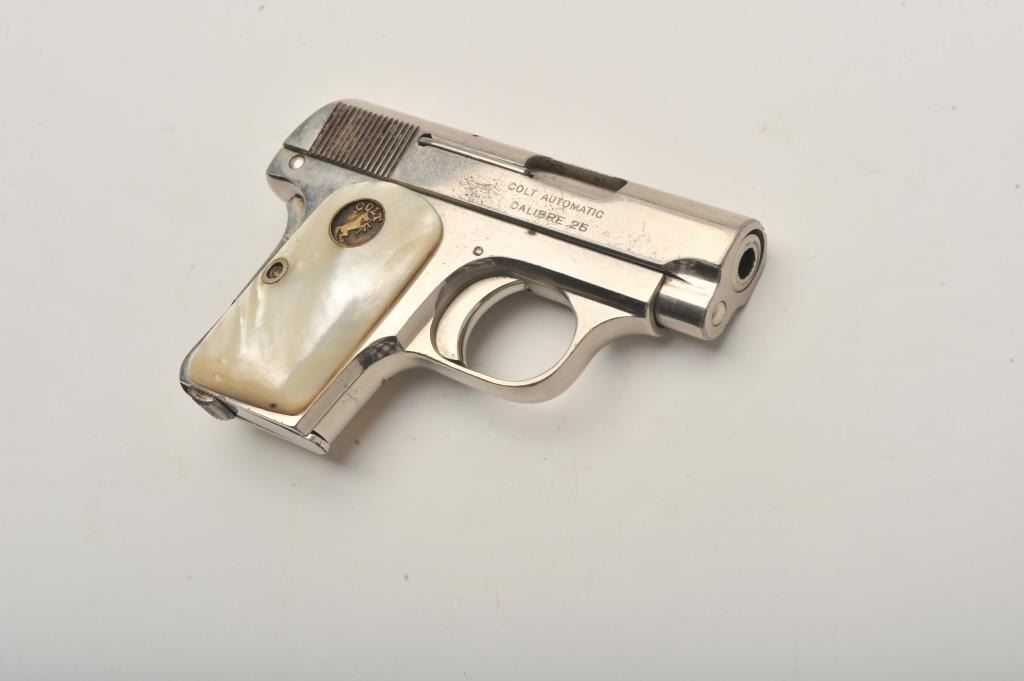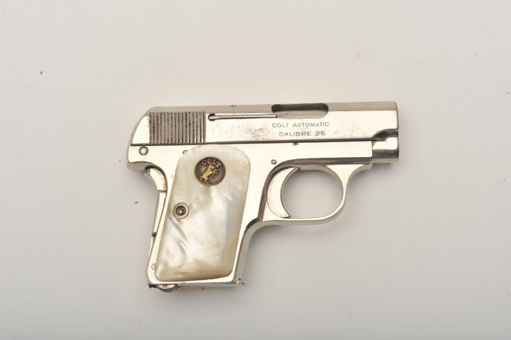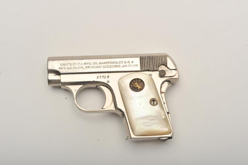 Colt 1908 semi-automatic pistol, .25 auto caliber, Serial #31703. The pistol is in very good overall condition with a 2” barrel. The pistol retains nearly all of its factory nickel finish with wear at the muzzle and small scratches from carry and use. The medallion pearl grips are in very good condition with storage marks. The bore is good, the action is crisp and markings are sharp. The lot includes one correctmagazine. Est.: $800-$1,600. (C+R).