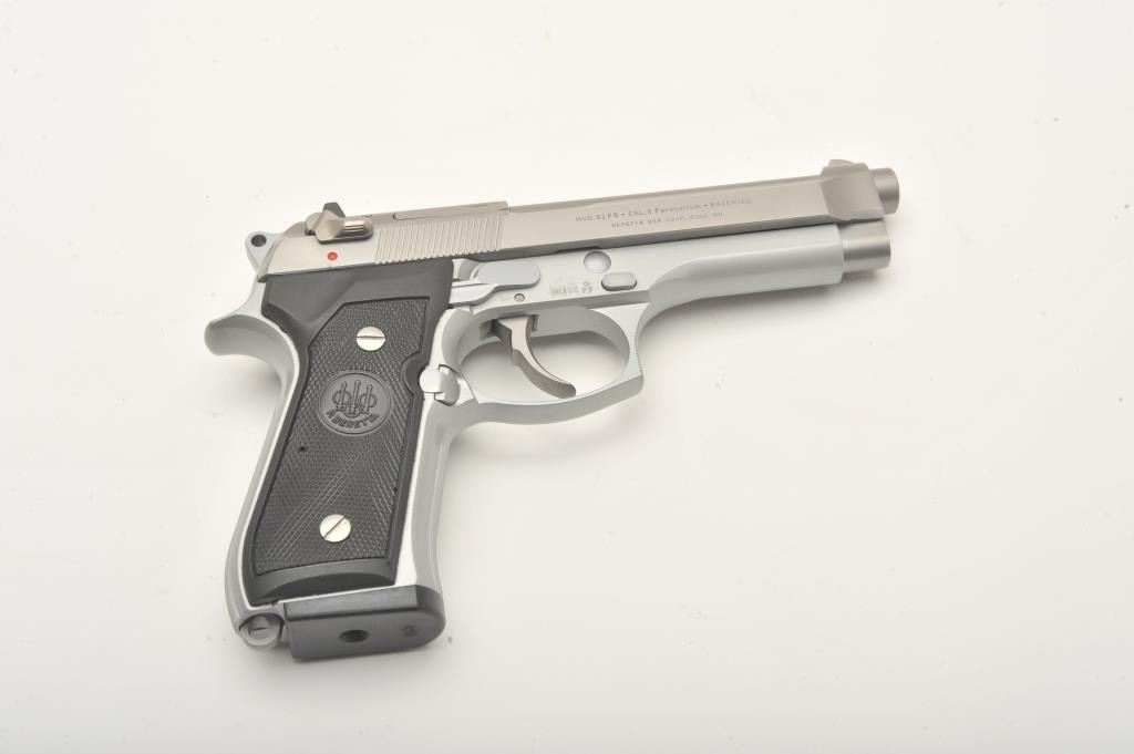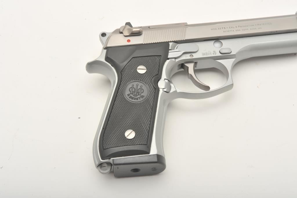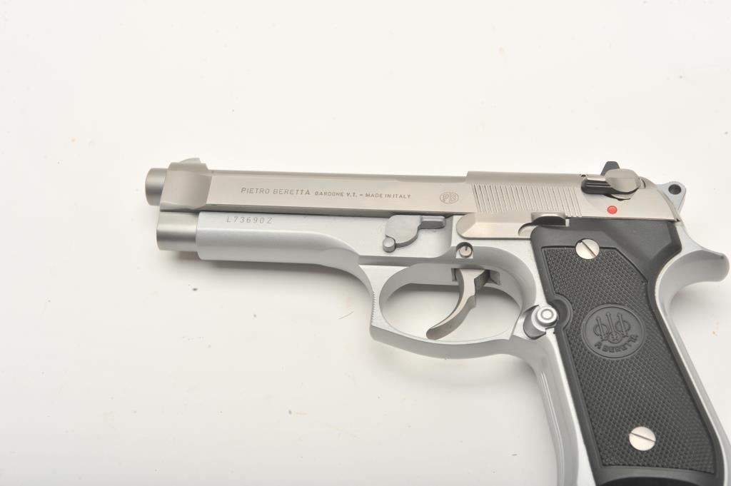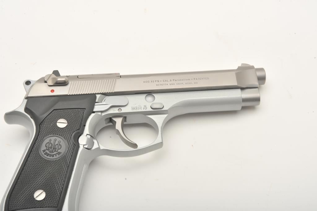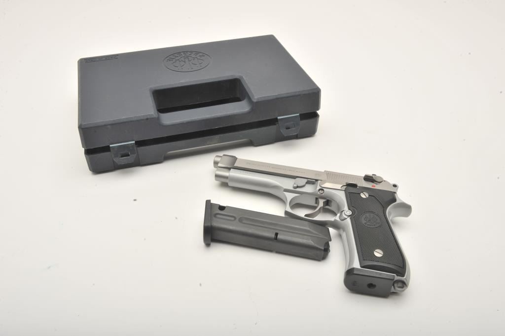 Beretta Model 92FS semi-automatic pistol, 9mm parabellum caliber, one extra magazine, stainless, checkered black grips, factory hard carry case, instructions, S/N L73690Z, in overall fine condition displaying minimaluse. (Modern/PPT). Est.: $400-$800.