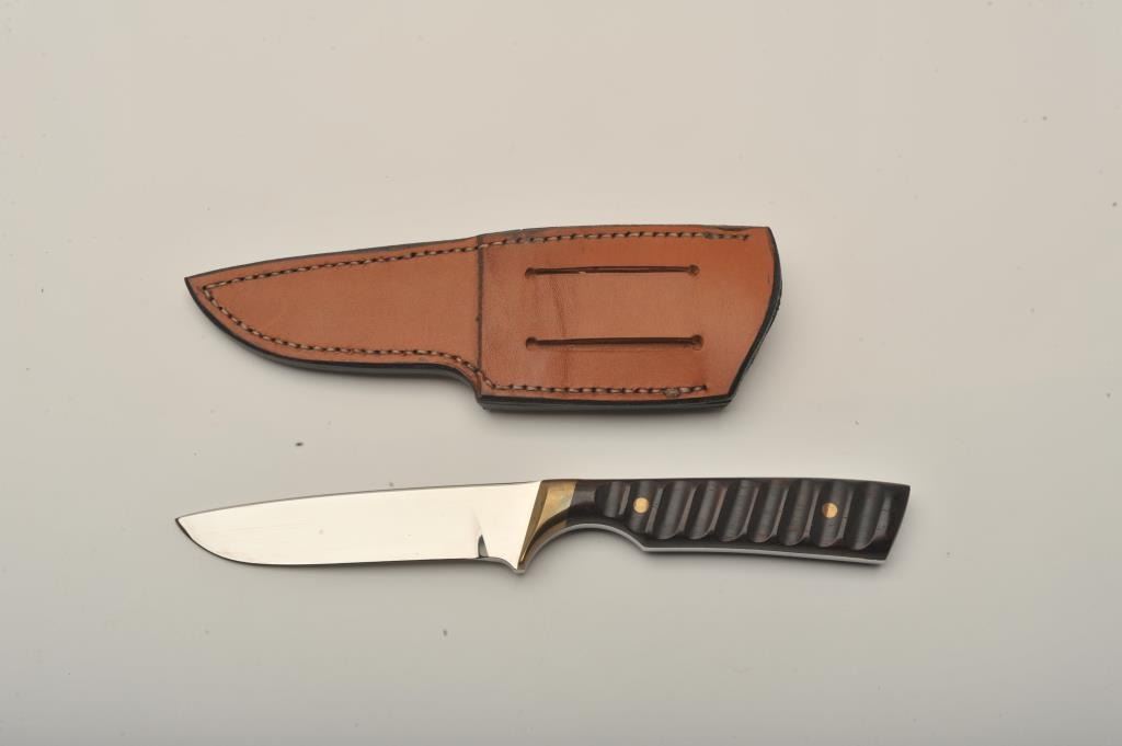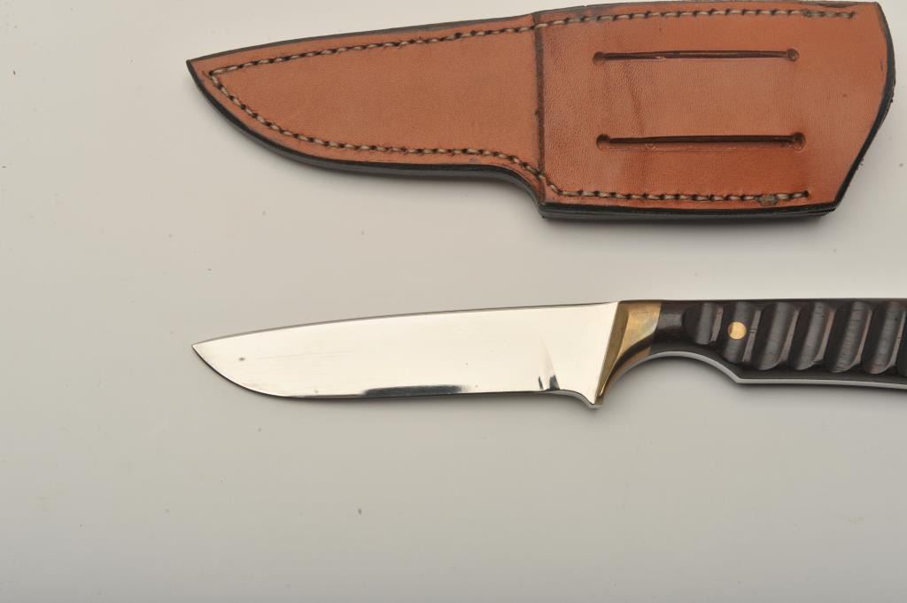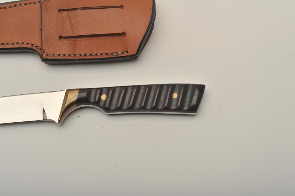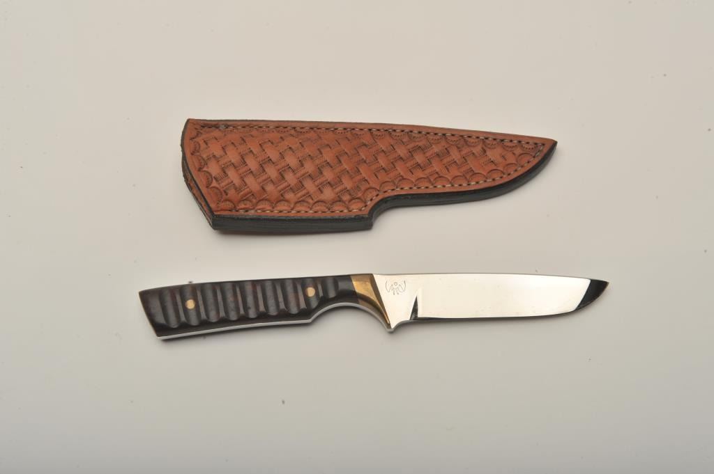 Custom Utility/Hunter fixed blade knife by Peter Marzitelli. The knife has overall dimensions of 1 1/8” x 9 1/8” with a mirror finished blade of 12 C27 stainless steel. The Marzitelli emblem is in front of thehandguard. The scales are ribbed Rosewood and the knife is Serial #67. The lot includes a basket weave pattern leather belt sheath. Est.: $100-$200.