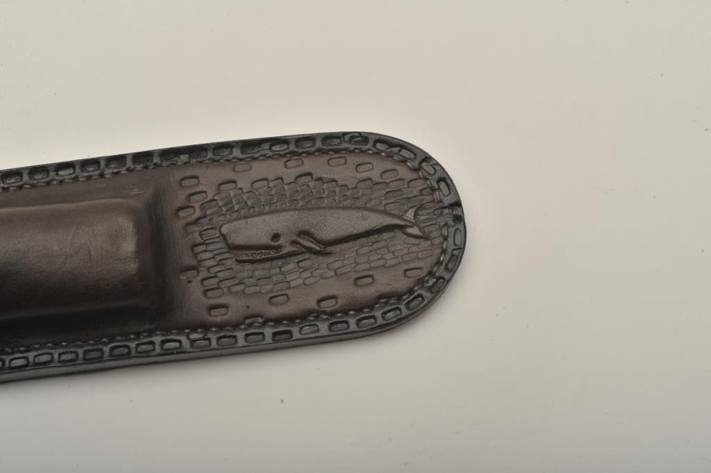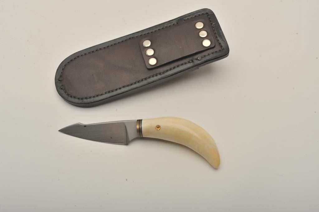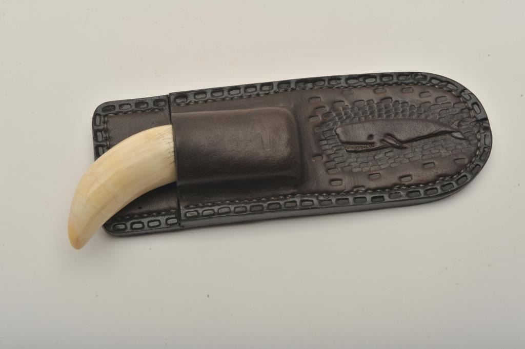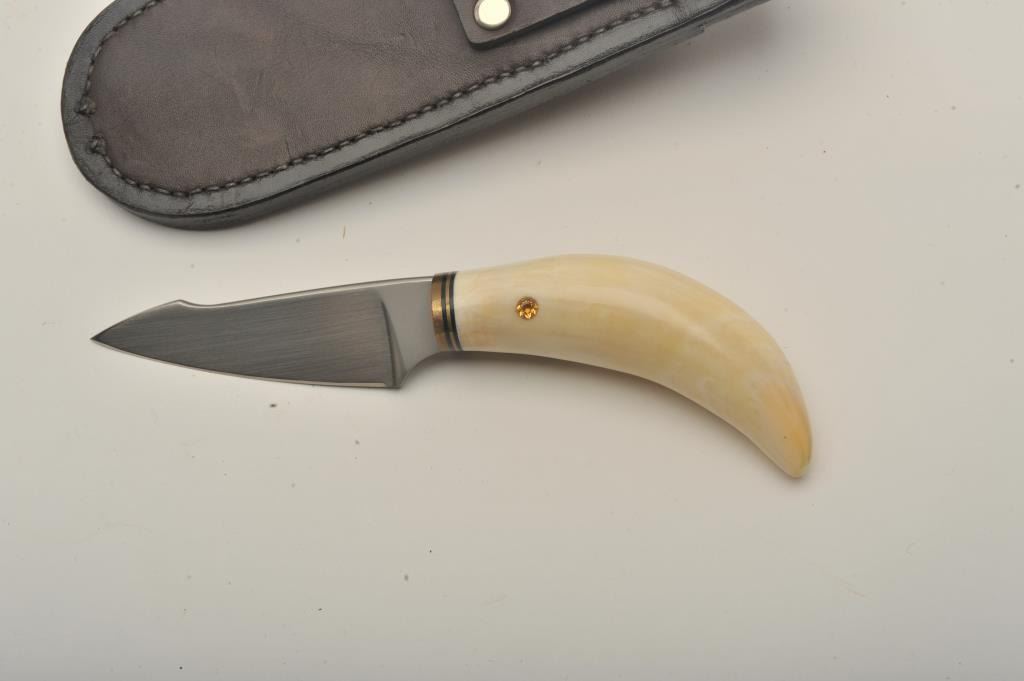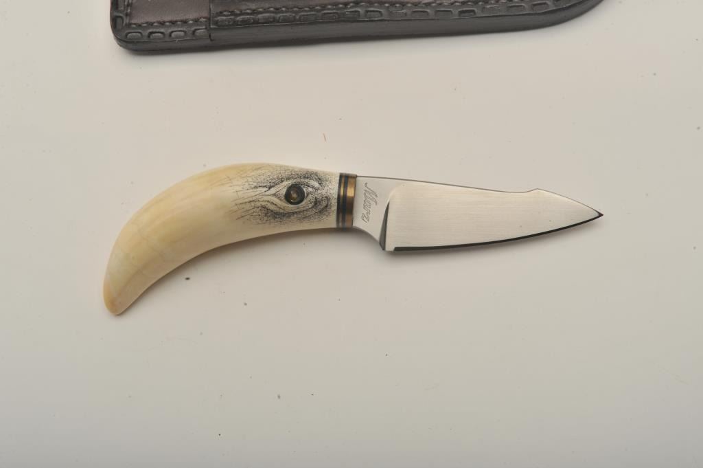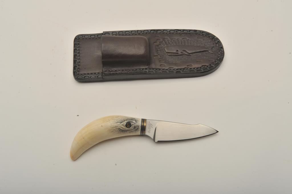 Custom fixed blade utility knife by Peter Marzitelli. The knife is billed as a “Utility-Art” knife by the craftsman. The knife is 1 ½” x 7” in overall dimensions with a satin finished blade of 12 C27 steel,marked “MARZ” at the ricasso. The handle is fashioned of Sperm Whale tooth with brass and fiber fittings. The Whale tooth has inlayed eyes of semi-precious Citrine and scrimshaw on the front. The lot includes a custom hand tooled leather belt sheath with a whale. This an outstanding custom knife with a great look. Est.: $300-$600.