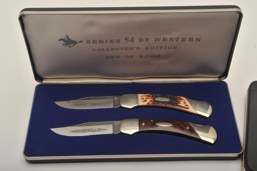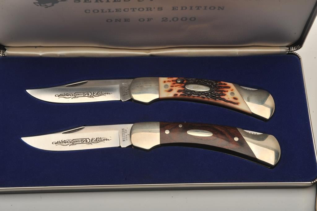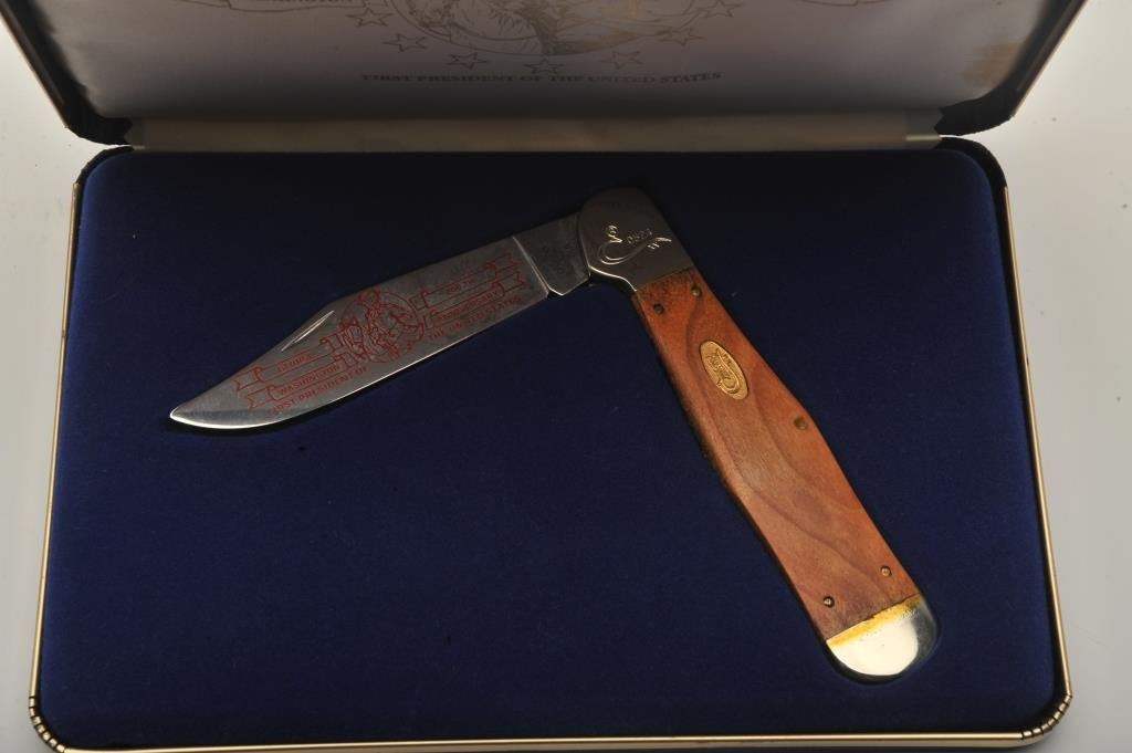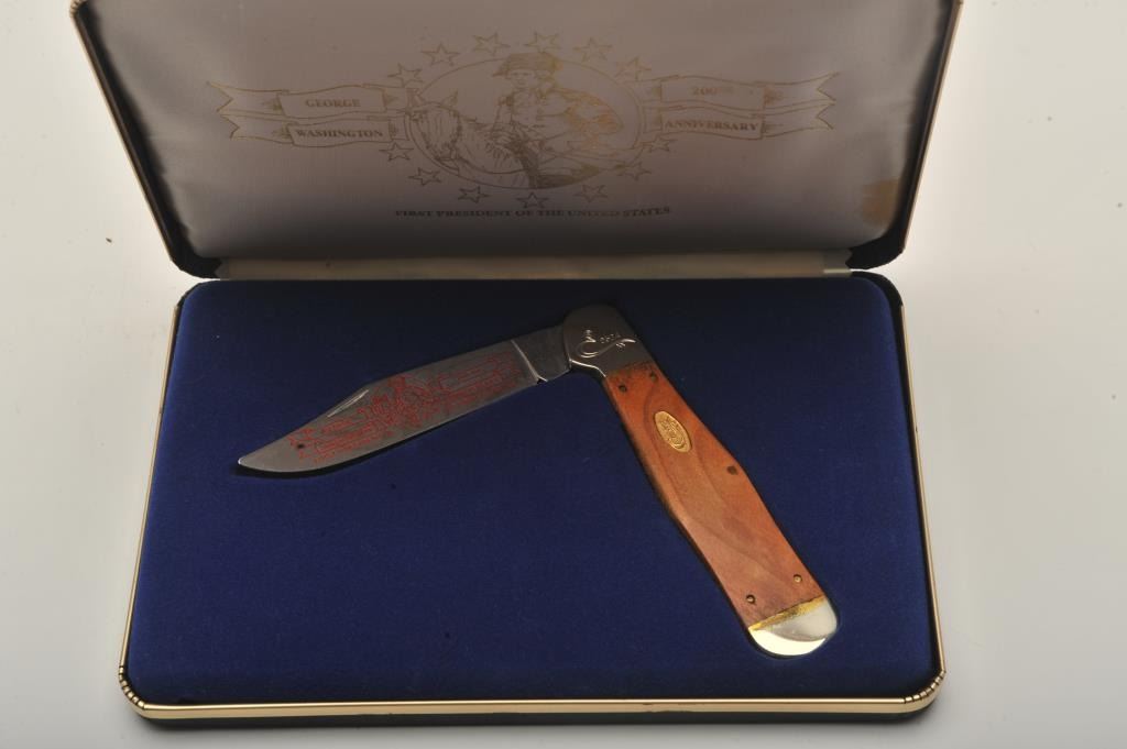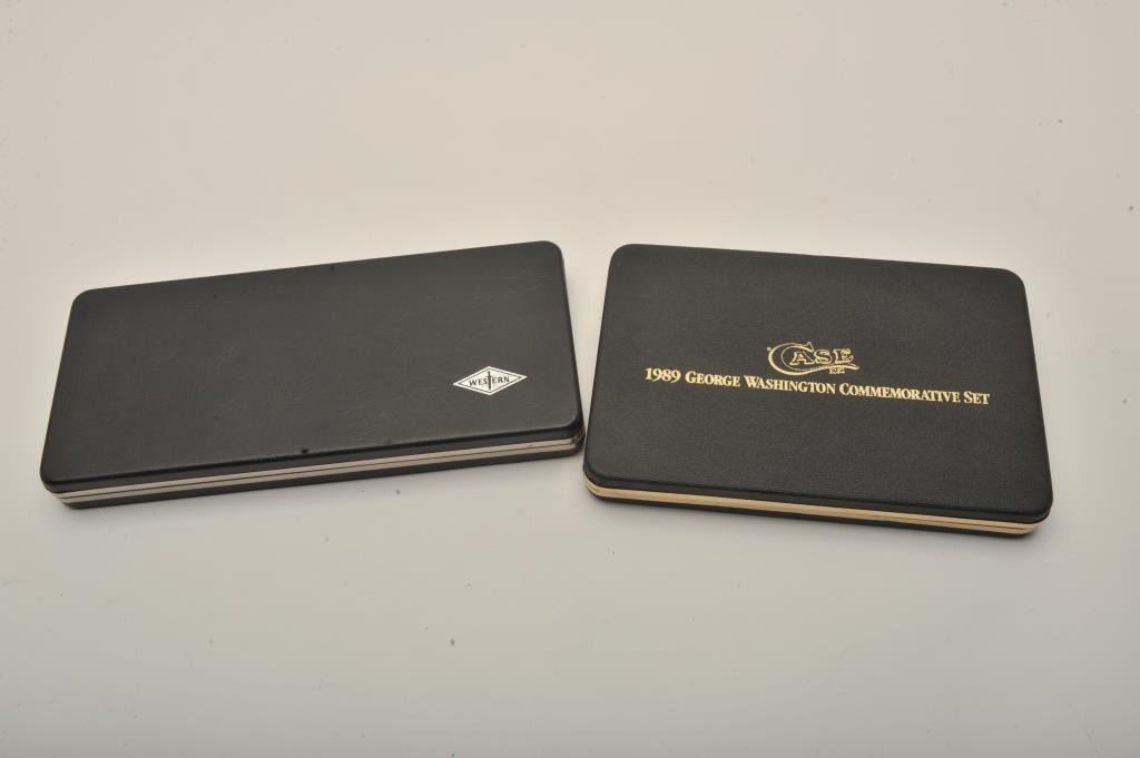 Lot of two sets of commemorative folding knives. One set is a 1989 edition Case XX George Washington commemorative 9 ½” in total length with a 4 ¼” blade and smooth Cherrywood scales. The knife is as new inthe Case box. The second, Series 54 by Western Collector’s edition set of two folders, both are 8 ¾” in overall length with 3 ¾” clip point blades marked, “WESTERN”. One knife has jigged bone scales, the othersmooth hardwood, both with polished nickel hardware. Est.: $100-$200.