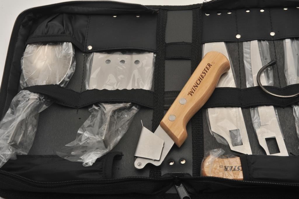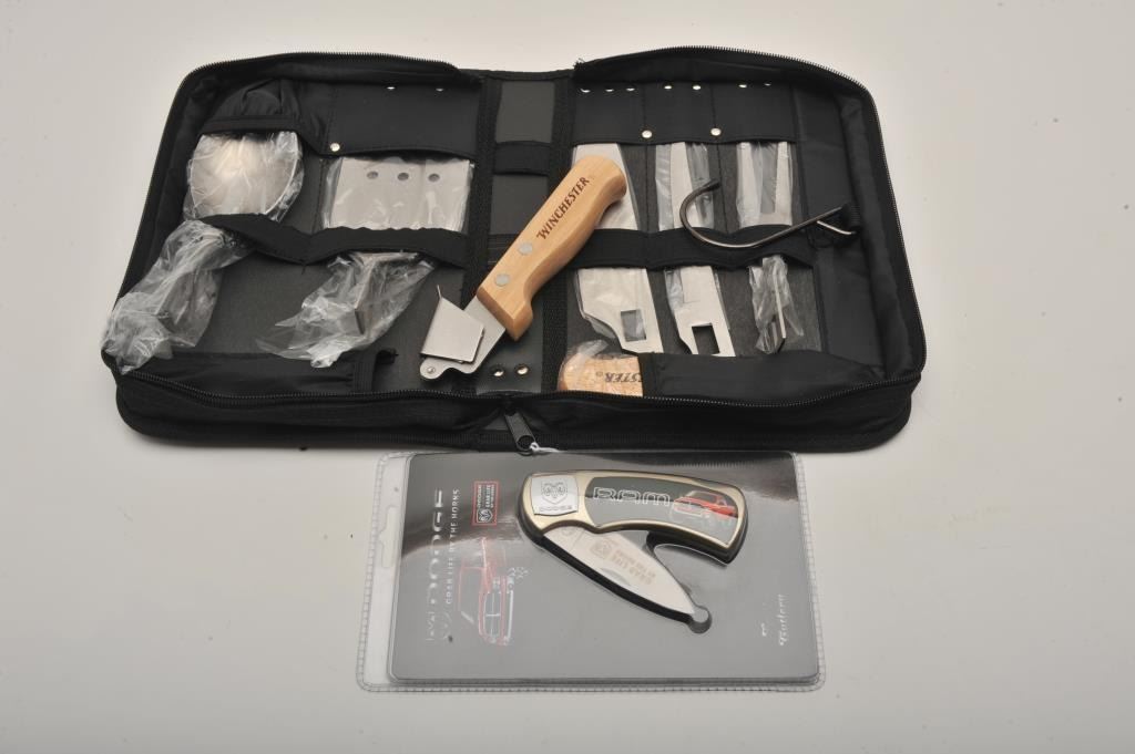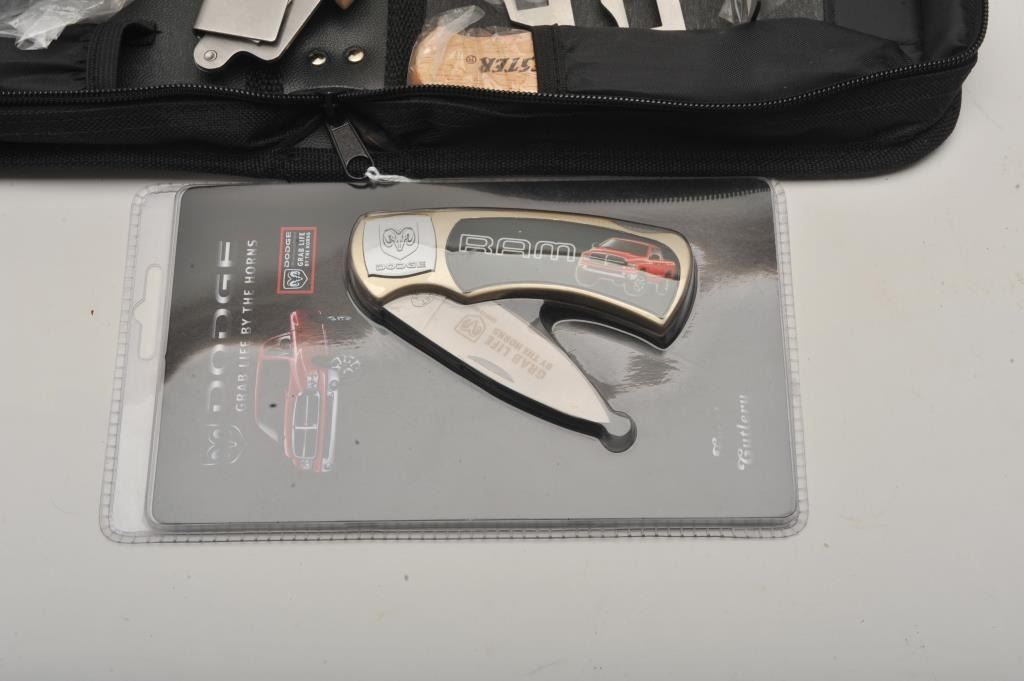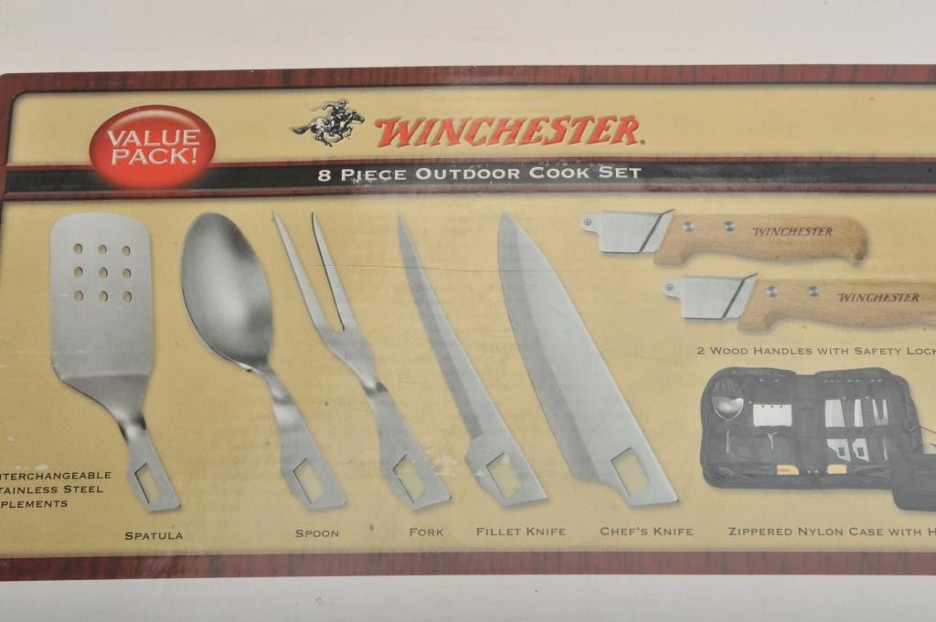The lot includes a Dodge Ram folding knife still new in the blister pack and a Winchester 8 piece outdoor cook set in a ballistic nylon case. The Winchester set includes two Winchester marked wood handleswith knife blade, spatula, spoon and pancake turner attachments. Both items are as new in the original packaging. Est.: $50-$100.