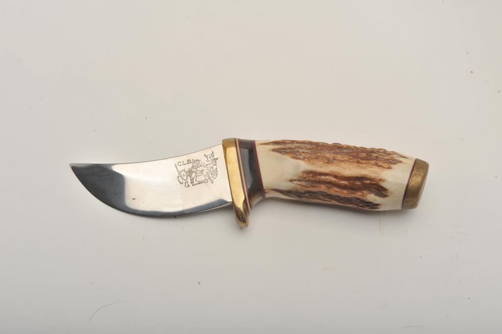 Custom Dave Murphy Skinning knife with stag handle. The knife is approximately 7” in total length with a 3 ¼” high polish stainless steel blade marked, “DAVE MURPHY Blades Gresham, Oregon.” The handle features a brass handguard and pommel cap with red and brown inserts and beautiful stag at the grip. The reverse of the blade is etched, “CLB” and depicts a blacksmith at his forge. Est.: $125-$250.