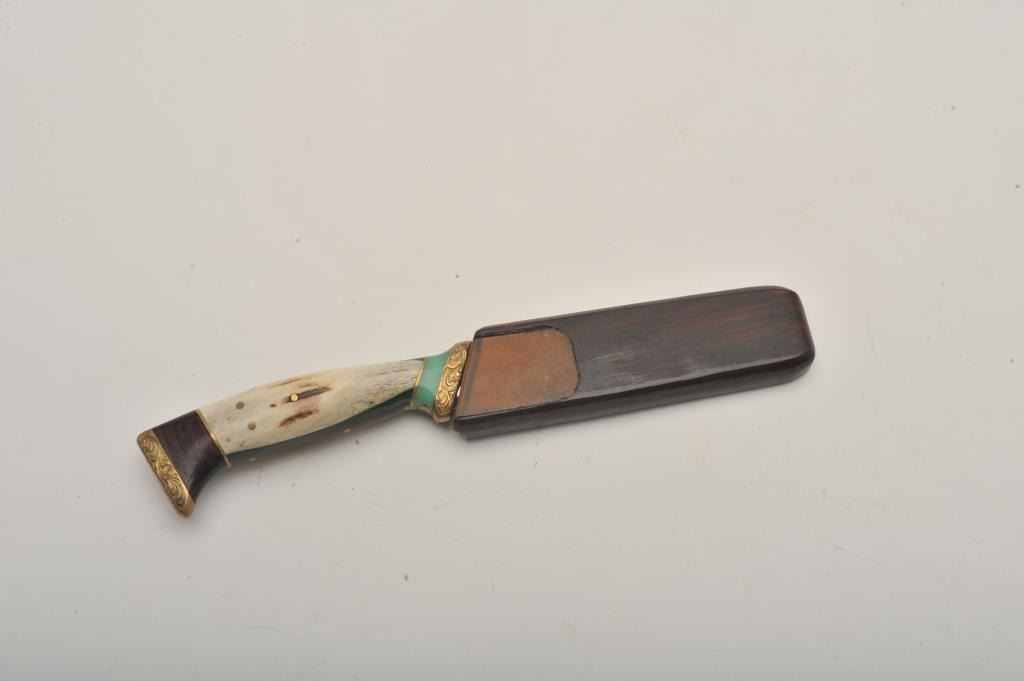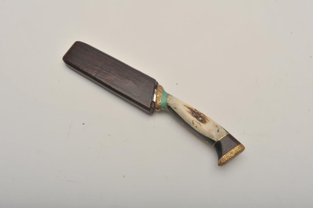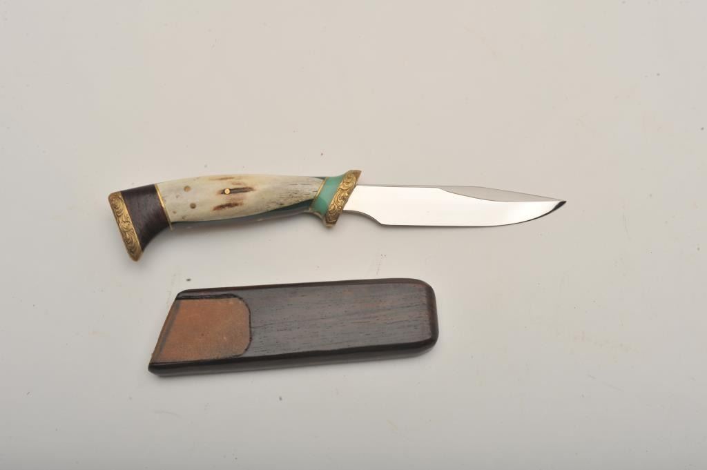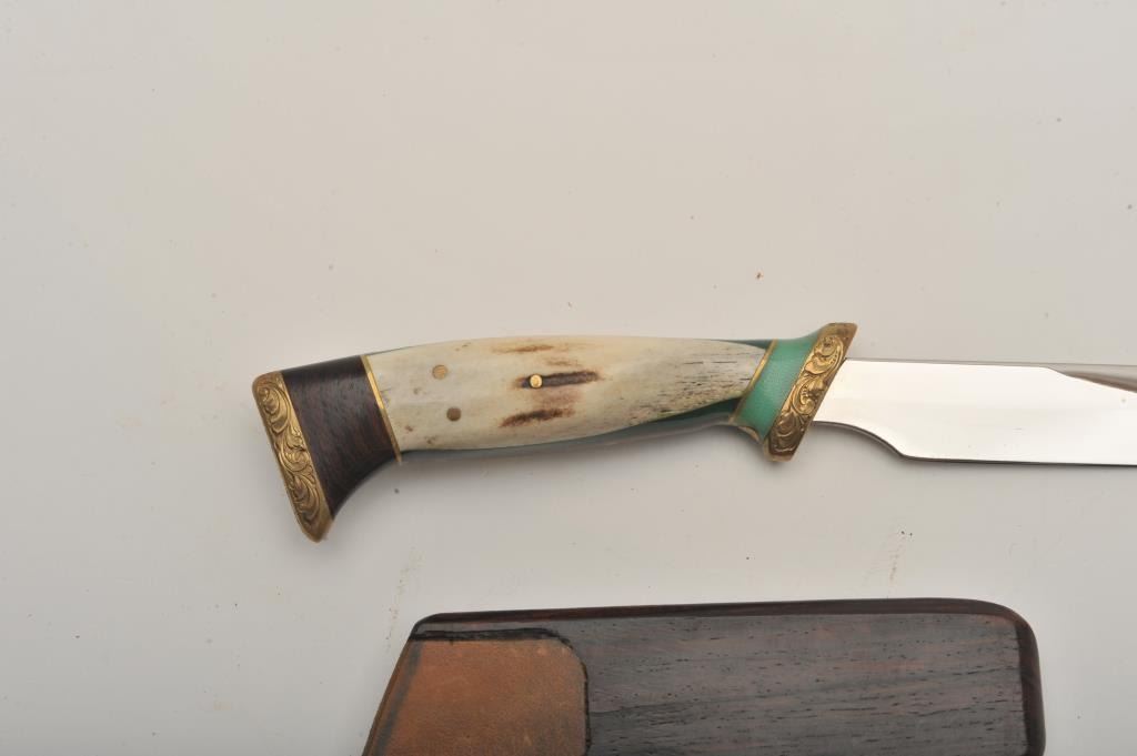 Dave Murphy custom Middle Eastern style fixed blade knife with hard wood scabbard. The knife is approximately 8 ½” in overall length with a 4 ¼” high polish stainless steel blade marked, “DAVE MURPHY Blades Gresham,Oregon.” The blade shows no sharpening or use. The handle is ornately done with engraved brass handguard and pommel, light and dark green stone inserts, brass pins and beautiful stag scales. The lot includes acustom hardwood scabbard. This is a beautiful knife with stunning grips by a famous maker who began his career with Gerber. Est.: $200-$400.