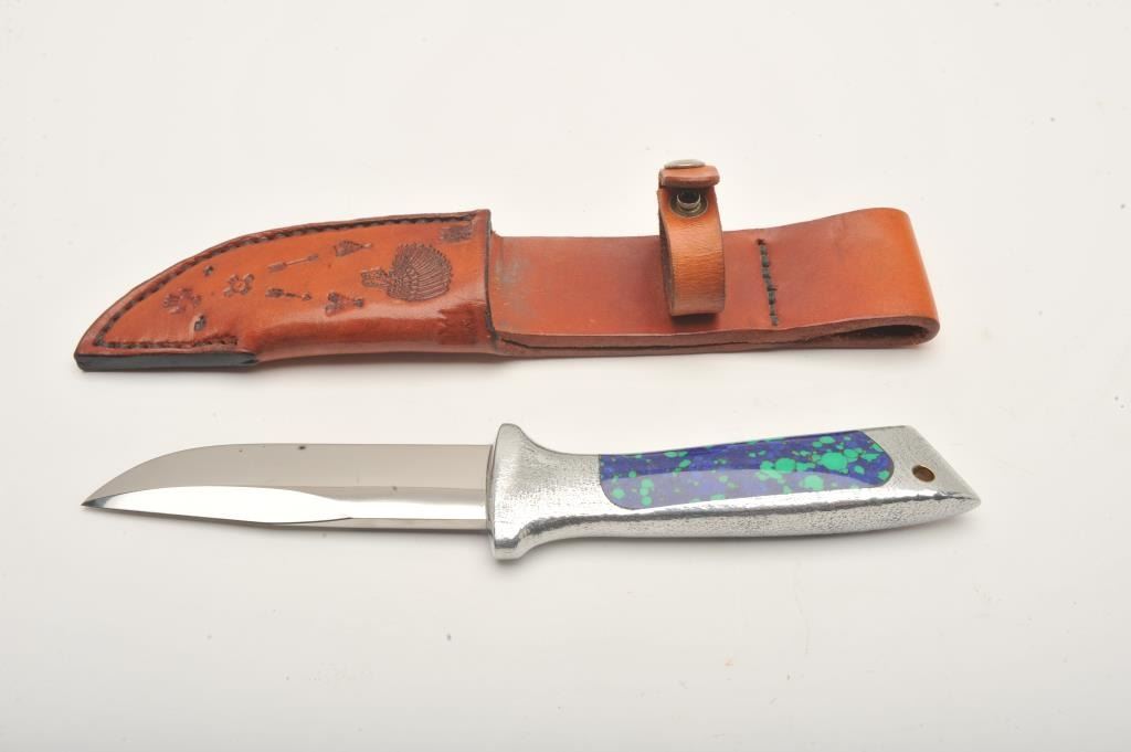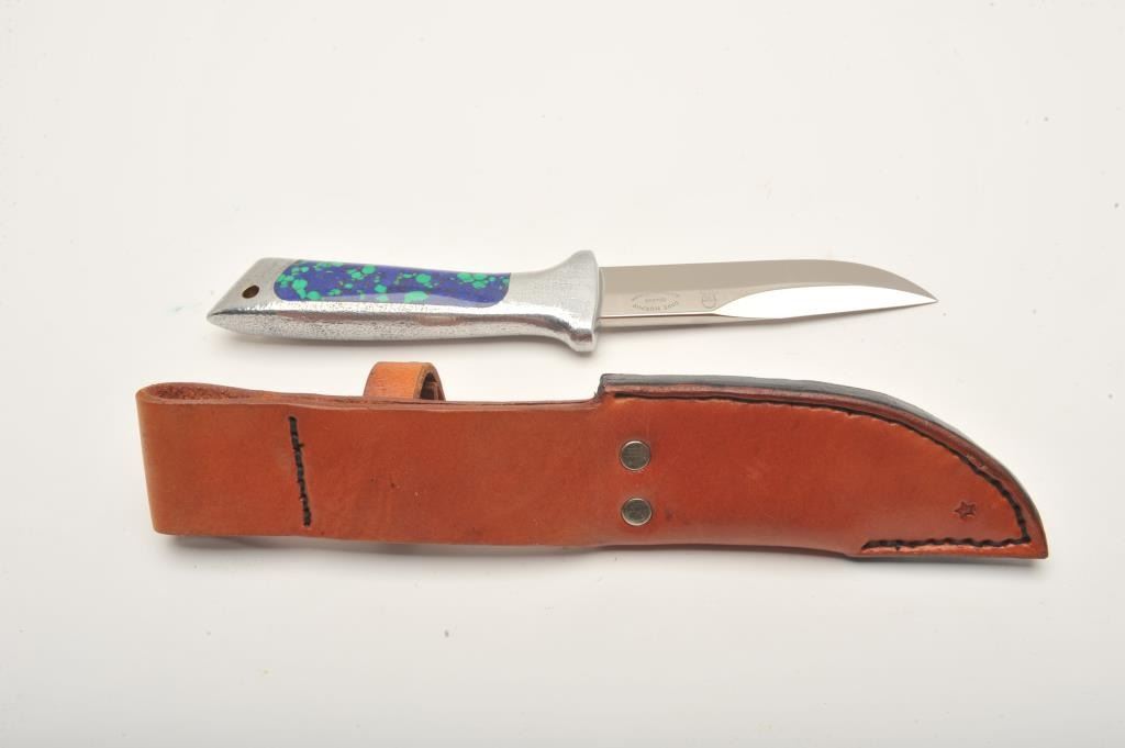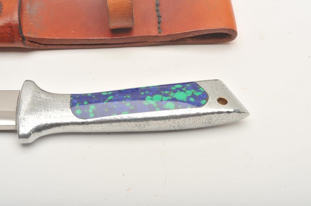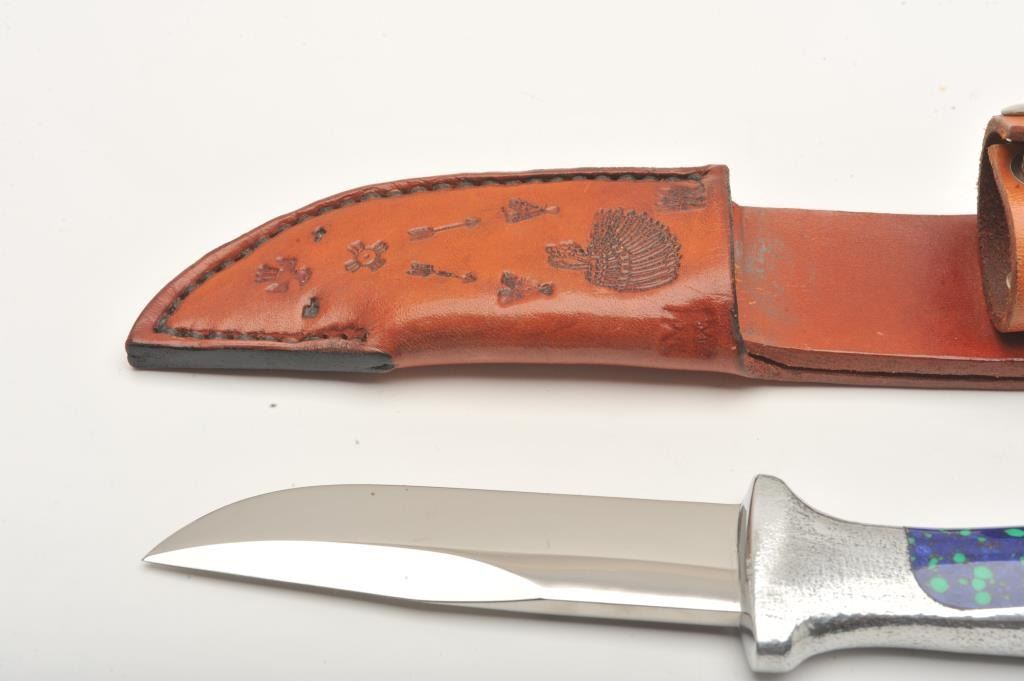 Fixed blade Hunting knife by Dave Murphy Blades of Gresham, Oregon. The knife is in very good condition 10” in overall length with a 4 ¾” blade. The blade shows a high polish finish and is marked with Murphy’sname and his likeness at the base of the blade. The knife features a cast aluminum handle with blue and turquoise acrylic inserts. The knife is in excellent condition showing little use and only handling marks. The lot includes a custom tooled leather belt sheath. Est.: $150-$300.