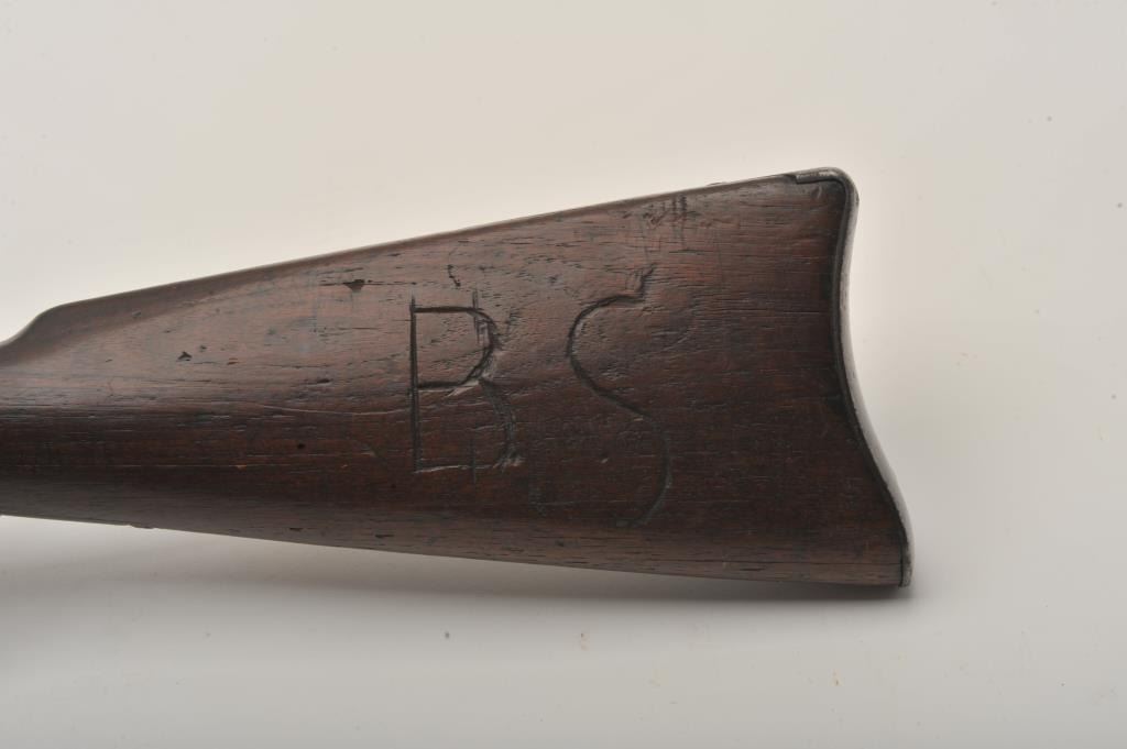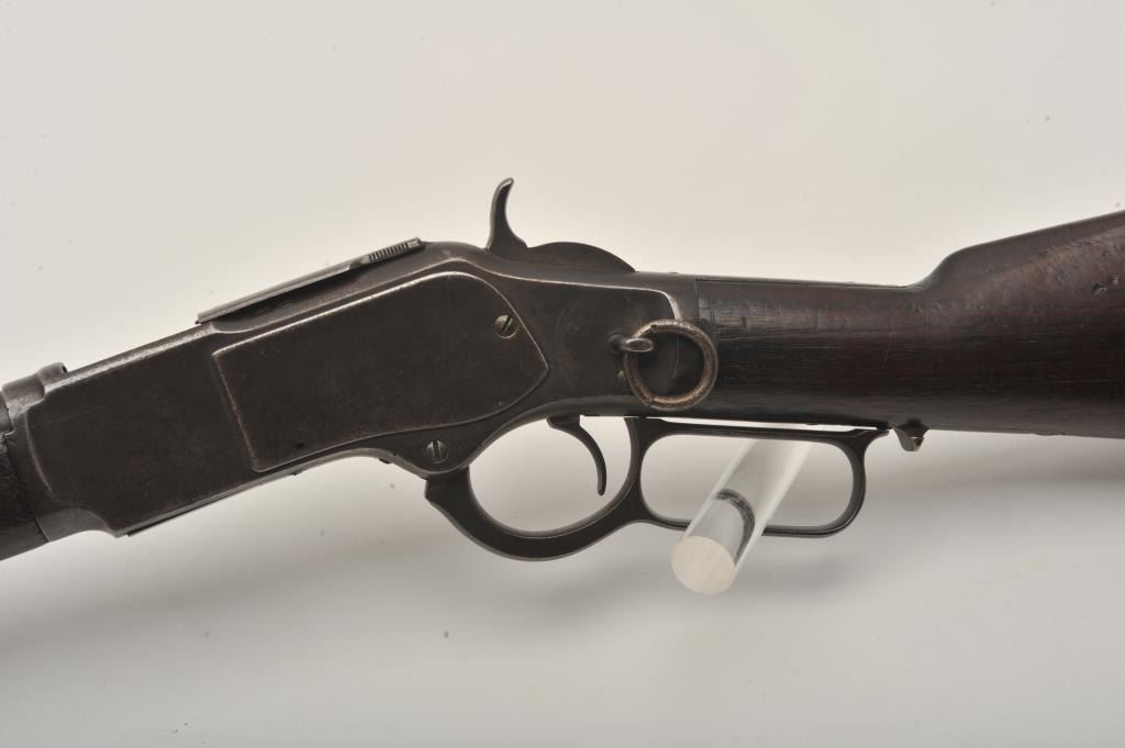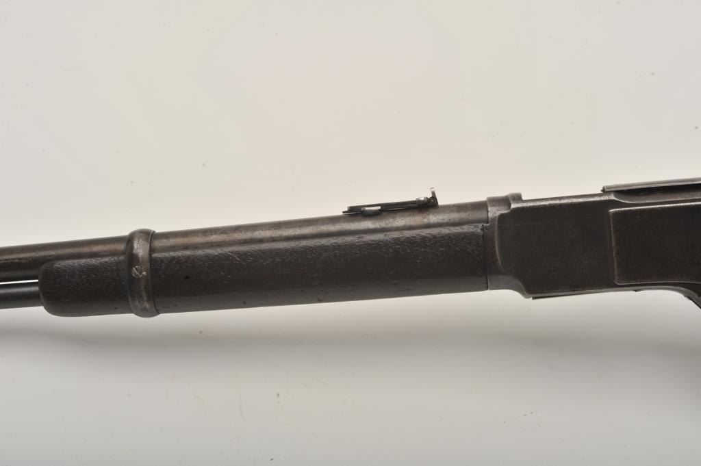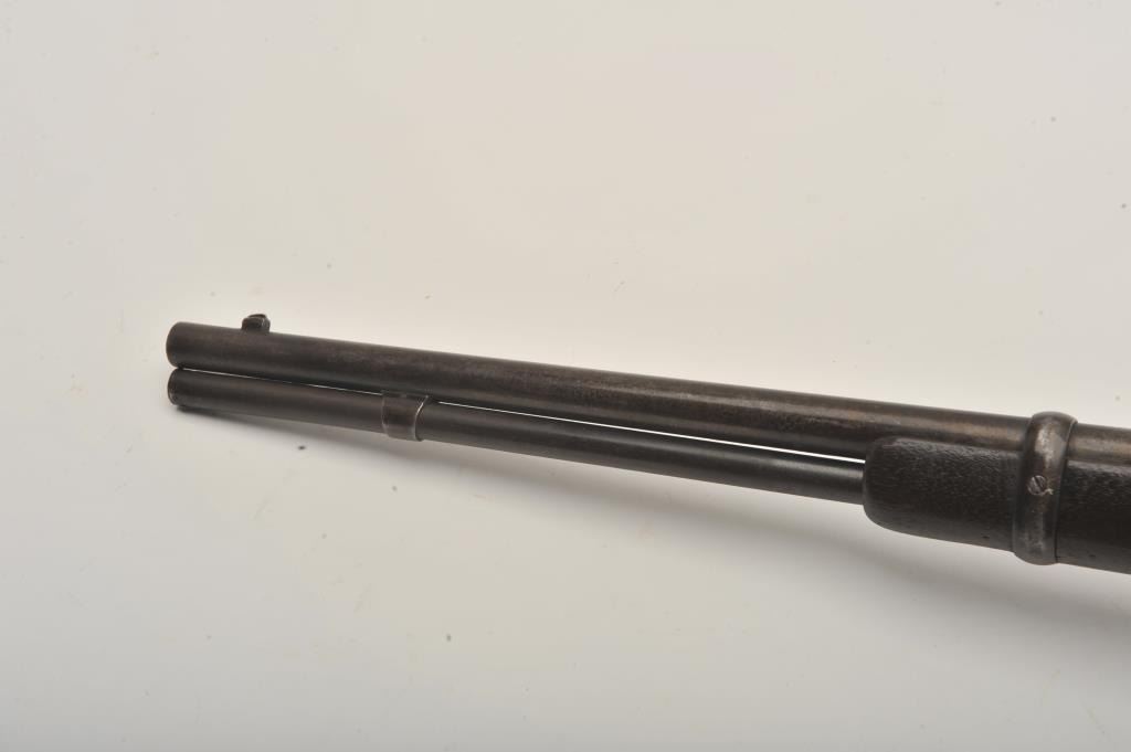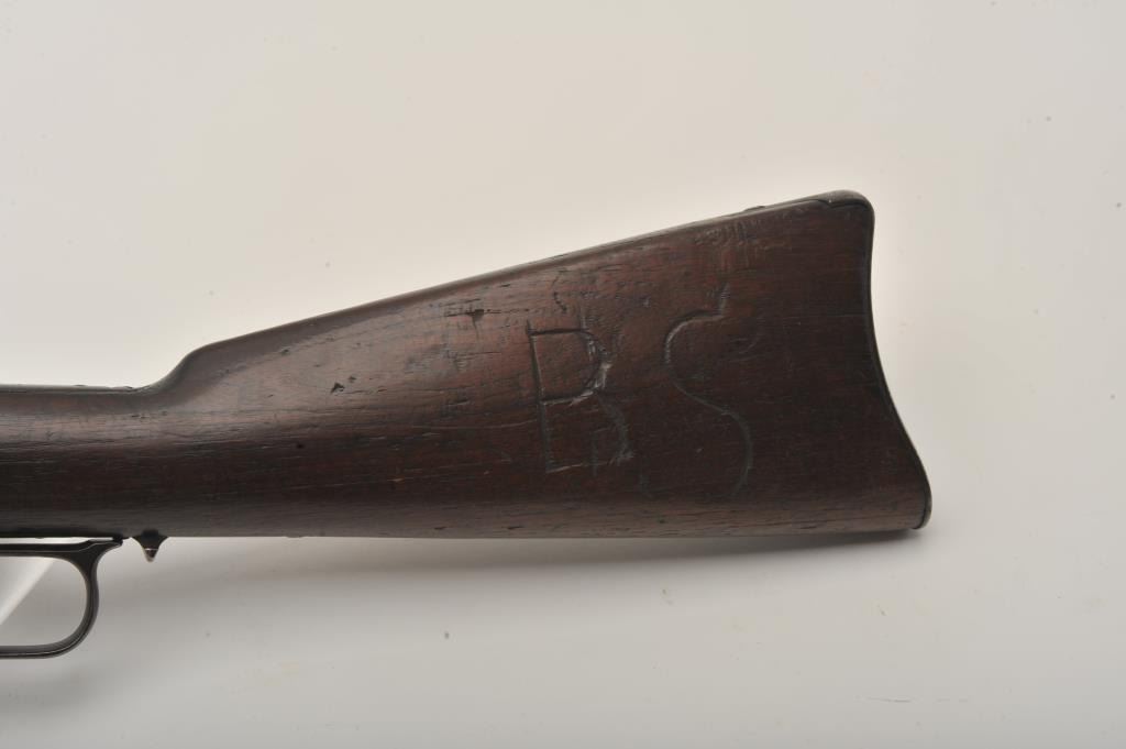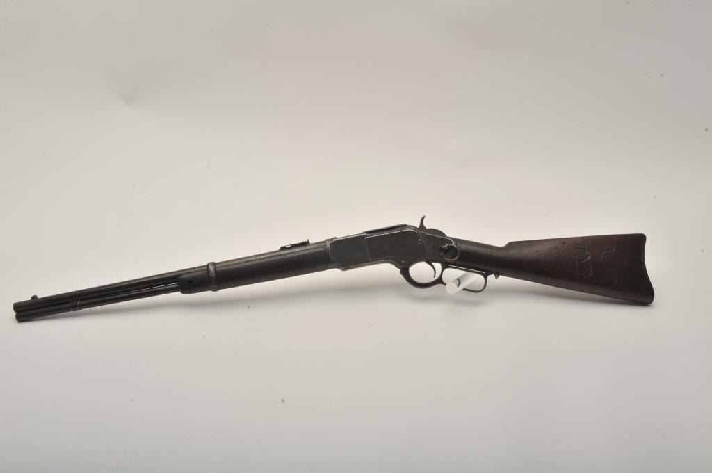 Very scarce in this caliber Winchester Model 1873 lever action SRC, .32 W.C.F. caliber, 20ā round barrel, blued finish, wood stocks, S/N 335828B, in overall good to very good condition displaying a pleasing dark patinato metal surfaces, good bore, crisp action, good markings and overall good wood showing scattered old mars, dings and scratches from carry and storage; also large old initials āB. Sā carved into left side of butt stock. (Antique). Est.: $2,000-$4,000.