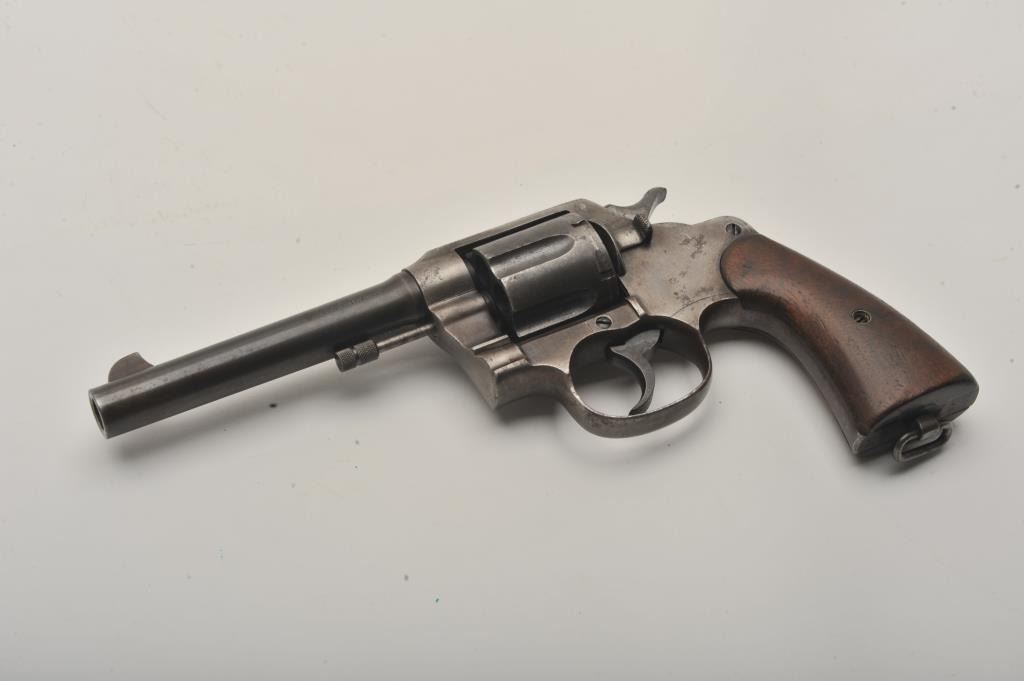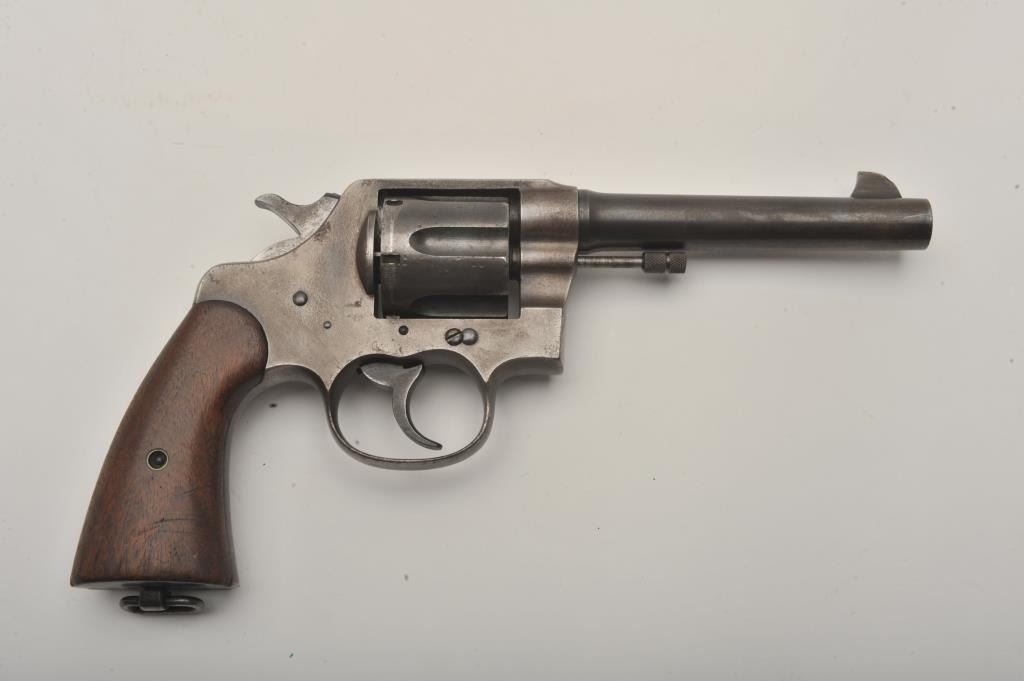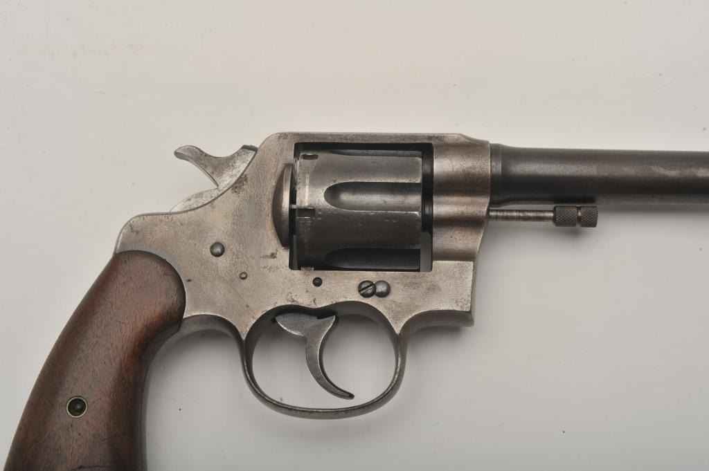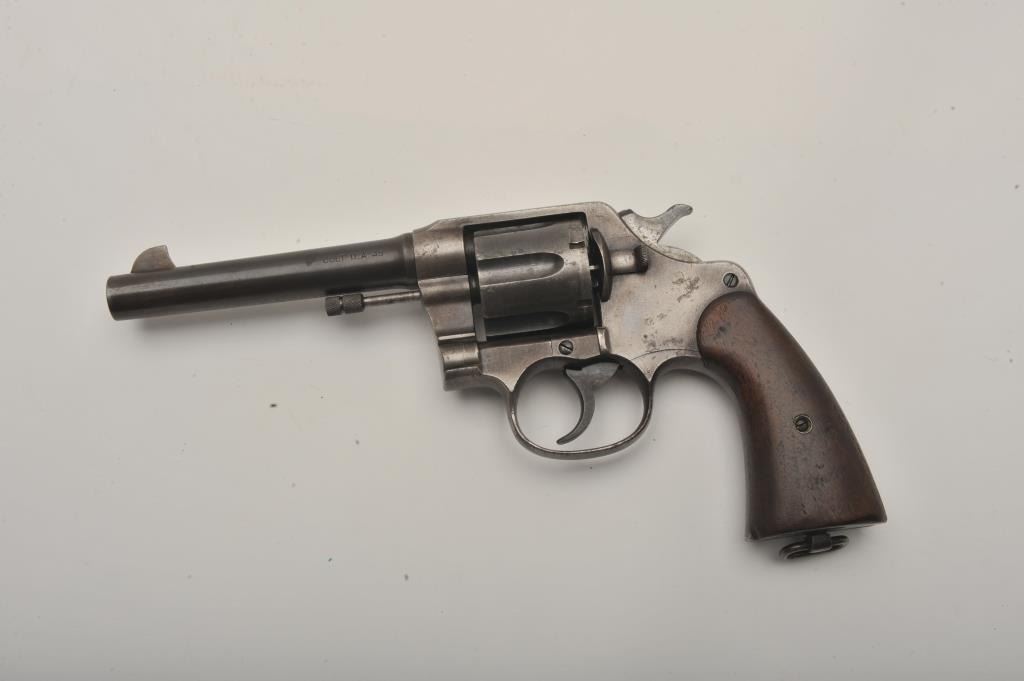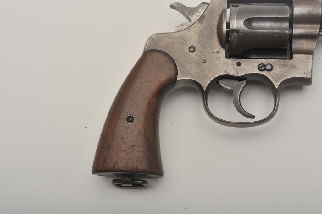Colt U.S. Property marked Model 1917 DA revolver, .45 caliber, 5.5” barrel, blued finish, wood grips, lanyard ring, S/N 239592 (U.S. Army #87888 on butt strap); overall good + condition with traces of original blue in protected areas, good action, good markings, good to very good bore and grips. (C&R). Est.: $350-$700.
