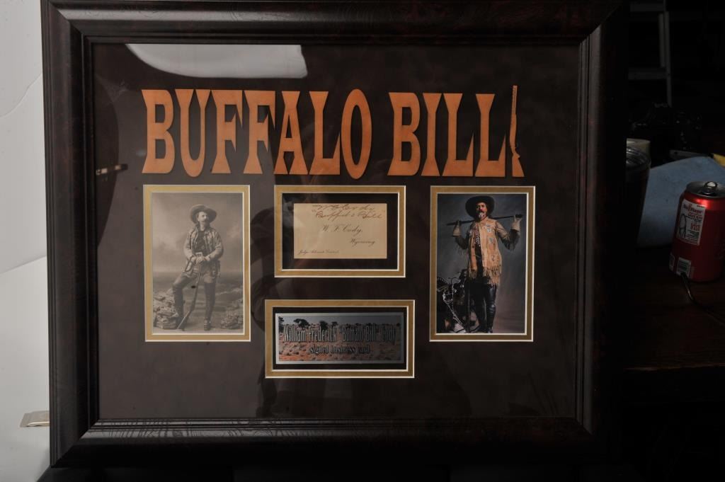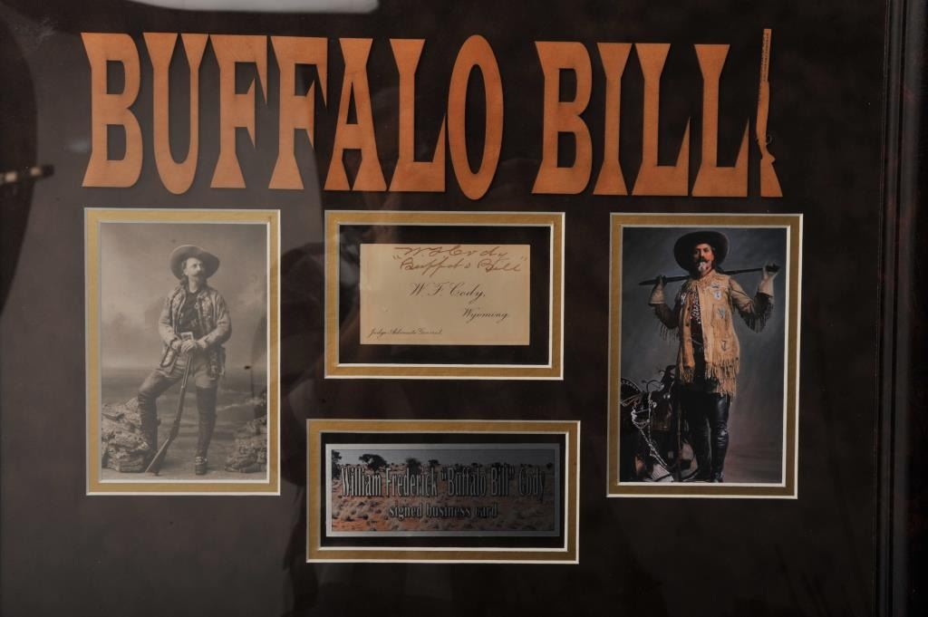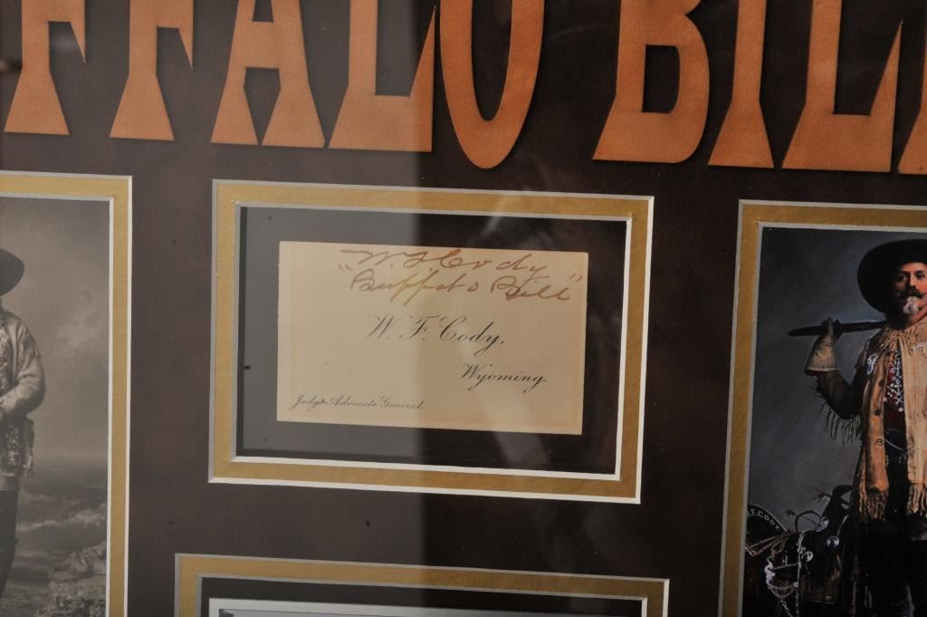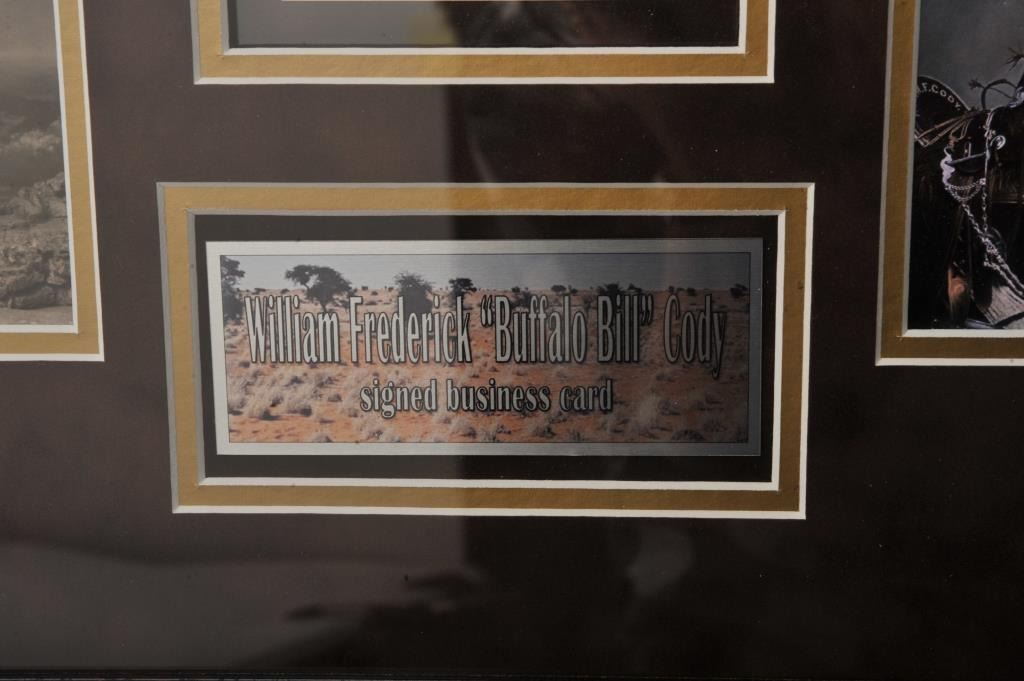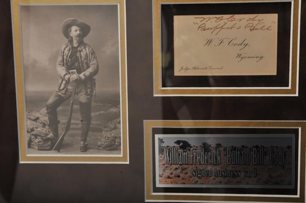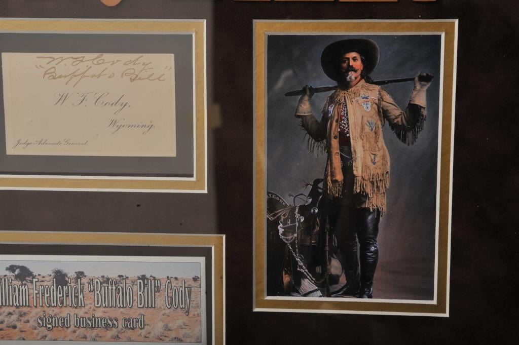 Beautifully framed and matted Buffalo Bill business card signed “W.F. Cody/Buffalo Bill” arranged with two photos of Cody in his buckskin outfit and rifle; overall approximately 18” x 23”. Est.:$300-$600.