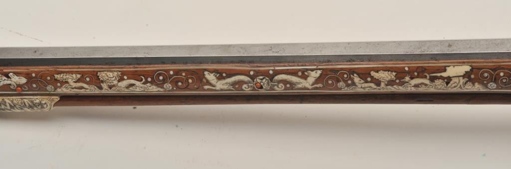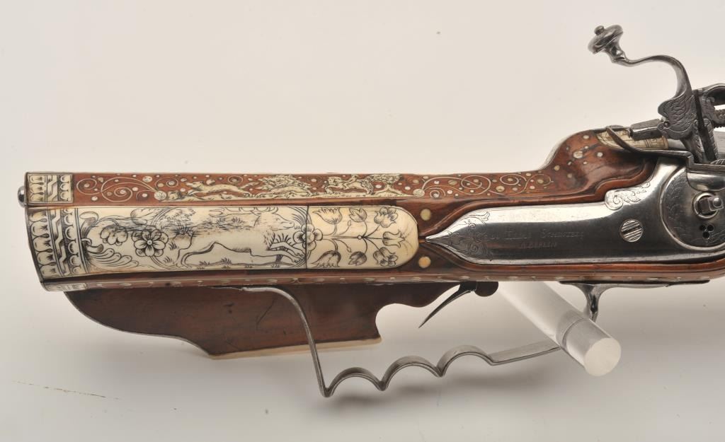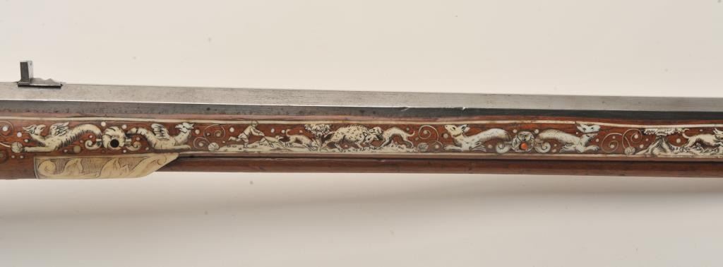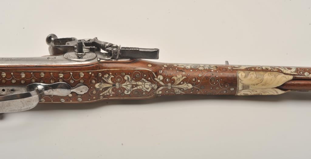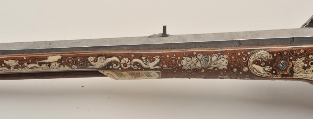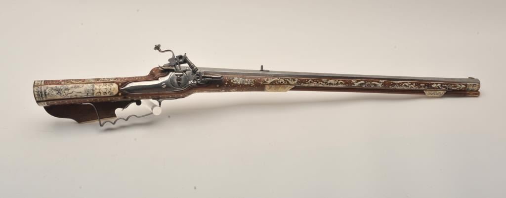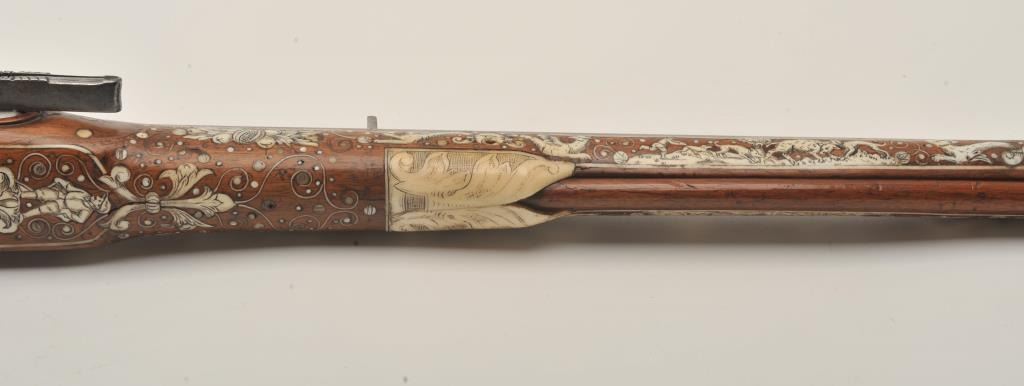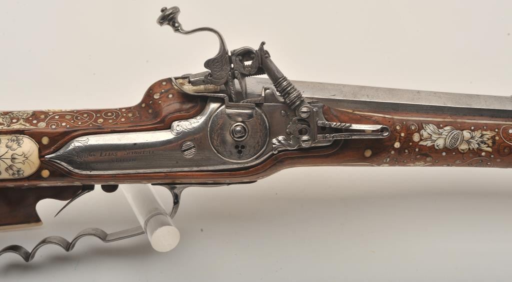 Fine original 17th century inlaid Wheelock rifle signed “Elias Schintzel A Berlin”. Measures 40 ½” overall with a 28 ½” barrel of .70 caliber smoothbore. Intricate bore inlay in game scenes with dot and scroll borders.Quality engraving and metal work. Very well-known and high grade German maker (see Shumway-Jaegar rifles). Near fine original condition with 98% plus original inlay intact. A terrific gun suitable for finestcollection or museum. Interior lock parts intact with interior period spanner. (Antique) Est.: $20,000-$40,000