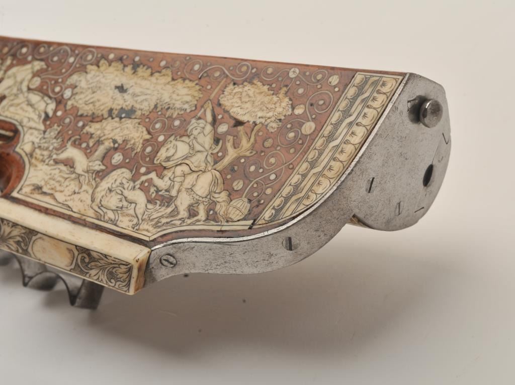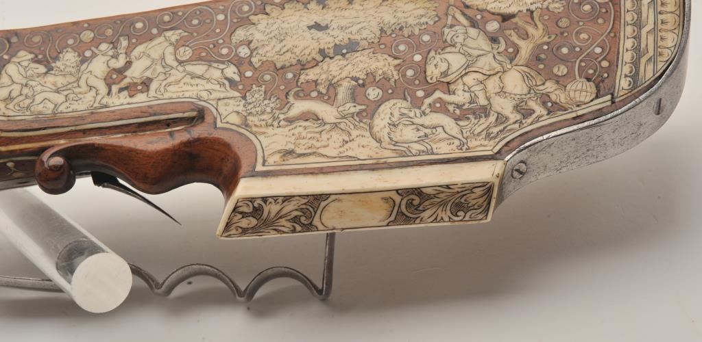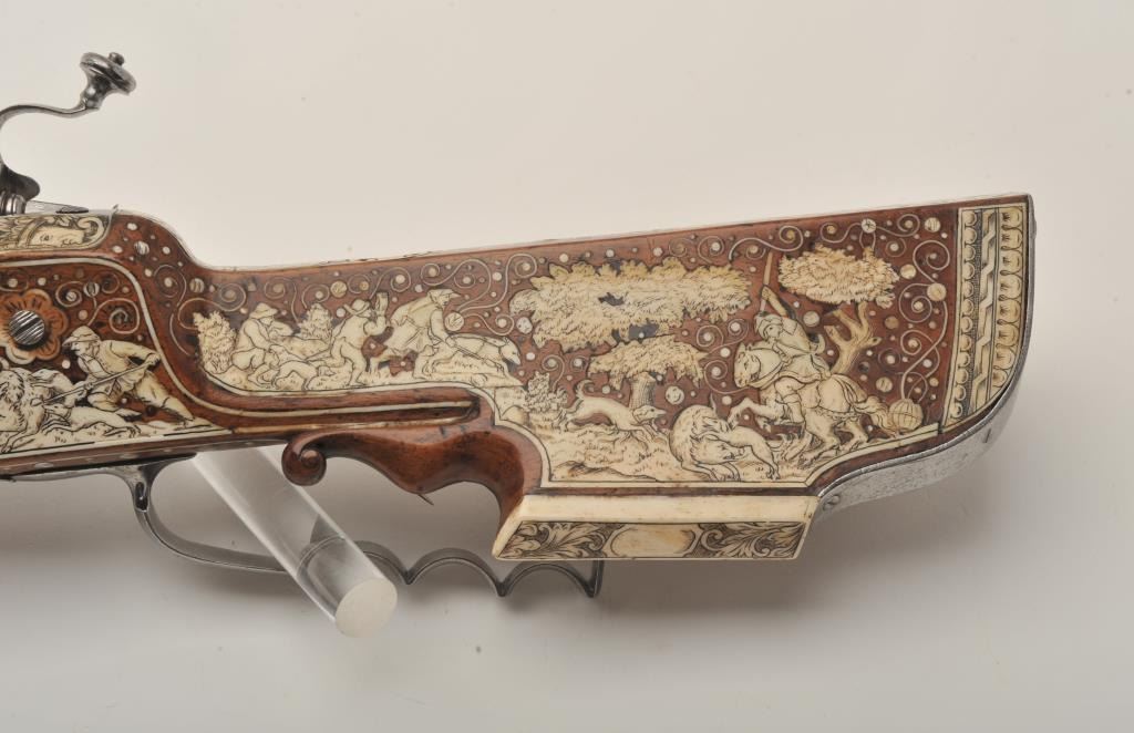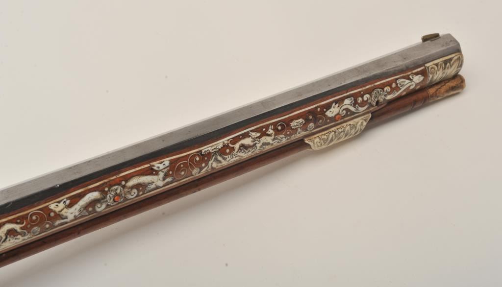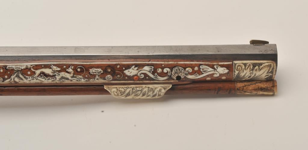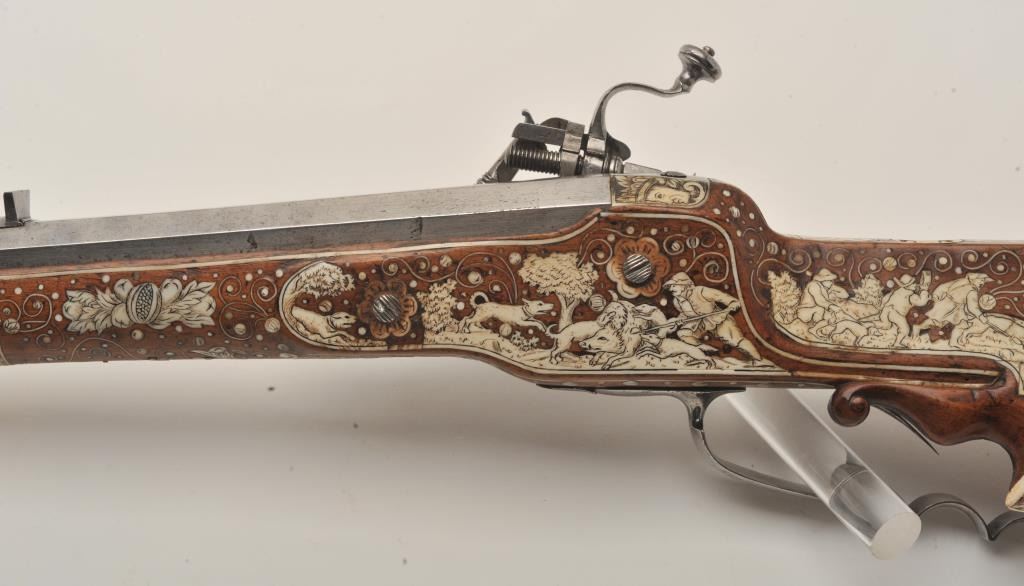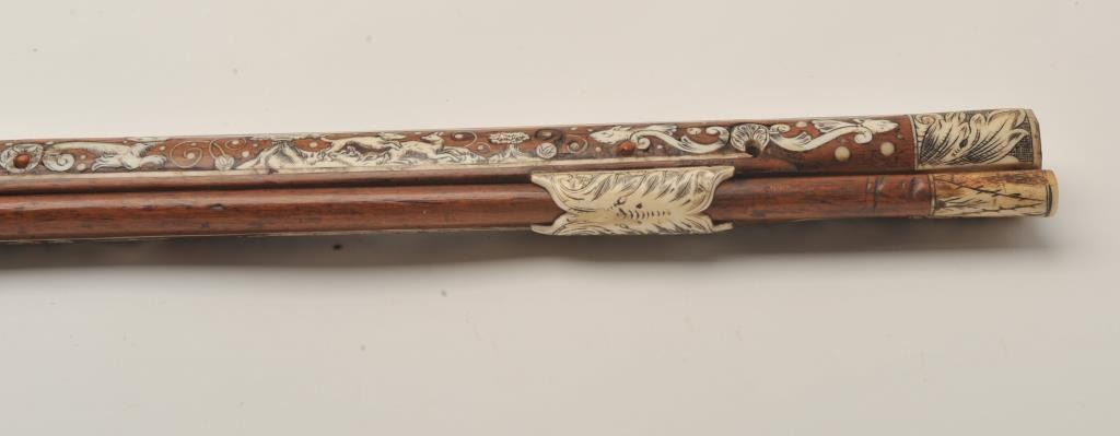 Fine original 17th century inlaid Wheelock rifle signed “Elias Schintzel A Berlin”. Measures 40 ½” overall with a 28 ½” barrel of .70 caliber smoothbore. Intricate bore inlay in game scenes with dot and scroll borders.Quality engraving and metal work. Very well-known and high grade German maker (see Shumway-Jaegar rifles). Near fine original condition with 98% plus original inlay intact. A terrific gun suitable for finestcollection or museum. Interior lock parts intact with interior period spanner. (Antique) Est.: $20,000-$40,000