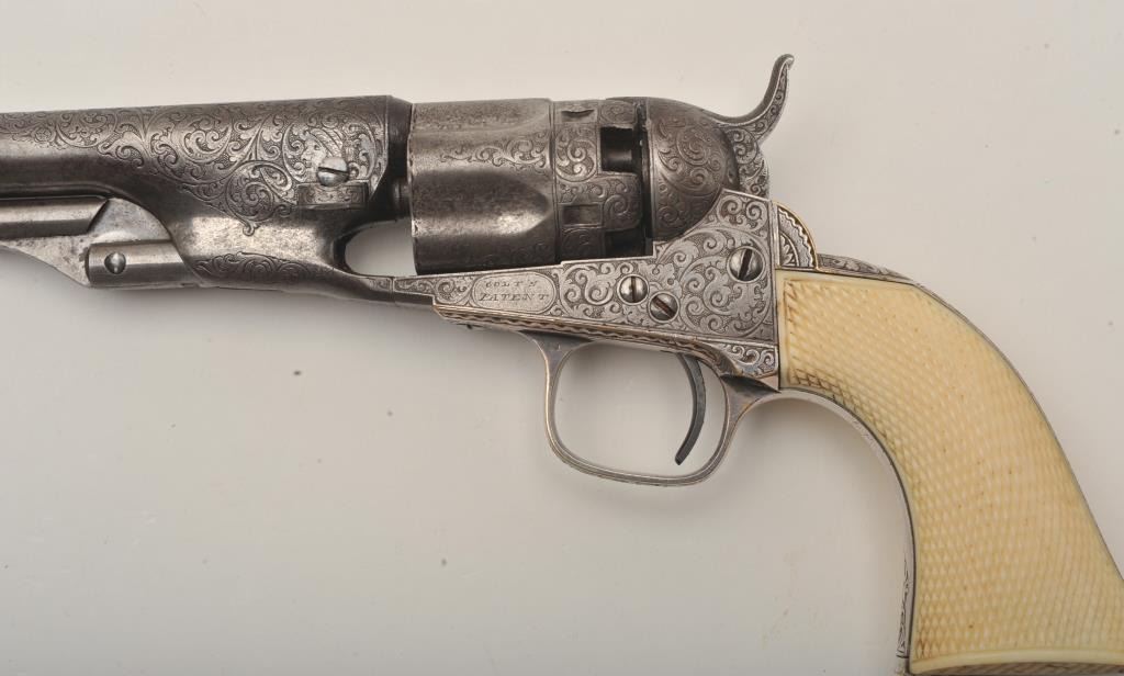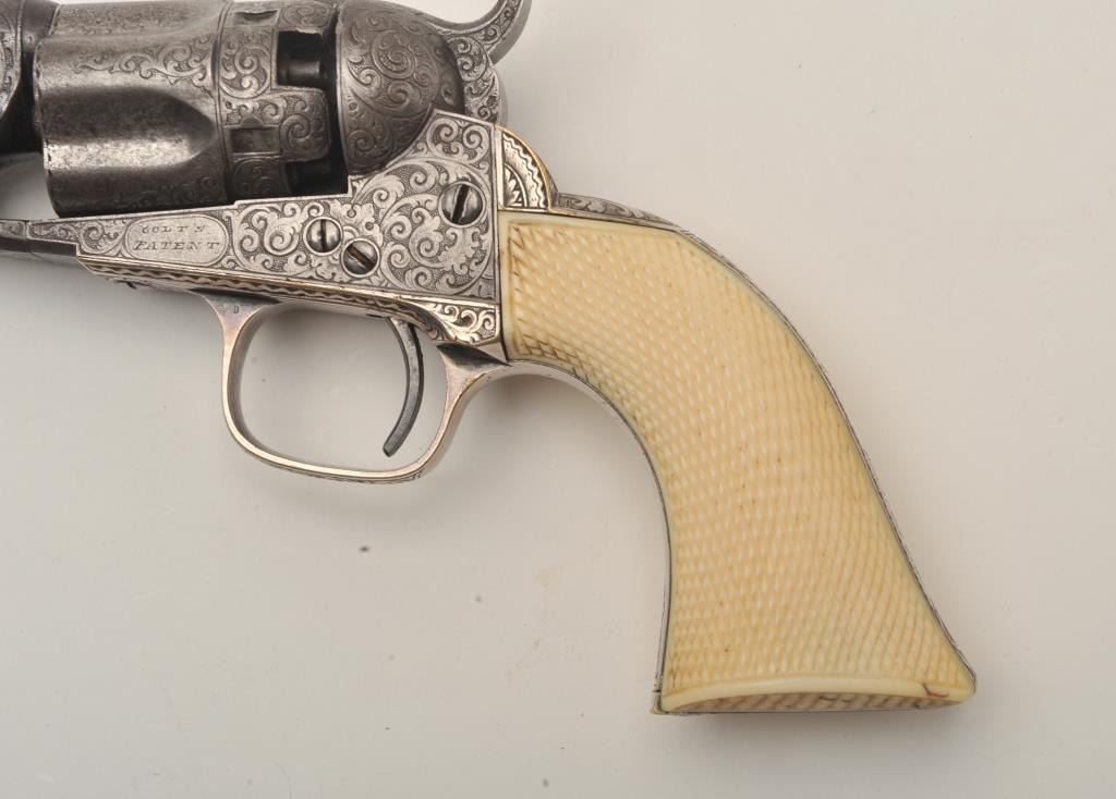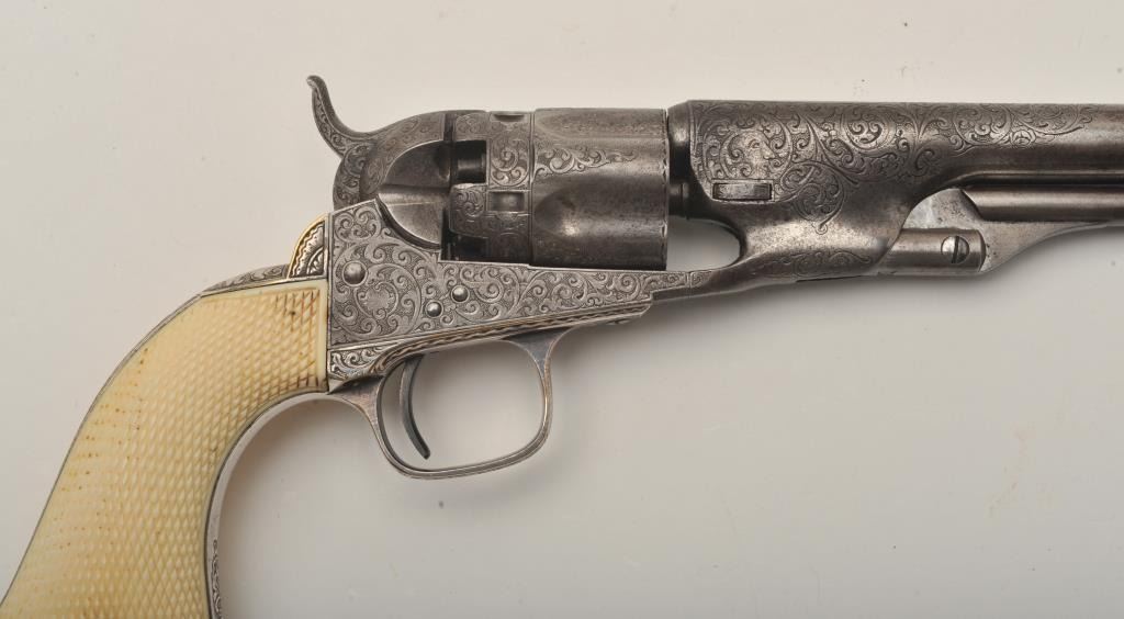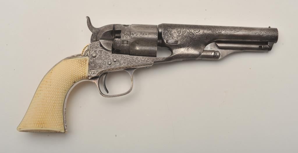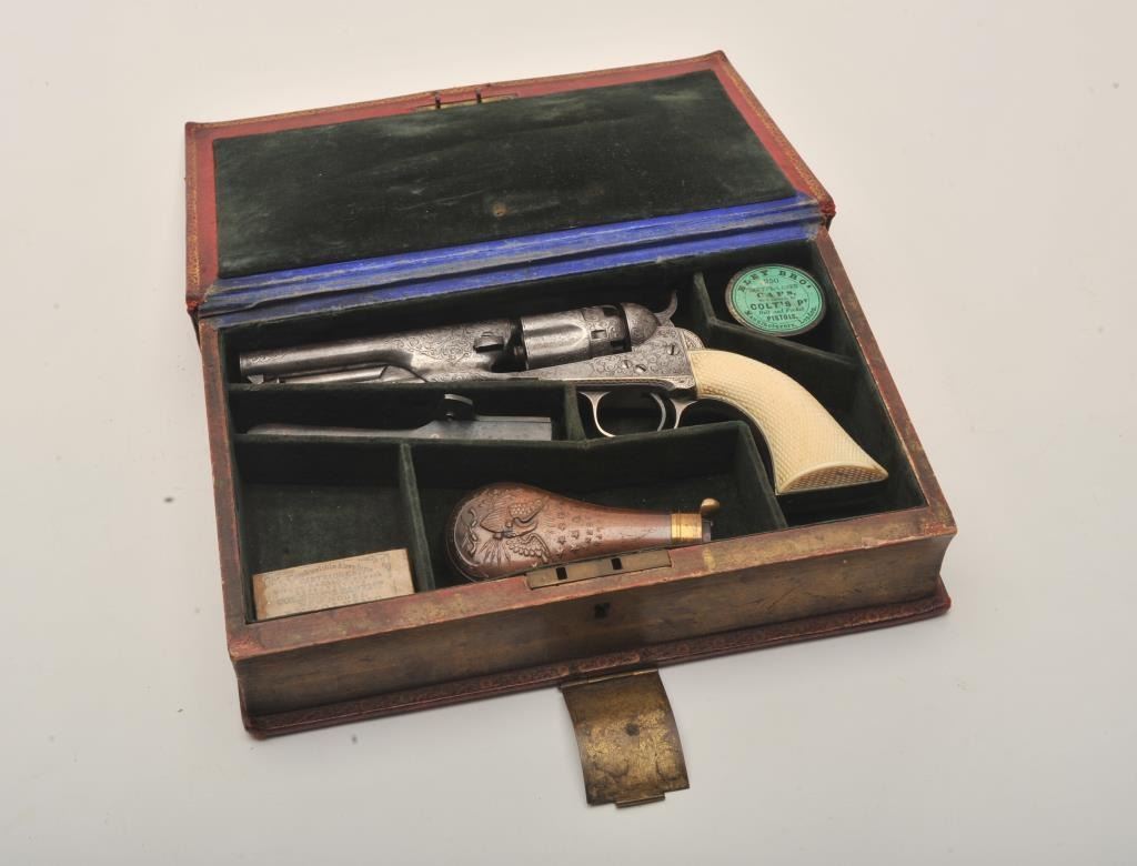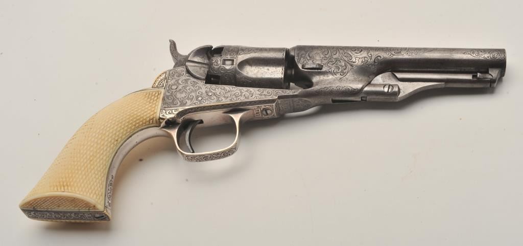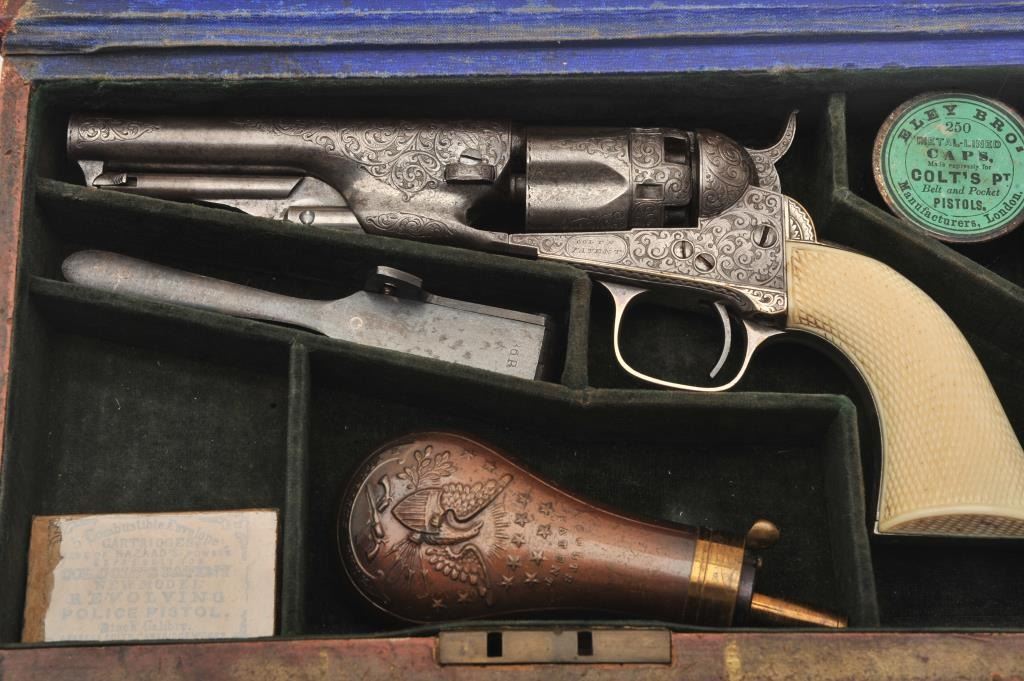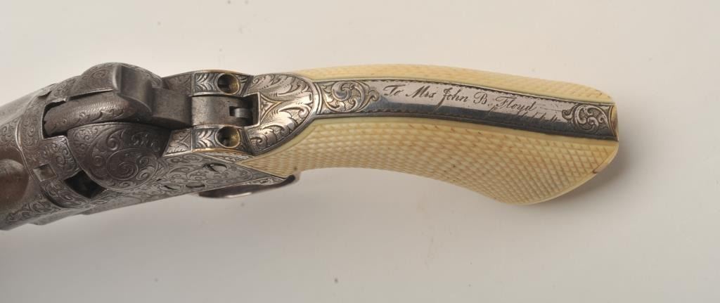 Important Sam Colt Presented 1862 Police to Mrs. John B. Floyd in its original book case. An iconic and well known pistol most recently illustrated in the Colt Engraving book (Full page #182). Only 1 of 2 knownpresentations made by Colt to ladies, the other to Mrs. Cobb. J.B. Floyd was Secretary of War during the Civil War and received a group of presentation Colts from the hands of Gustave Young. This subject Colt showsdeluxe and profuse engraving executed by the hand of the master himself Gustave Young. The scrolls are very intricate with small heads, extra coverage and hand cut barrel address and Colt’s Patent. The pistol shows originalfine checkered ivory grips with super deluxe checkered bottoms. S/N 781 and all matching. This pistol is in very good condition showing most silver on the straps and traces of finish on the balance of metal surfaces. Theoriginal bookcase is inscribed on spine with matching inscription. Only about a dozen original book cases are known to Colt Collectors in all of the models of percussions and approximately 5 in 1862