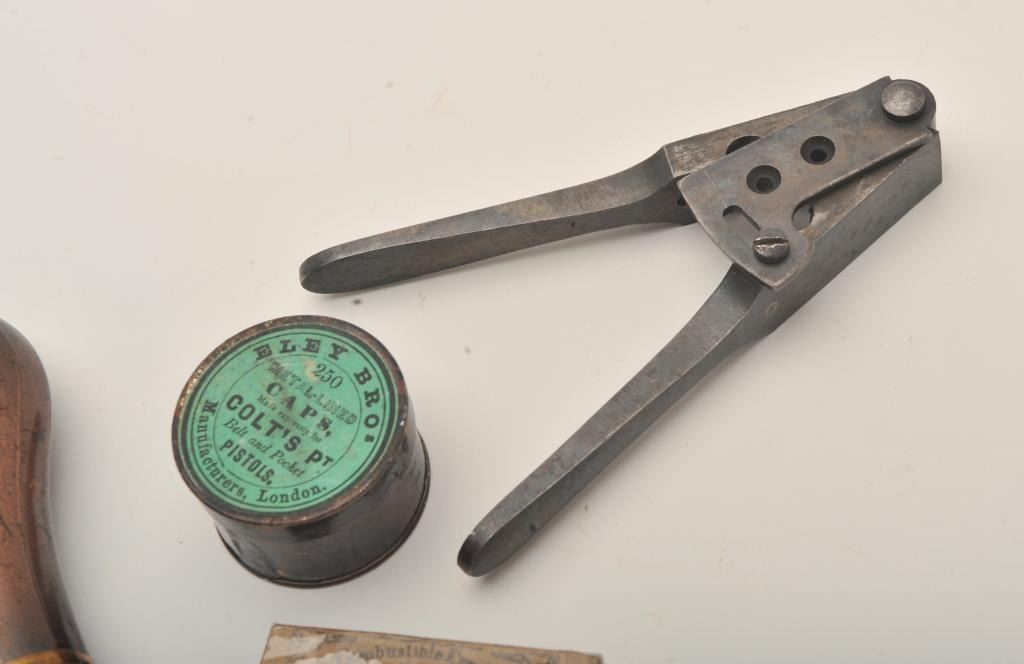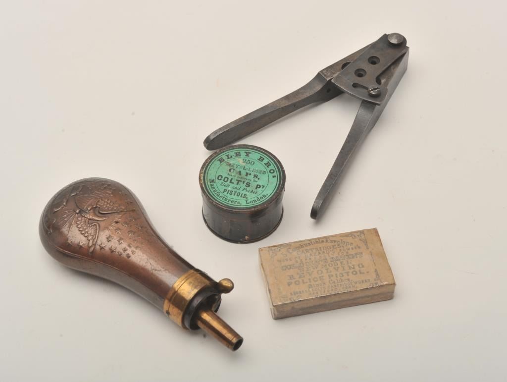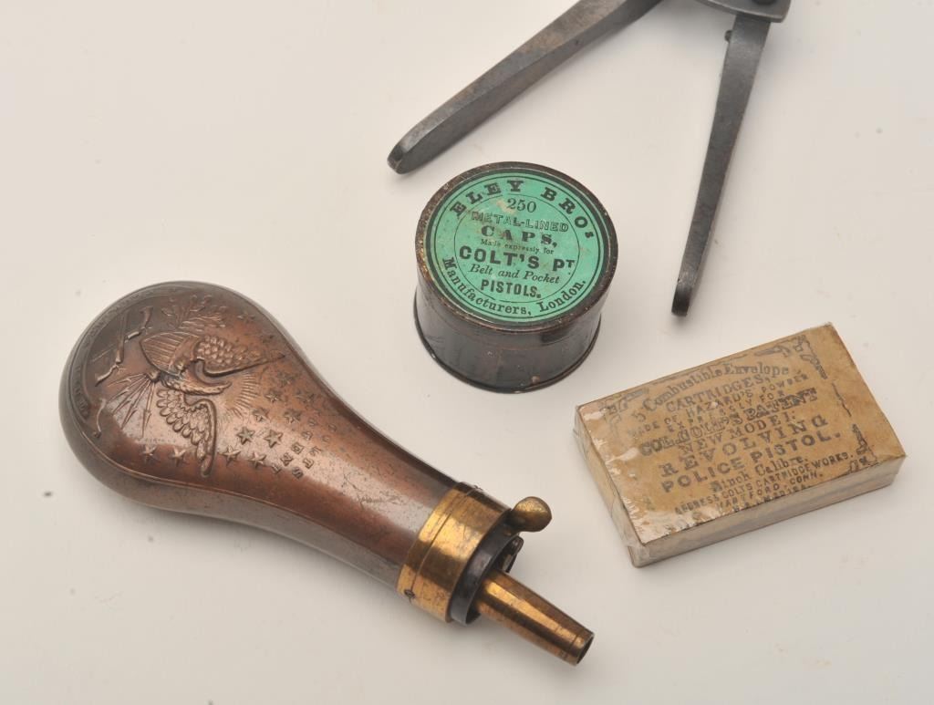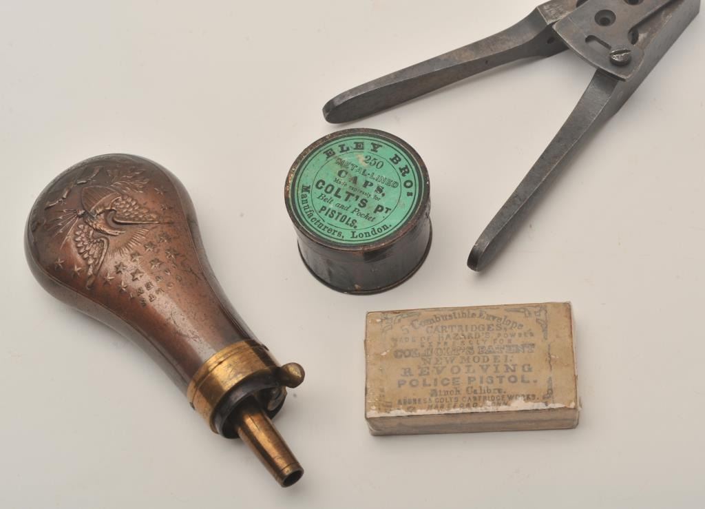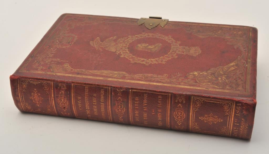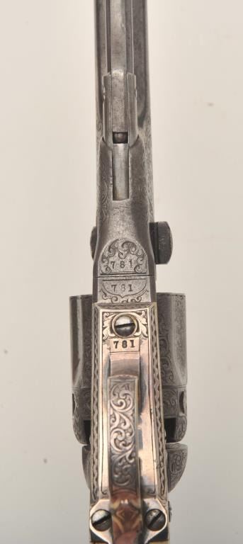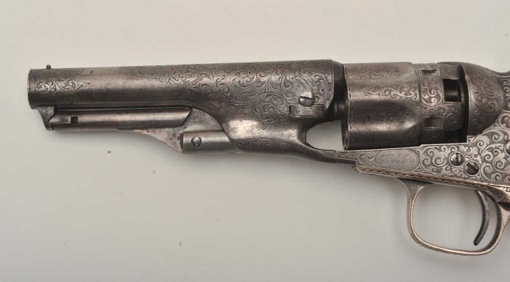 Important Sam Colt Presented 1862 Police to Mrs. John B. Floyd in its original book case. An iconic and well known pistol most recently illustrated in the Colt Engraving book (Full page #182). Only 1 of 2 knownpresentations made by Colt to ladies, the other to Mrs. Cobb. J.B. Floyd was Secretary of War during the Civil War and received a group of presentation Colts from the hands of Gustave Young. This subject Colt showsdeluxe and profuse engraving executed by the hand of the master himself Gustave Young. The scrolls are very intricate with small heads, extra coverage and hand cut barrel address and Colt’s Patent. The pistol shows originalfine checkered ivory grips with super deluxe checkered bottoms. S/N 781 and all matching. This pistol is in very good condition showing most silver on the straps and traces of finish on the balance of metal surfaces. Theoriginal bookcase is inscribed on spine with matching inscription. Only about a dozen original book cases are known to Colt Collectors in all of the models of percussions and approximately 5 in 1862