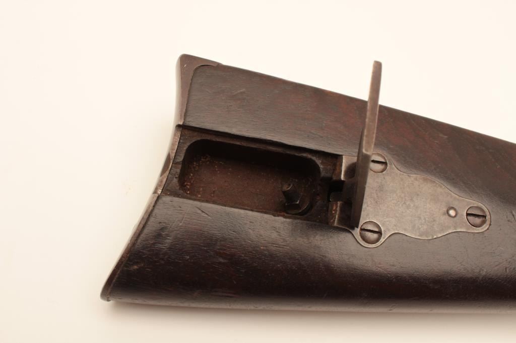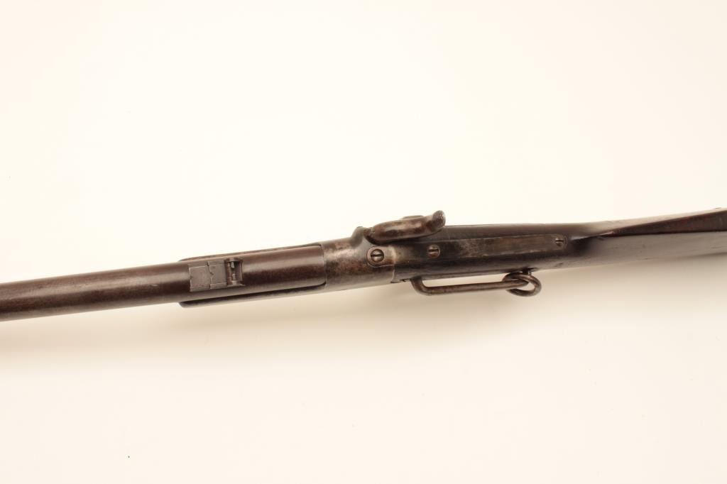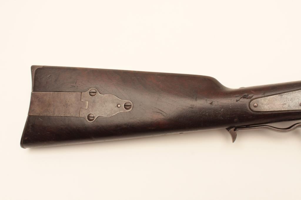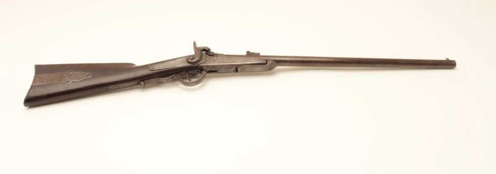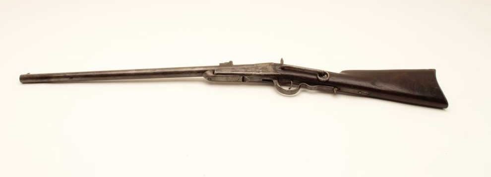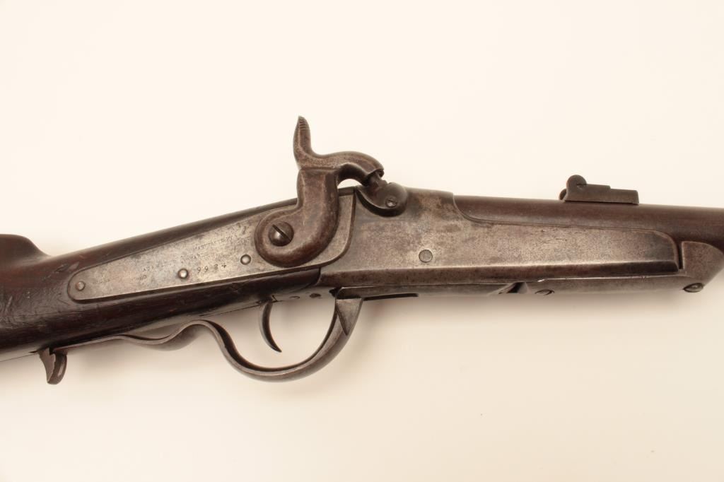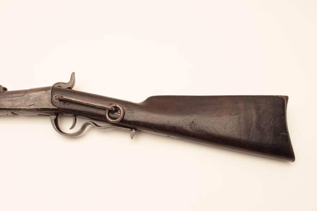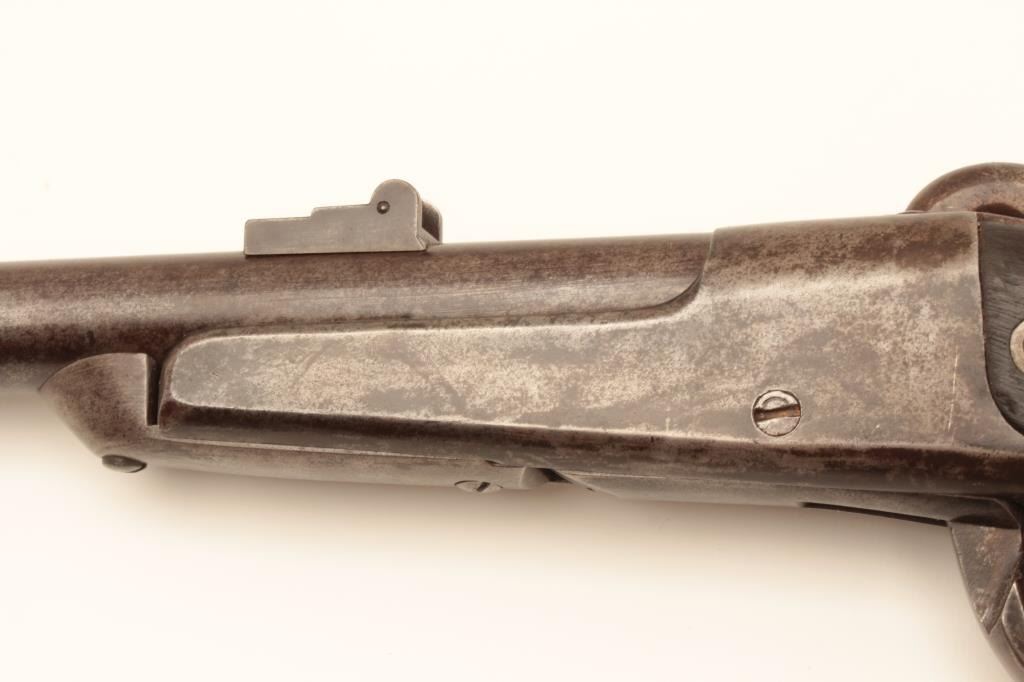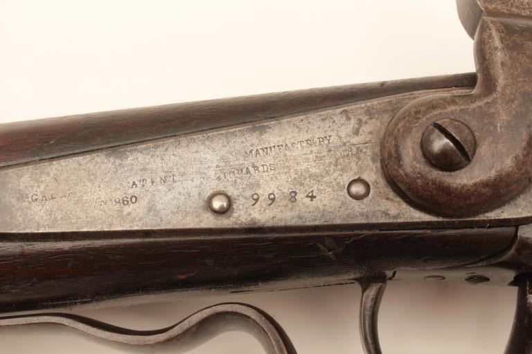 Gallager Model 1863 Saddle Ring breech loading percussion carbine, .50 caliber, Serial #9984. The carbine is in good overall condition with a 22” round barrel. The barrel has gone to a mottled silver/brownpatina with areas of light surface erosion. The receiver has gone to a toned silver patina with the saddle ring intact and all matching visible serial numbers. The smooth wood stock is in good condition showingmoderate use with mars and compressions. The butt stock features an iron patch box with an extra nipple and ends with a smooth steel butt plate. The bore in fair, the action is crisp and the markings are sharp on thisCivil War era carbine. Est.: $800-$1,600. (Antique).