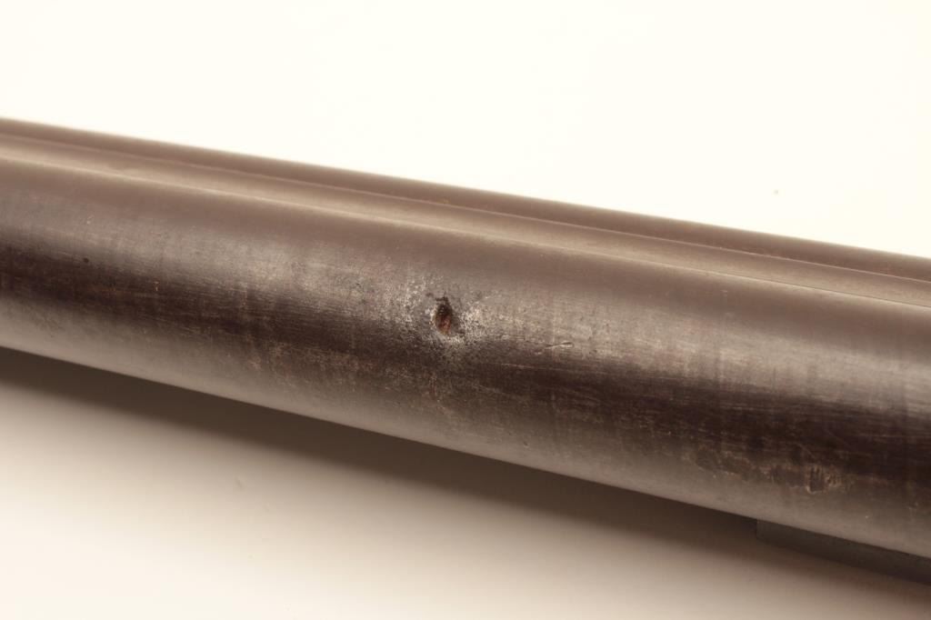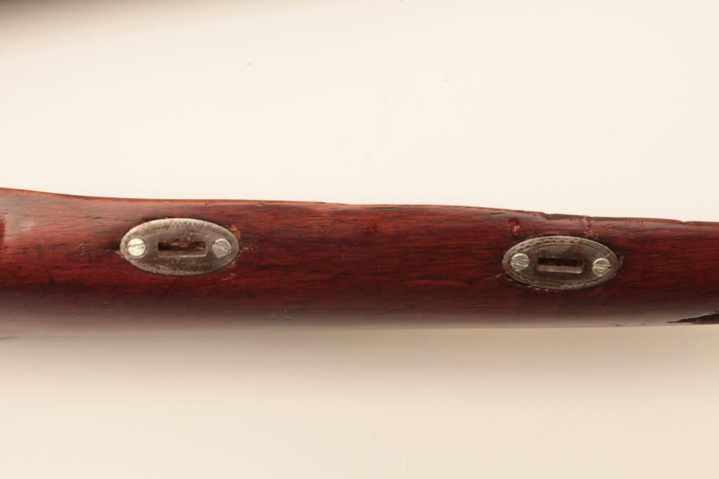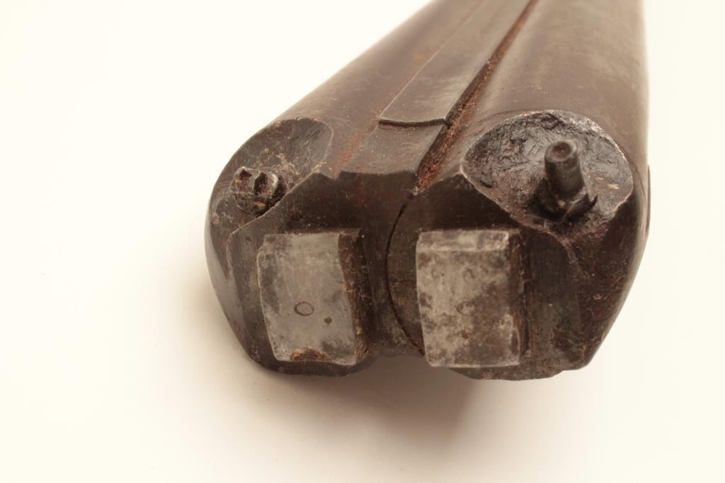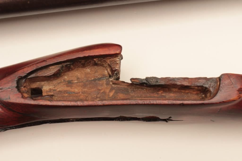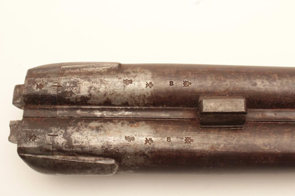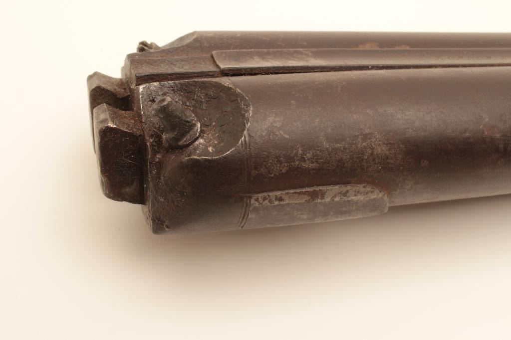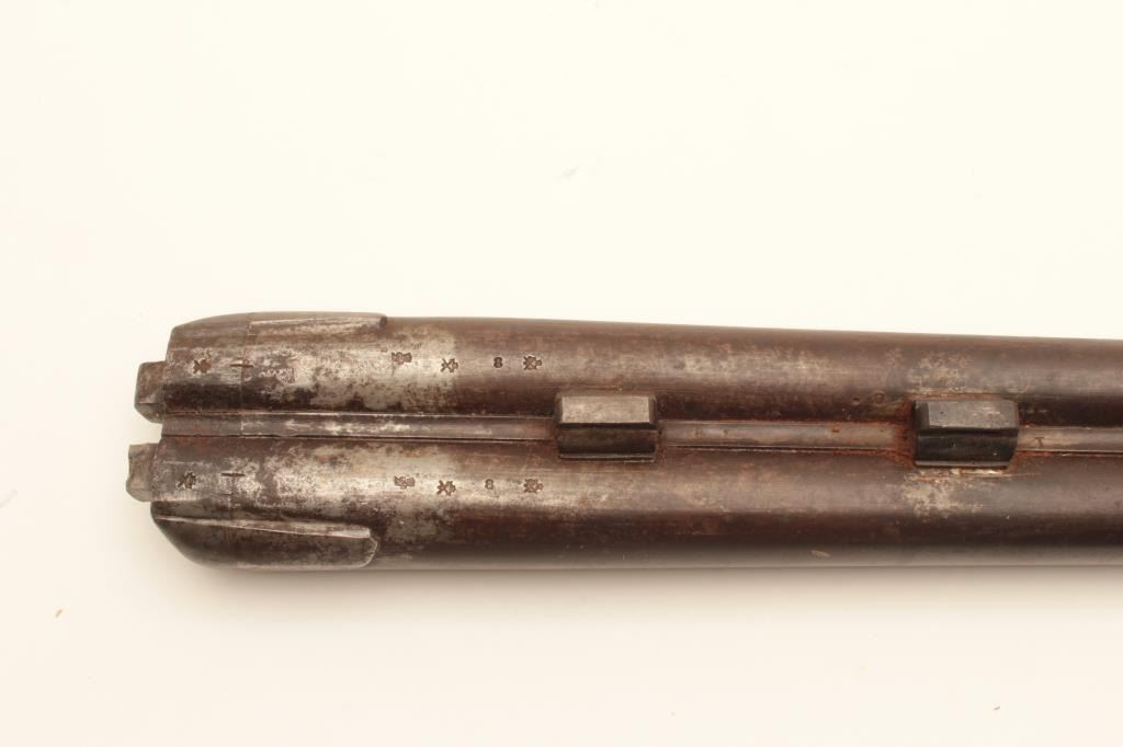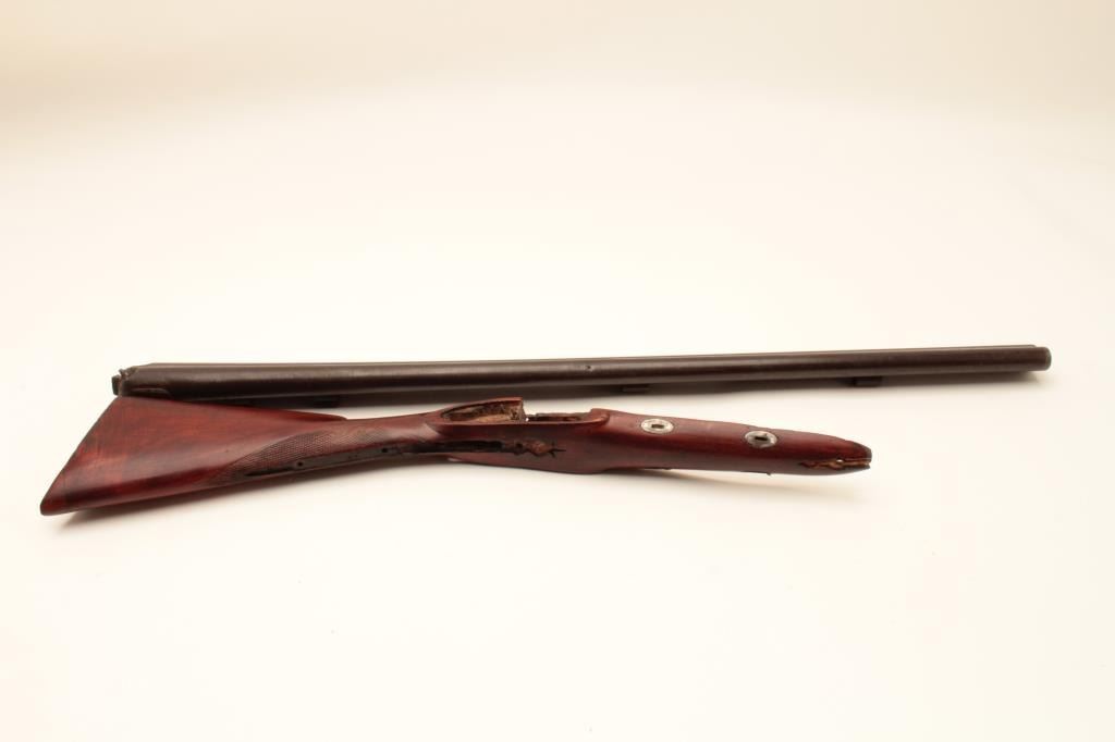 Lot of shotgun parts including a stock and percussion double barrels. The 30” set of 8 gauge barrels is marked, “LONDON FINE TWIST” and show a heavy dark brown patina with damage to one of the nipples. The checkeredwood stock shows repairs and is missing a butt plate. Est.: $50-$100.