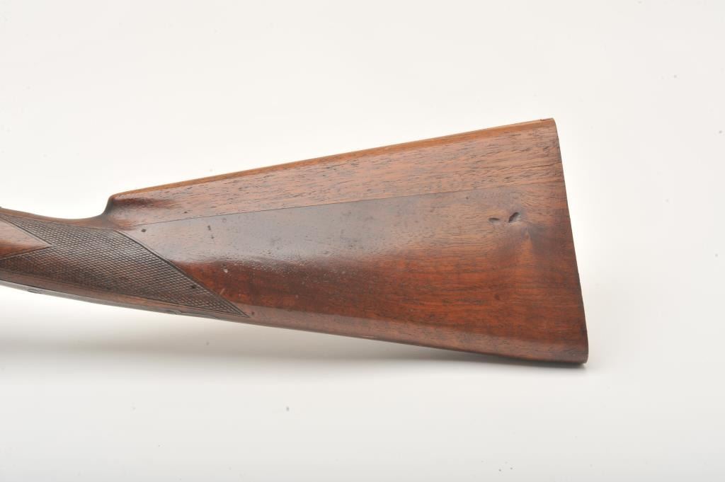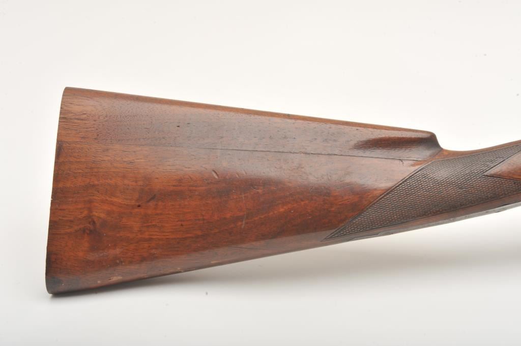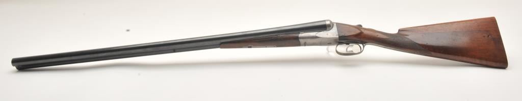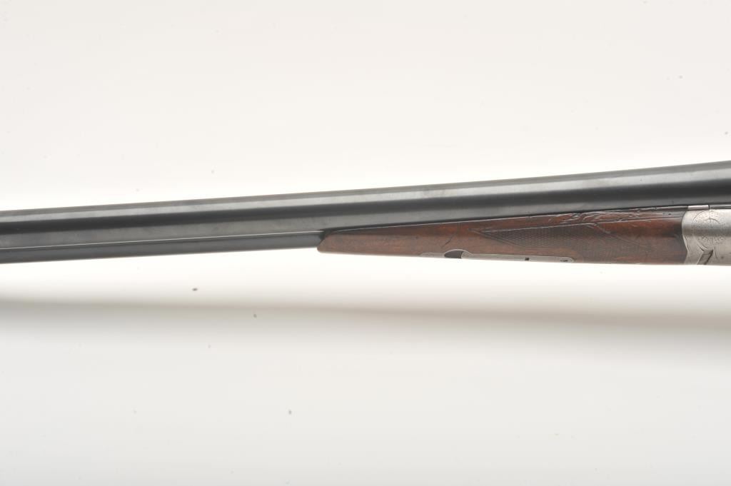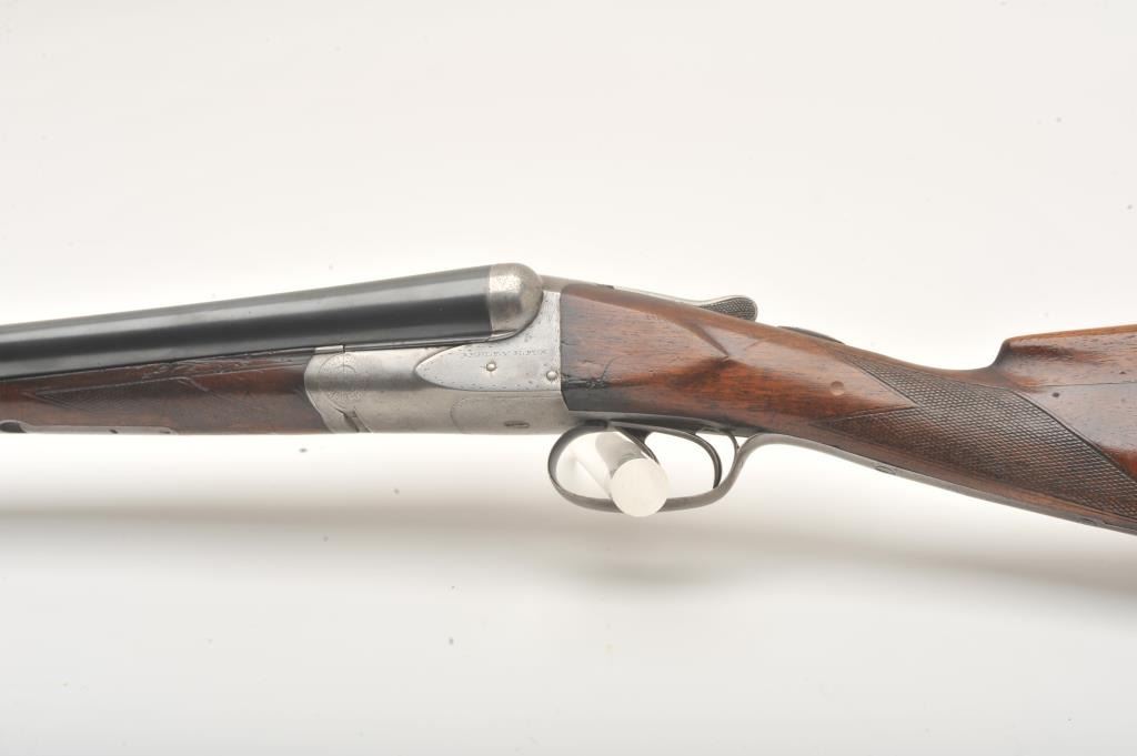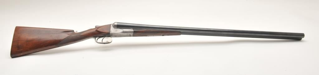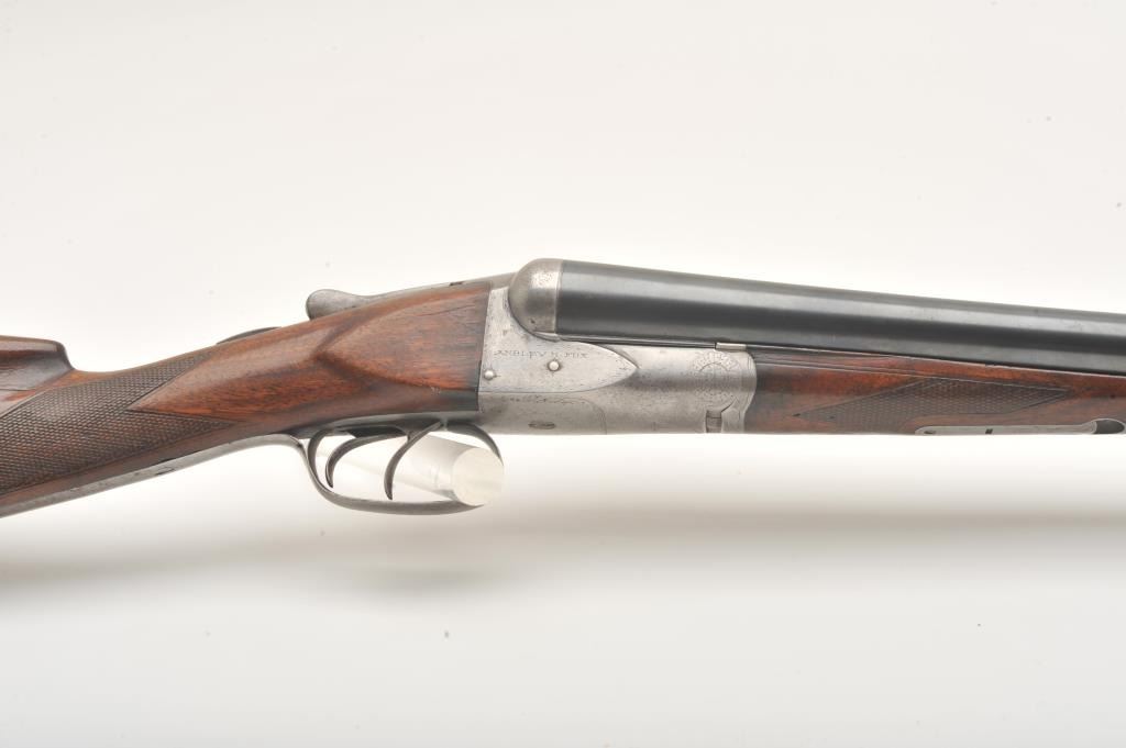 A.H. Fox side by side shotgun, 12 gauge, Serial #11520. The shotgun is in very good overall condition with 30” barrels with a full-length filed rib and a steel bead front sight. The barrels retain the majority oftheir blue finish with wear at the muzzle and light handling marks. The receiver, tang and double triggers are all silver with light scroll engraving and a tang mounted safety. The checkered wood stocks are in goodcondition with a splinter fore end and small mars and compressions from carry and use. The butt stock has been shortened and left without a pad or butt plate, as such the LOP is 13 ¾”. The bores are good, the actioncrisp and markings are sharp. Est.: $250-$500. (C+R).