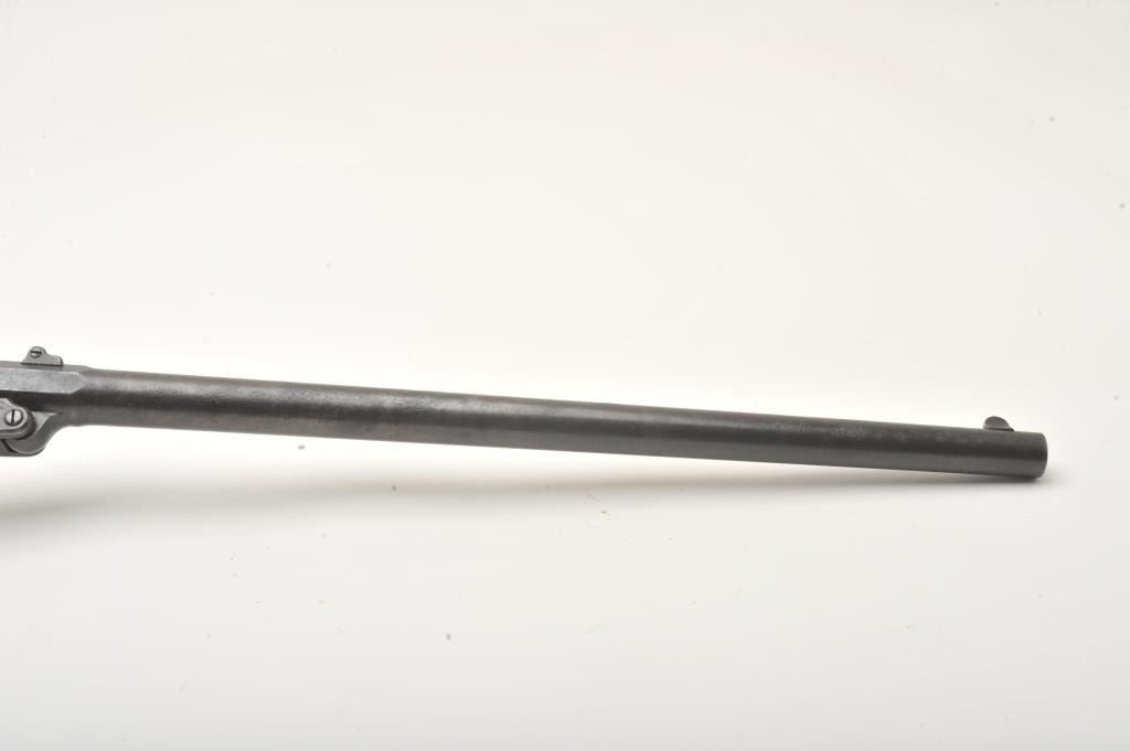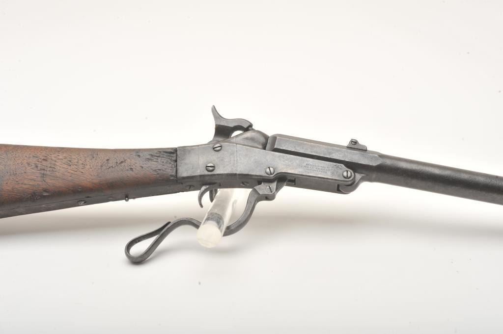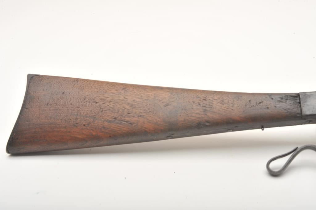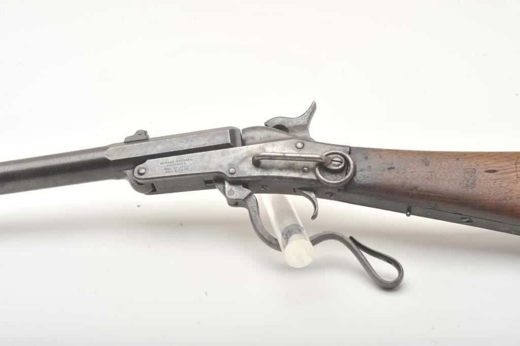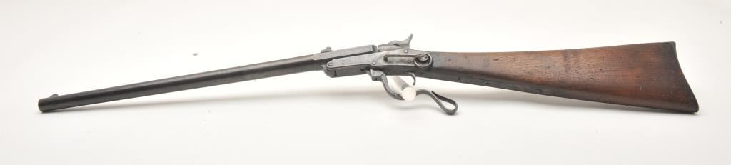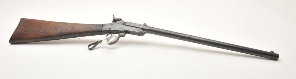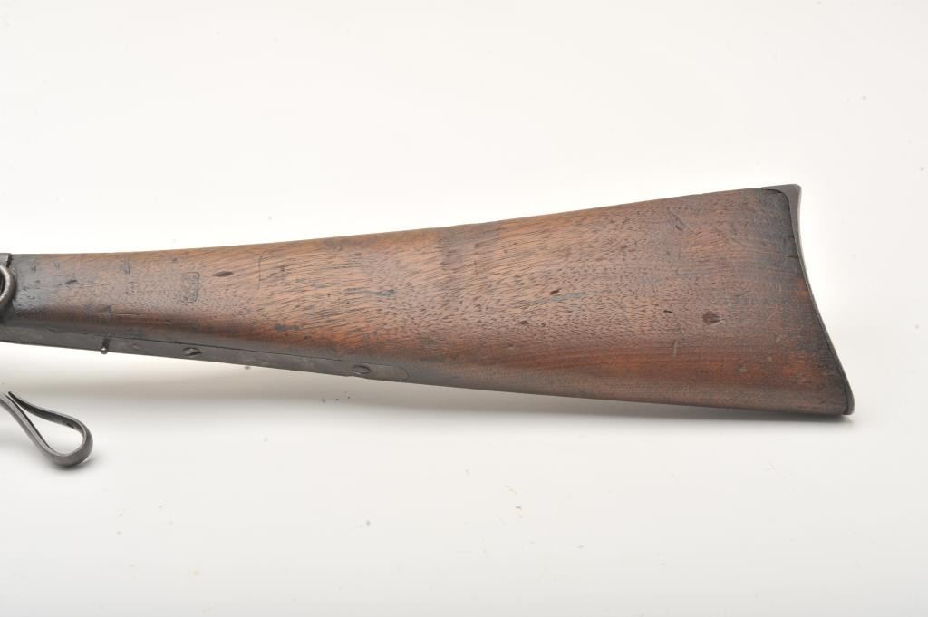 Maynard Model 1863 Saddle Ring percussion carbine, .50 caliber, Serial #711. The carbine is in good overall condition with a 20” round barrel. The barrel has gone to a plum brown patina with light to moderatesurface erosion and pin prick pitting in areas. The receiver has gone to a mottled grey patina with the saddle ring intact. The smooth wood stock is in fair condition showing heavy use with mars and dents, lossof wood at the tang and the smooth steel butt plate a bit proud at the toe. The stock has a nice cartouche behind the tang on the left side. The bore in fair, the action functions and the markings are sharp on thisCivil War era carbine. Est.: $600-$1,200. (Antique).