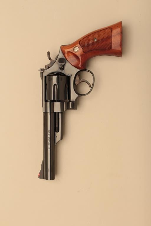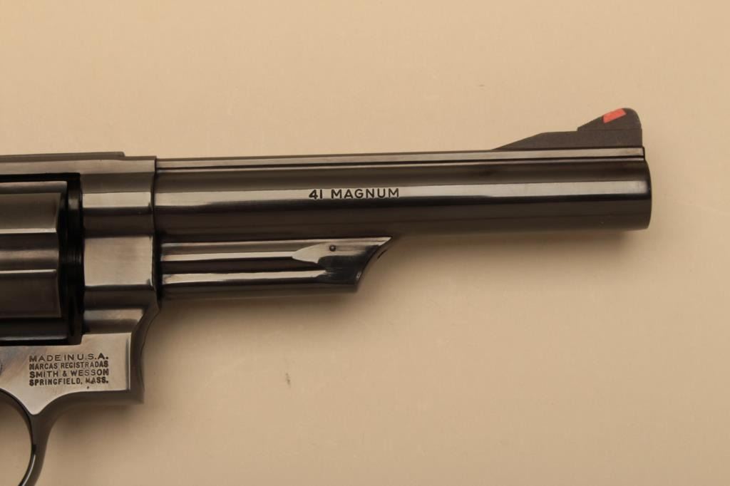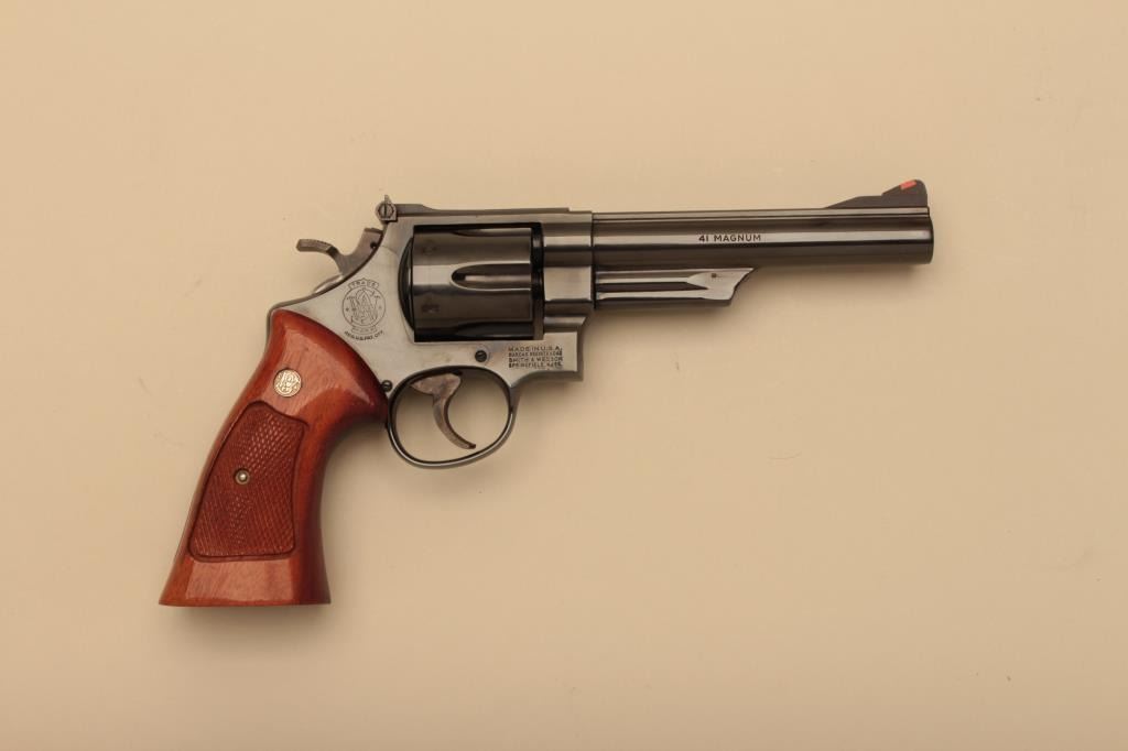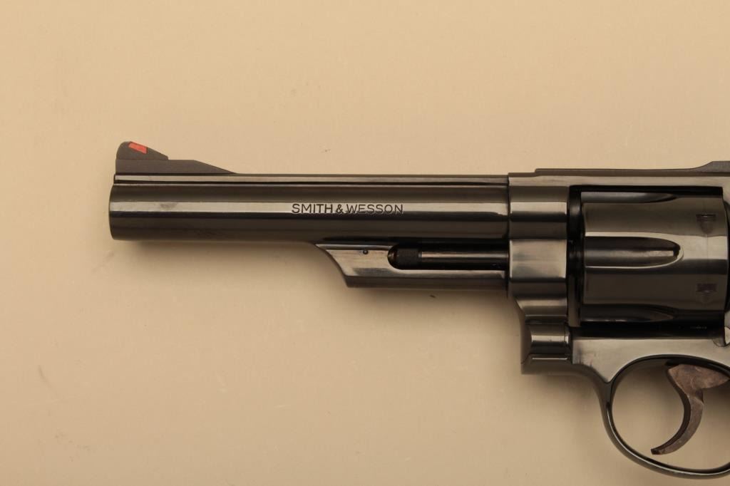 Smith & Wesson Model 57 revolver, .41 Magnum caliber, Serial #33134. The pistol is in fine overall condition with a 6” barrel with a red ramp front and adjustable rear sights. The pistol retains nearly all of its bluefinish with light handling marks and a faint drag line on the cylinder. The hammer and trigger show beautiful muted case hardening. The checkered wood medallion grips are in good condition with sharp checkering and asmall chip missing at the base of the grip. The bore is very good, the action crisp and markings are sharp on this desirable, no dash Model 57. Est.: $750-$1,500. (Modern).