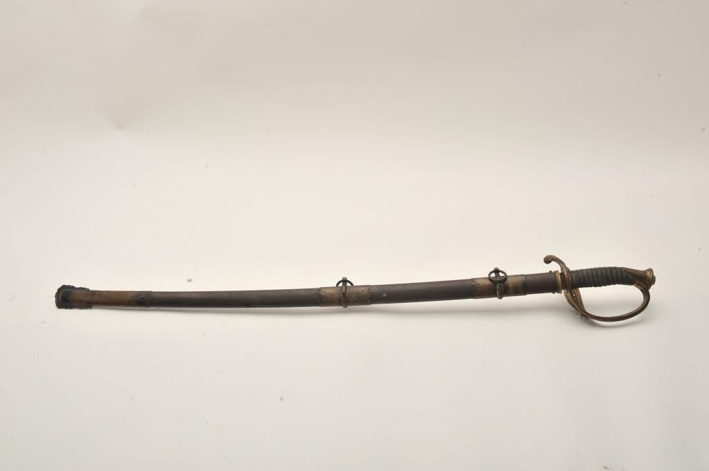 Important Civil War Officer’s Model 1850 sword and brass mounted metal scabbard belonging to our consignor’s Great Grandfather Colonel Ellwood Kirby. The sword and scabbard are un-cleaned with a pleasingdark patina to the scabbard and decorated brass mounts; the blade is in very good + condition with majority of original polish and beautiful spread eagle and U.S. etched panels; the grip shows its wire-wrappedrayskin with the guard and pommel displaying a taffy colored patina that is also un-cleaned. Also accompanying this lot is an original CDV of Colonel Kirby, taken by H. C. Phillips, N.W. corner Ninth and ChestnutStreets, Philadelphia. According to the consignor, Kirby was born in 1830 in Shelltown, New Jersey into a Quaker farming family. At a young age, he emigrated to Missouri. He became a civil engineer with the railroads and served as a civil engineer, bridge builder and draftsman until the spring of 1861. At the beginning of the Civil War he was commissioned as a Major and Adjutant to Governor Hall and was in charge of a